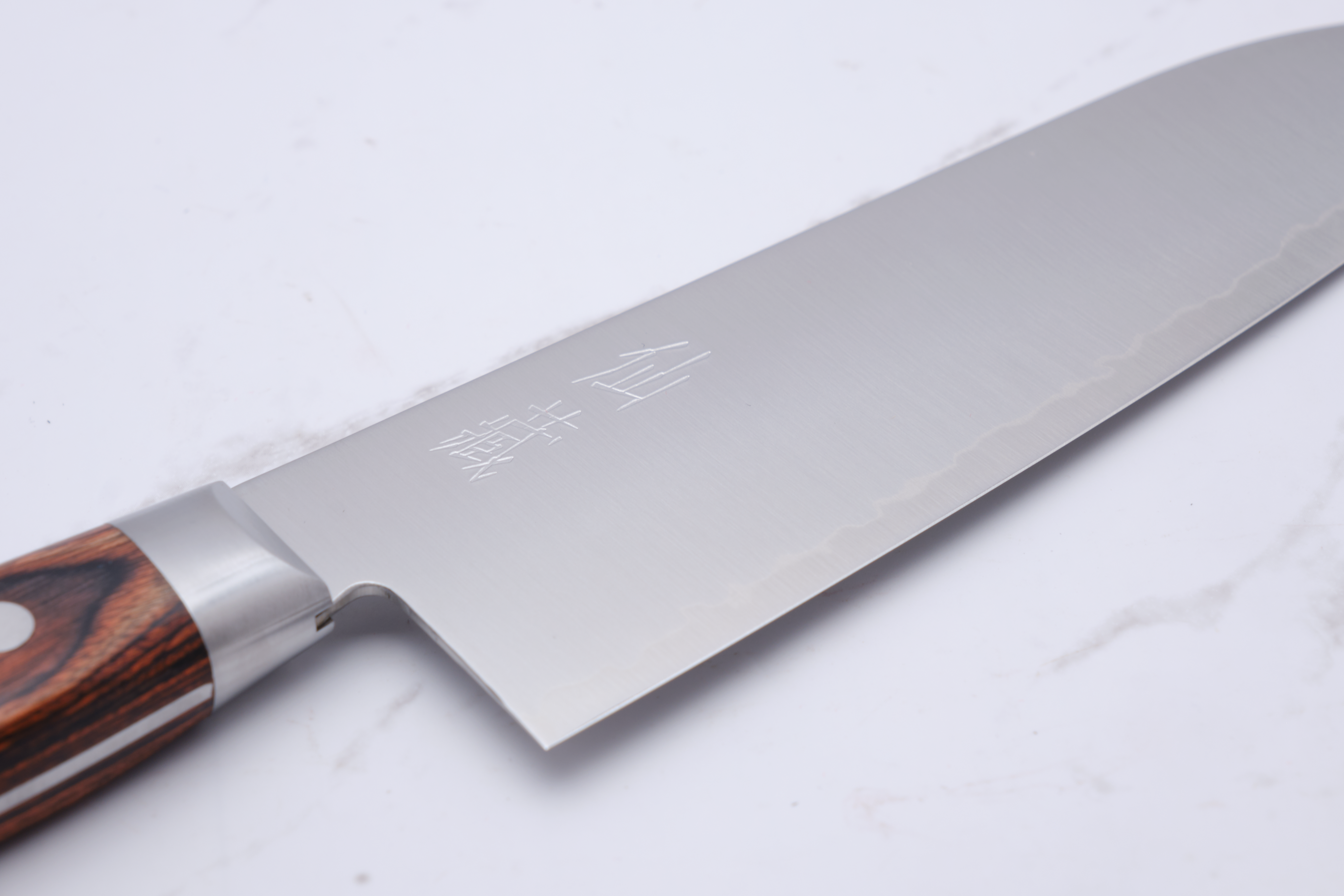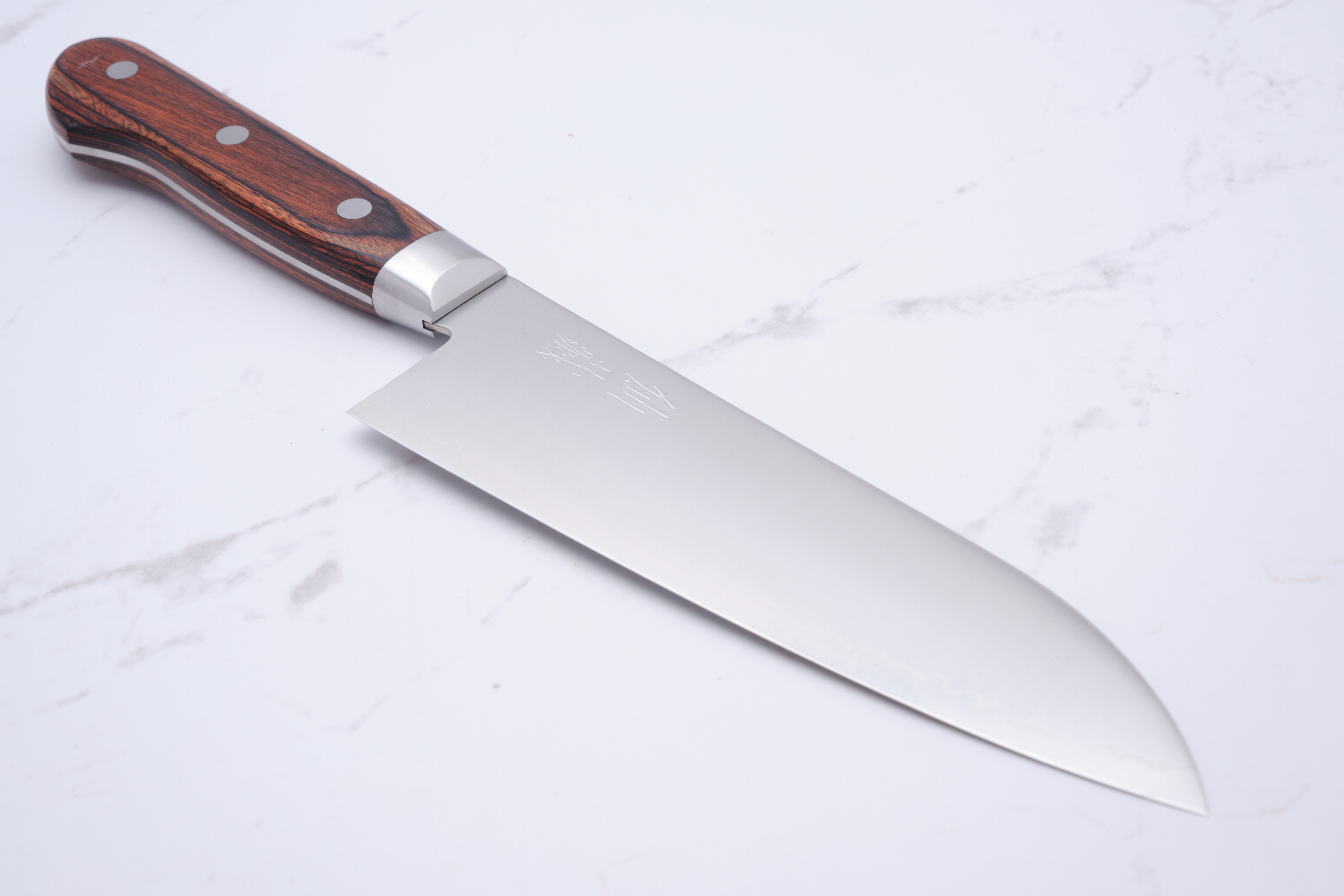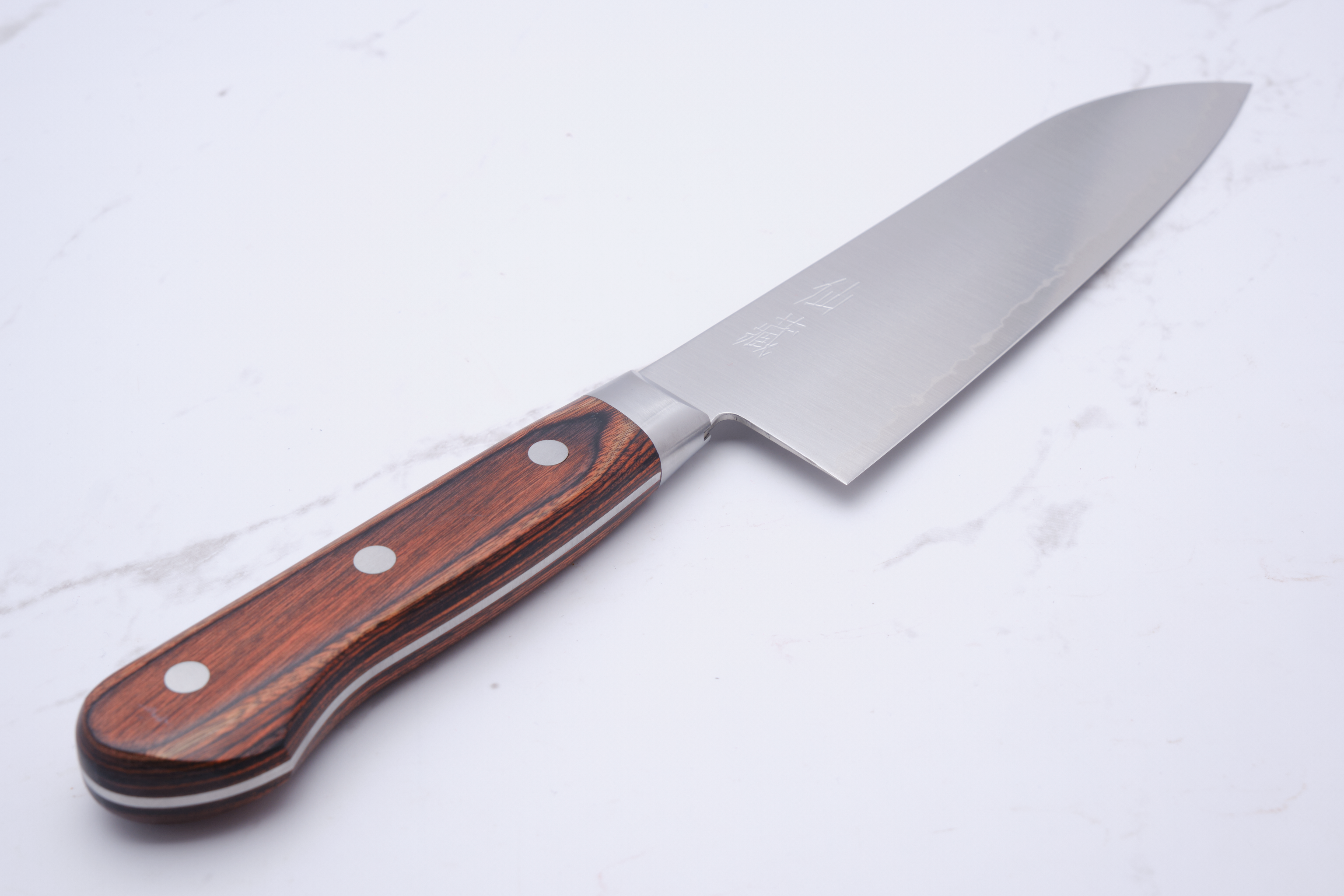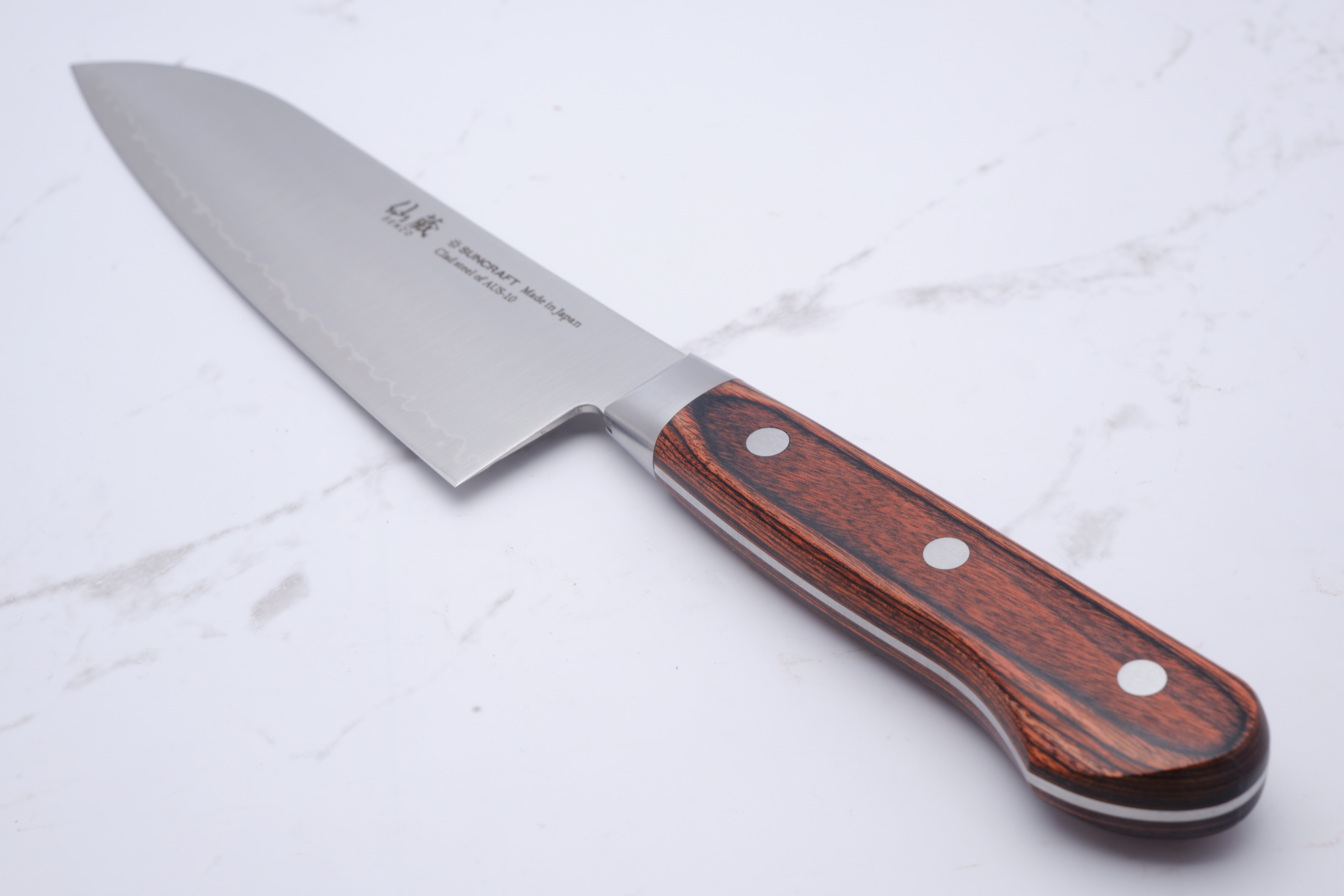 The knife here is a 165mm Santoku made in 3 layers, with AUS 10 in the core and 2 stainless outer layers respectively. AUS 10 is a good stainless steel type that has the characteristics of being easy to maintain, staying sharp for a long time, and easy to sharpen.