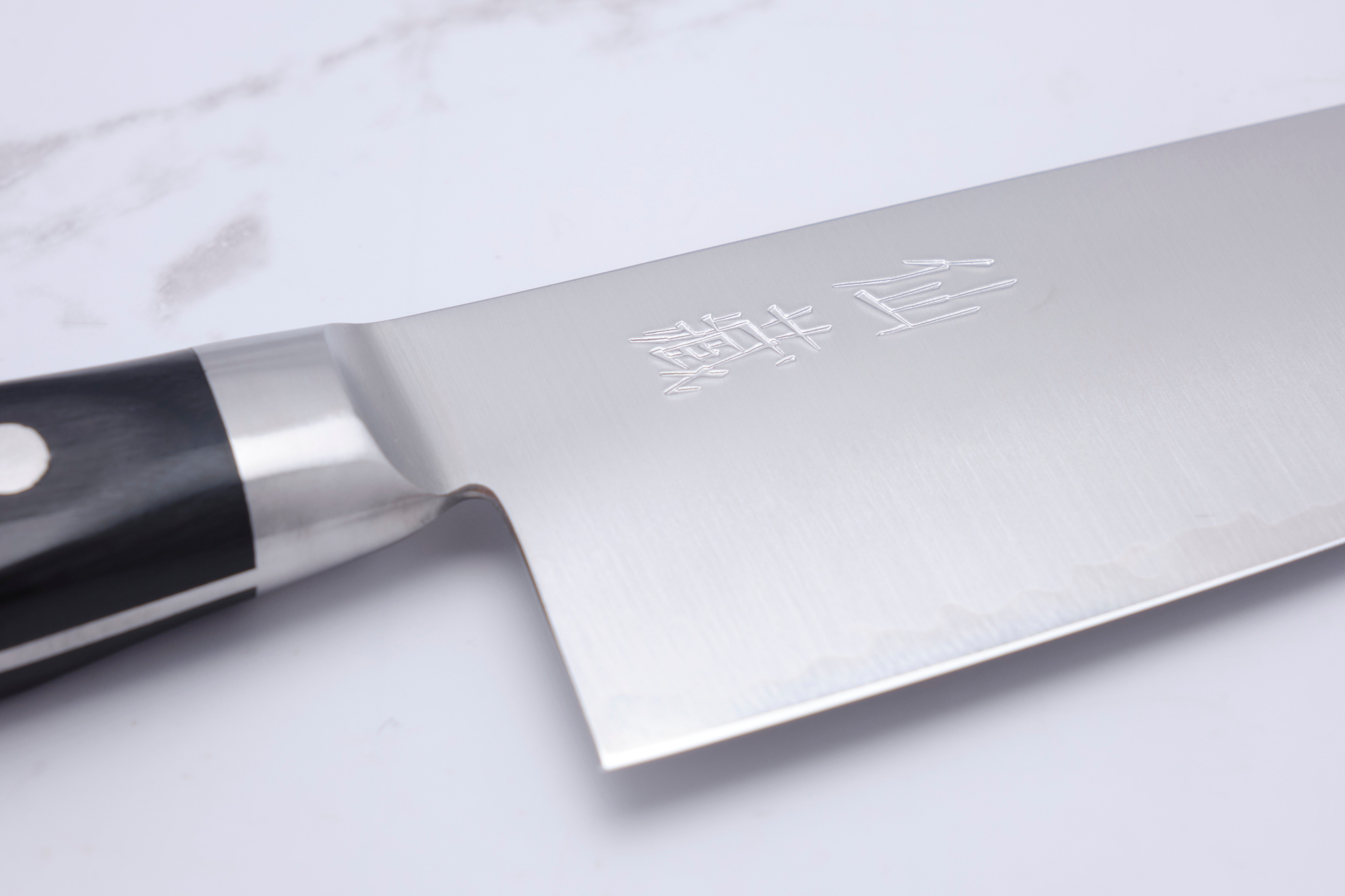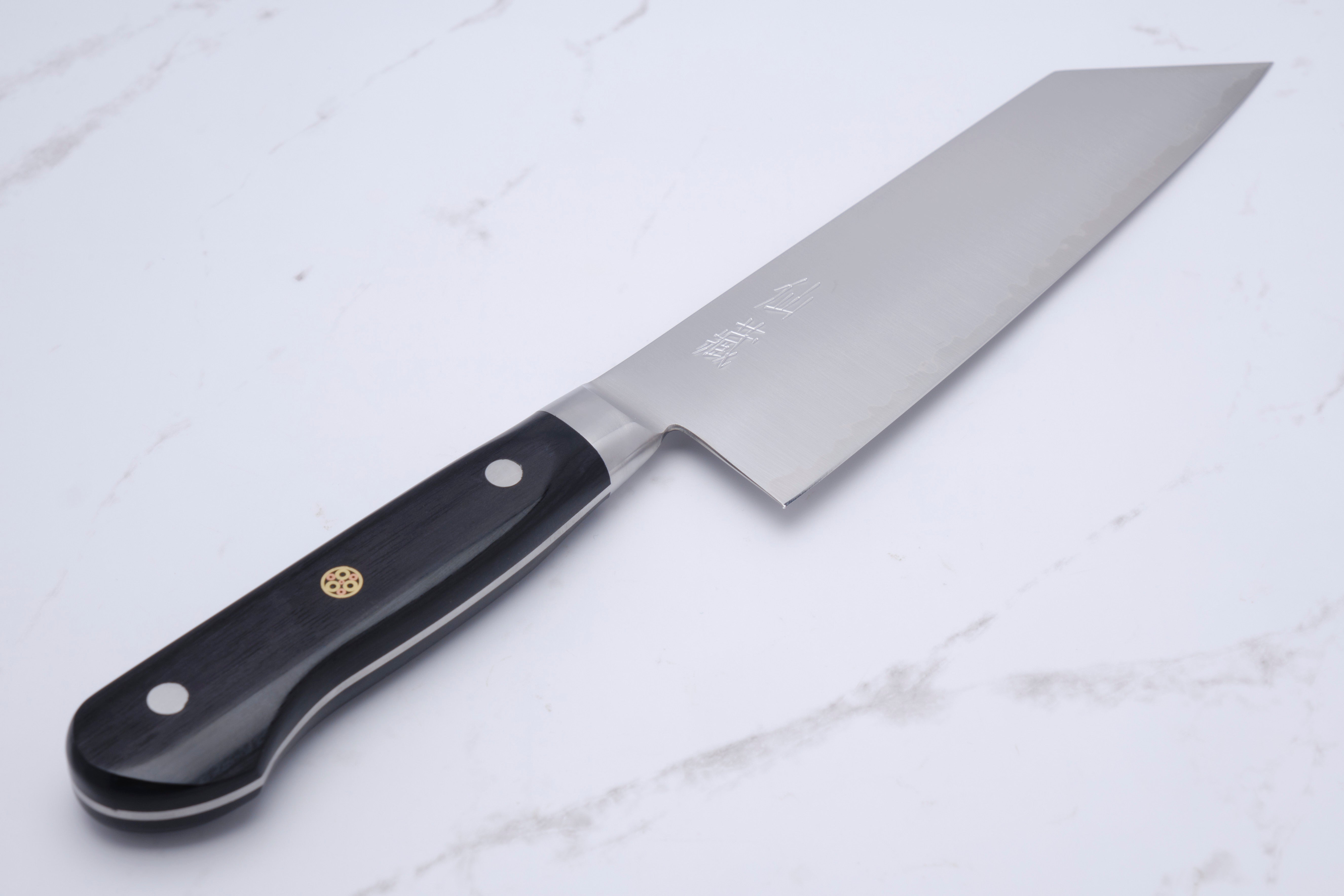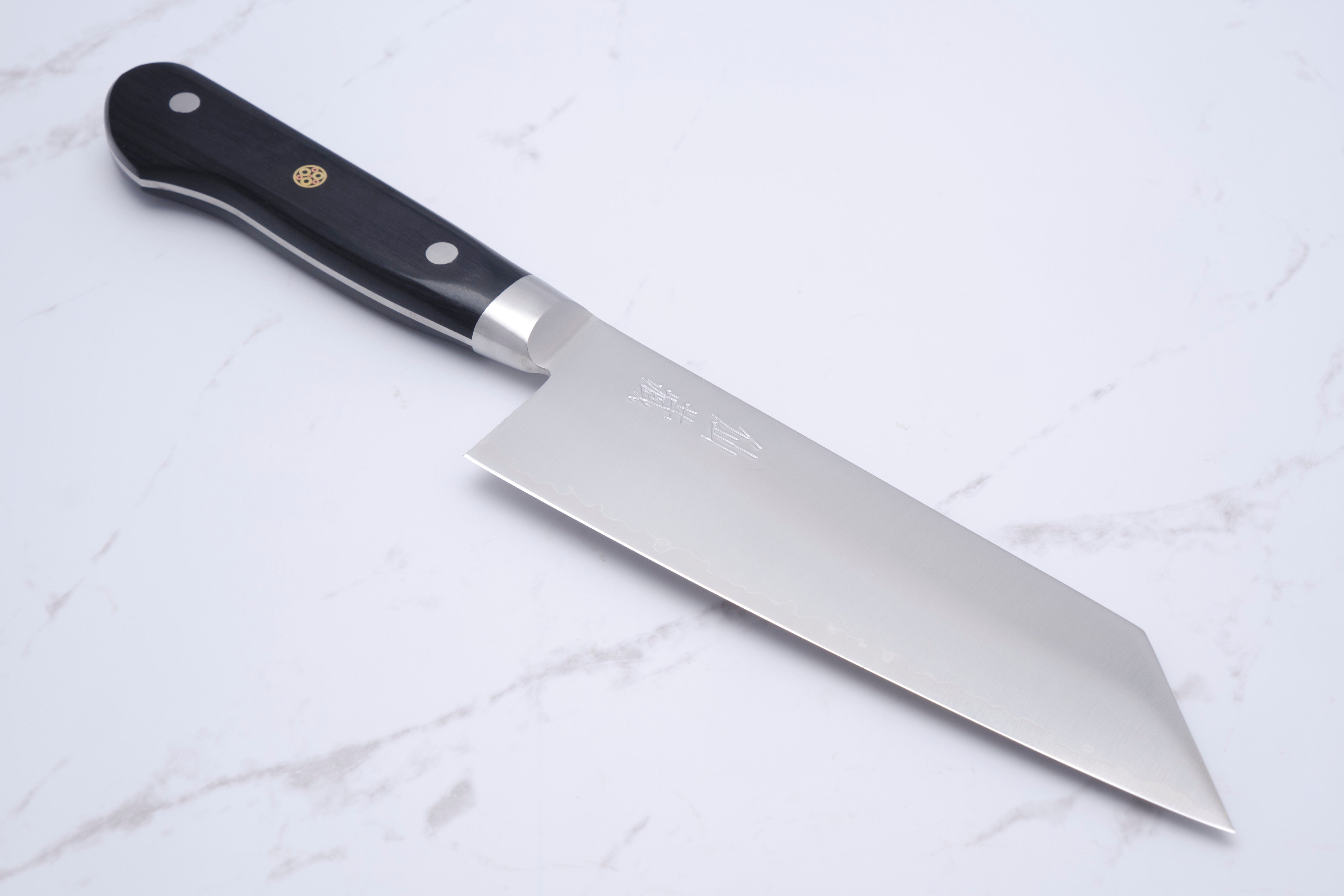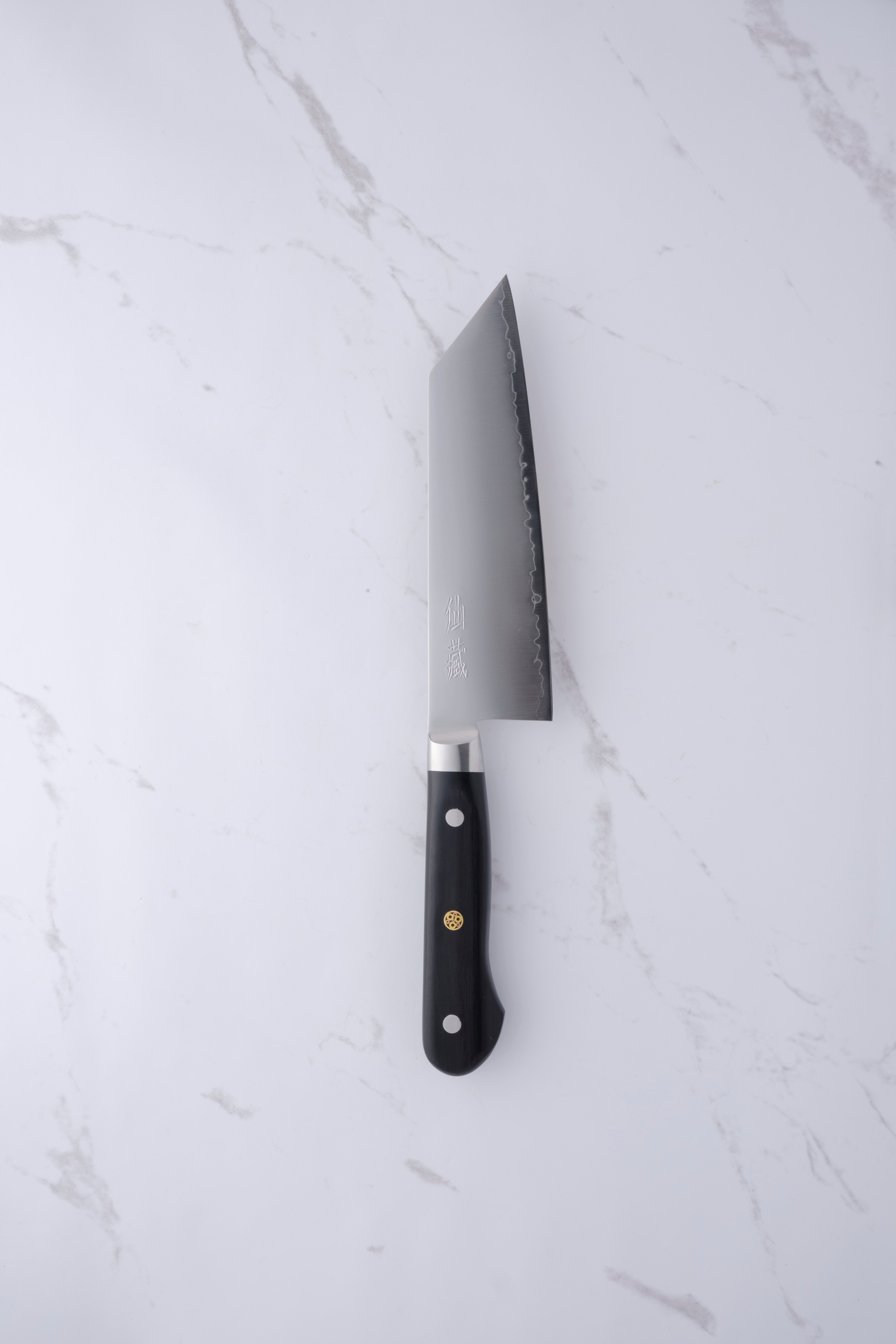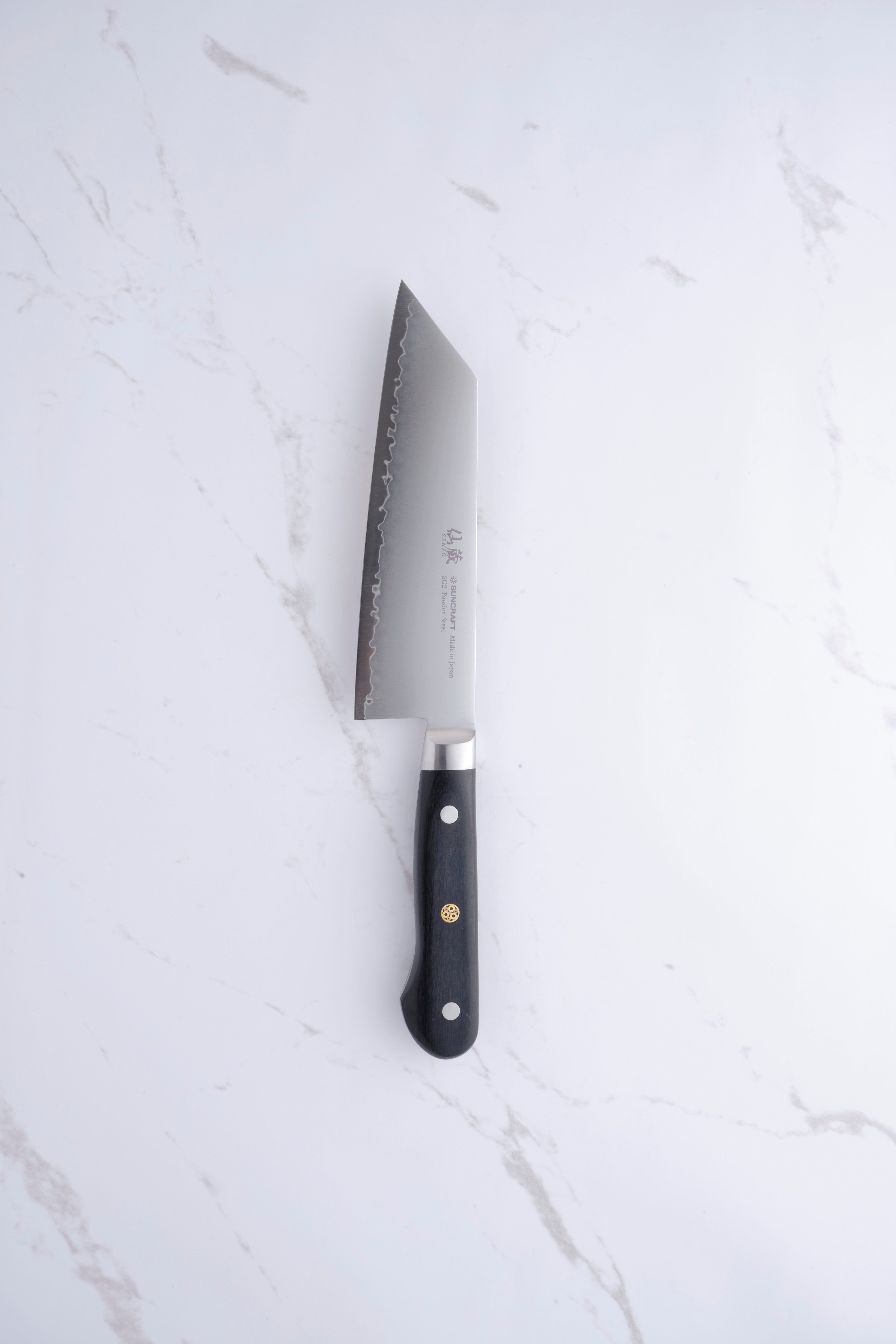 The knife here is a 165mm Bunka made in 3 layers, with respectively SG2 in the core and 2 stainless outer layers. SG2 is a very hard, stainless powder steel type which has the characteristics of being very sharp and holding the egg for a long time.