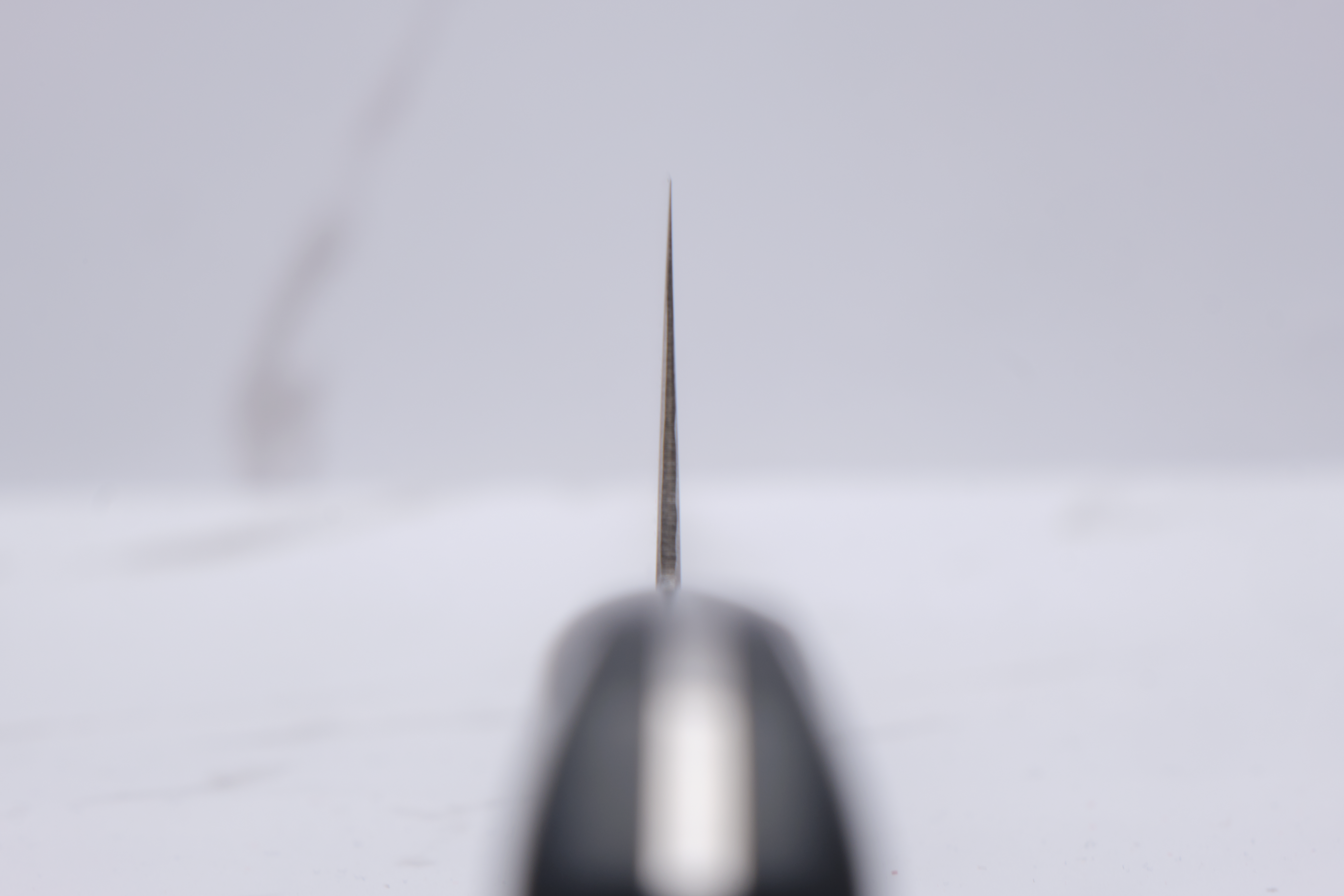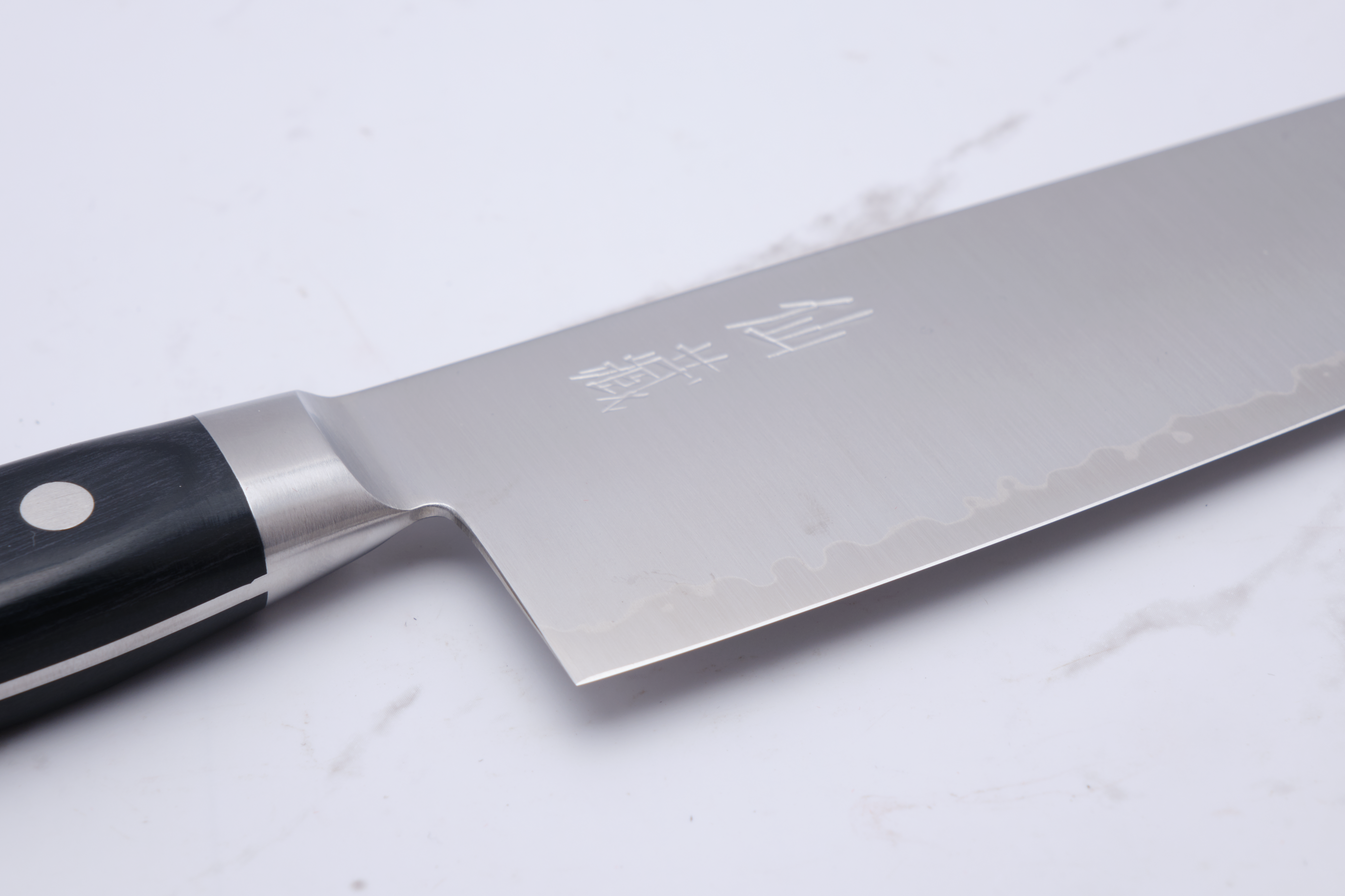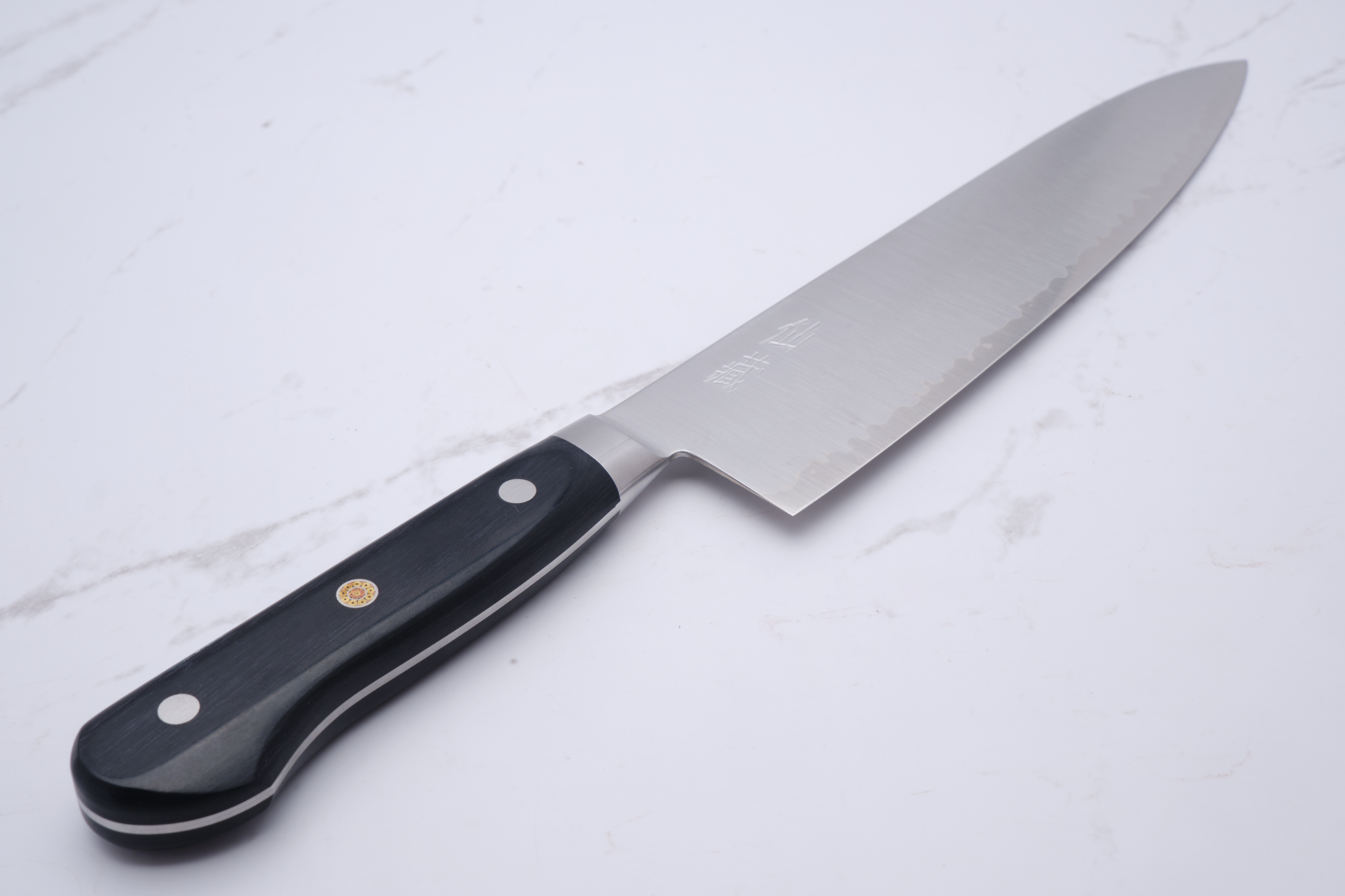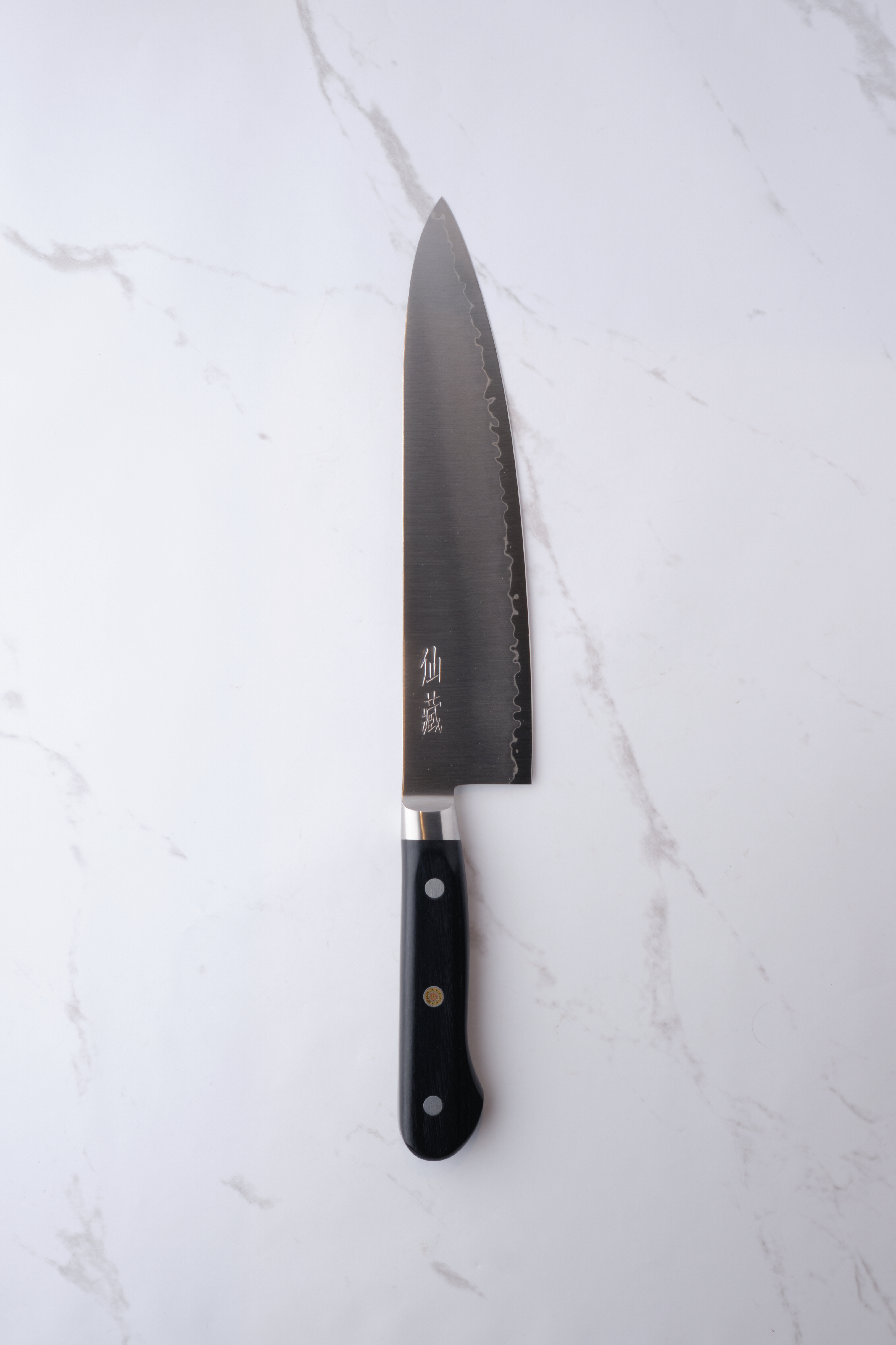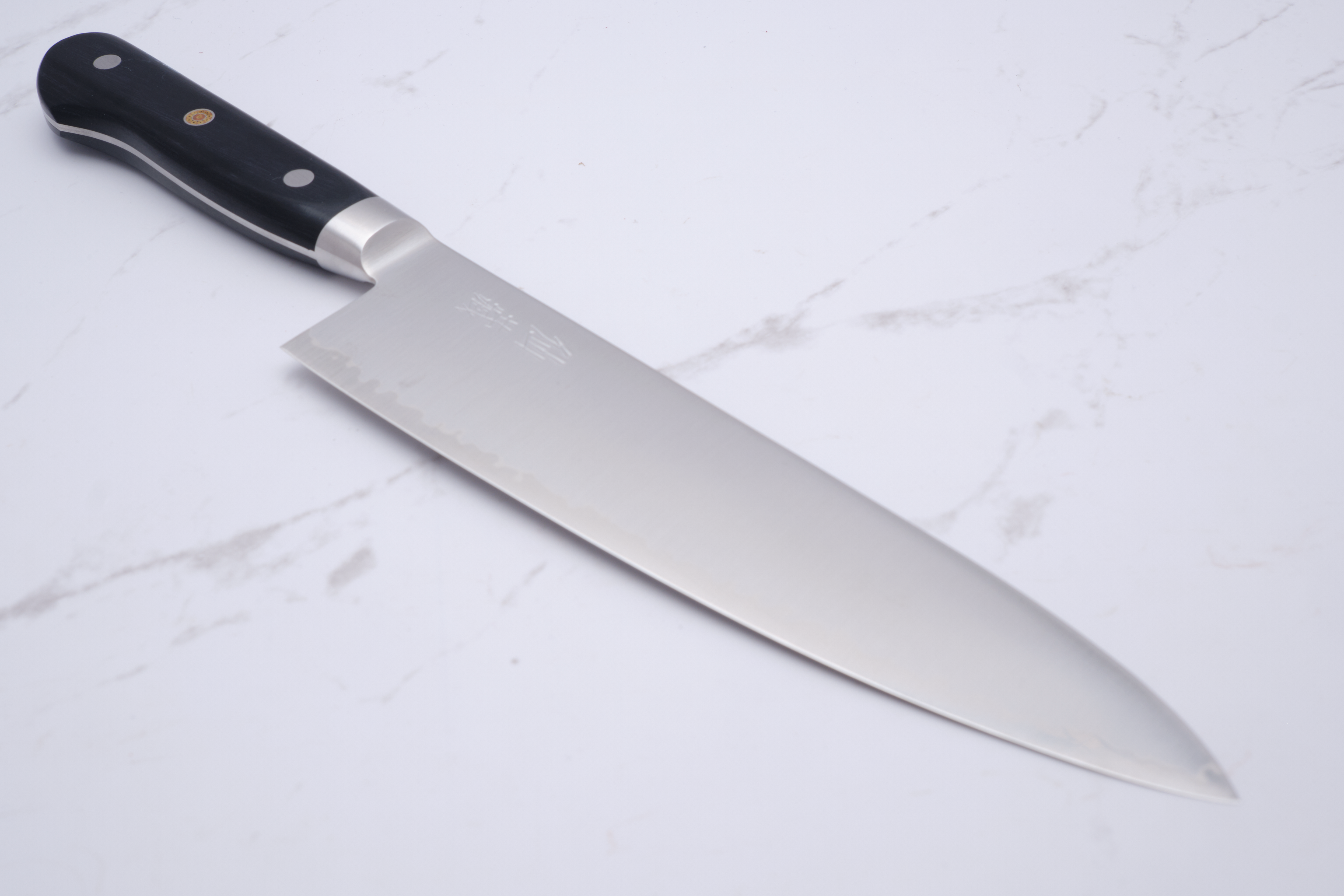 The knife here is a 210mm Gyuto made in 3 layers, with respectively SG2 in the core and 2 stainless outer layers. SG2 is a very hard, stainless powder steel type which has the characteristics of being very sharp and holding the egg for a long time.