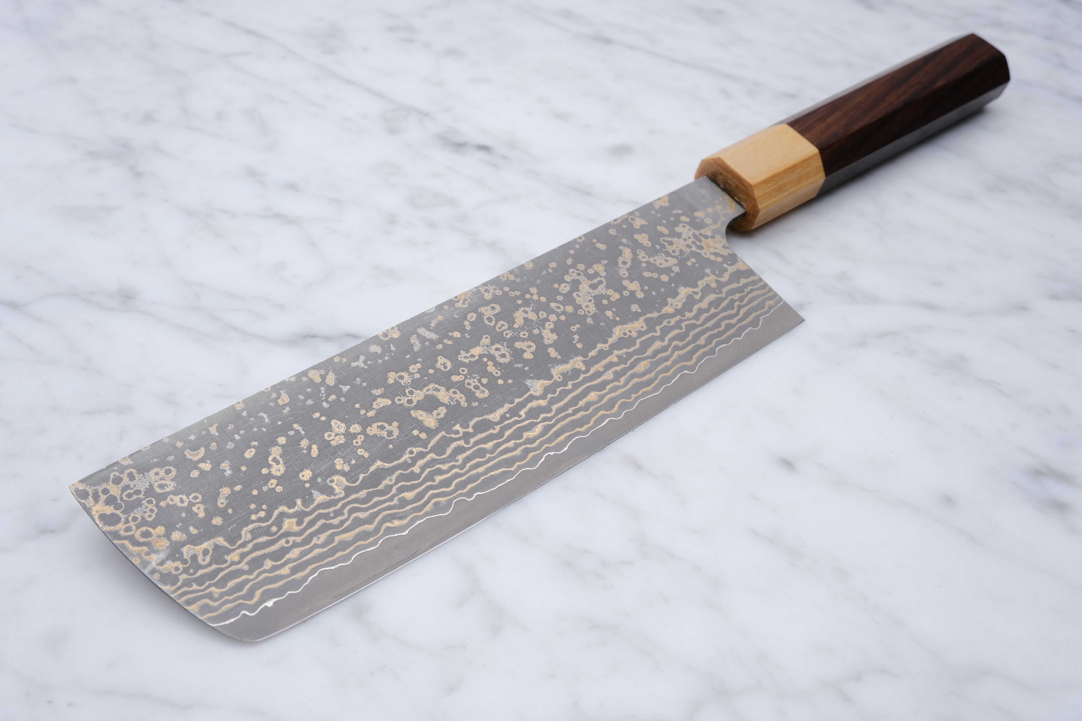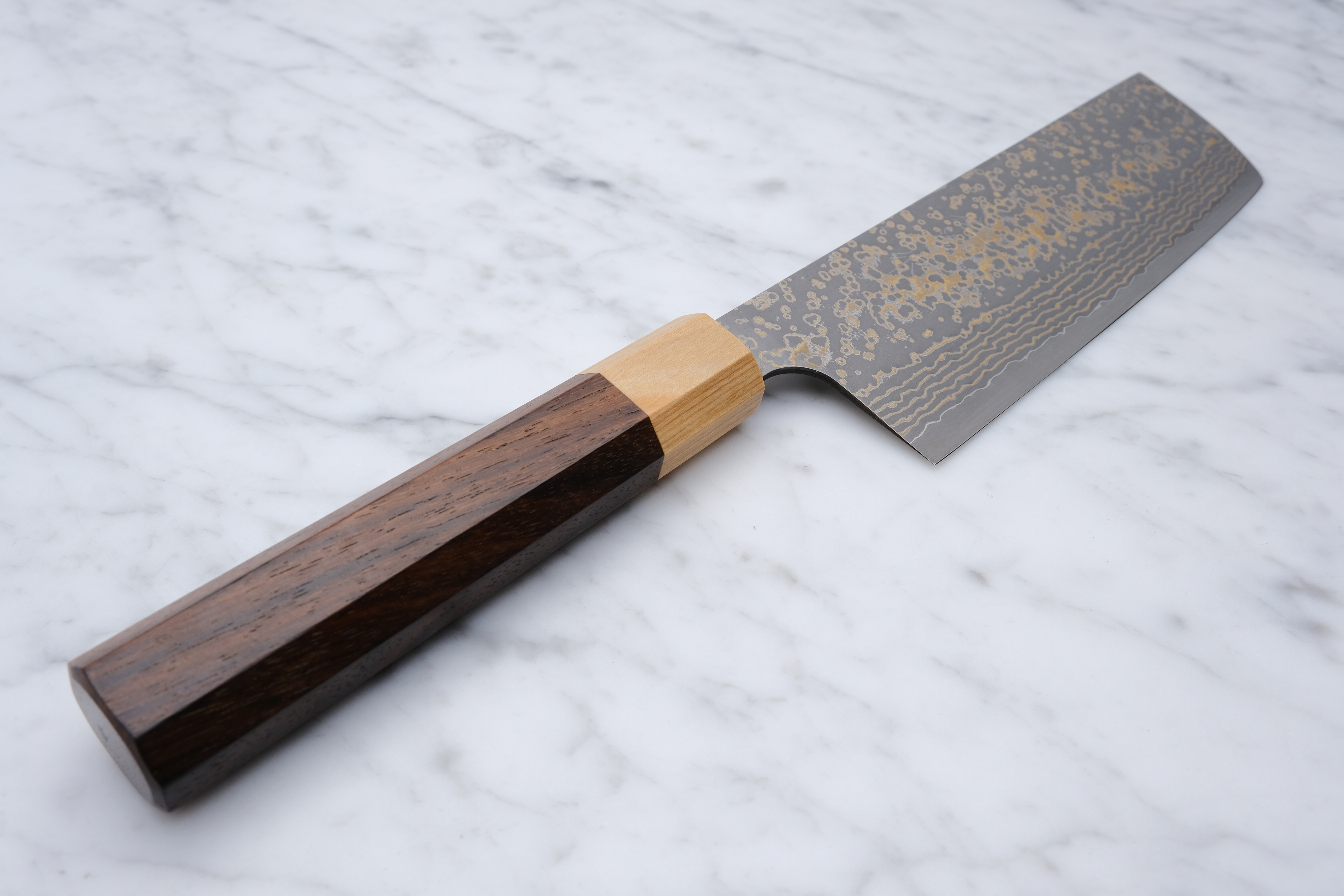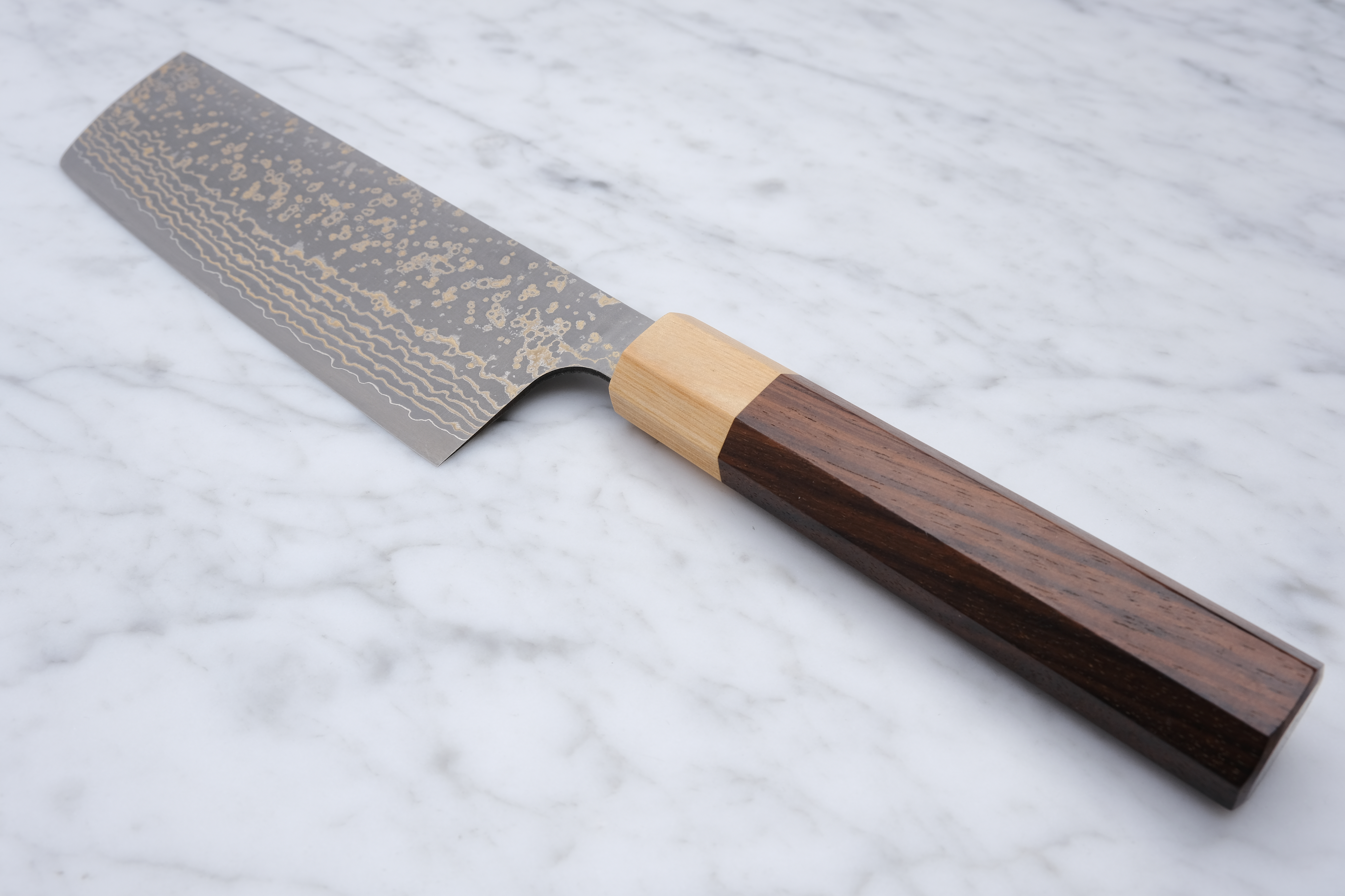 This 165 mm nakiri is from his 'Gold' series, and is made with VG-10 core steel and finished with a stunning copper damask.