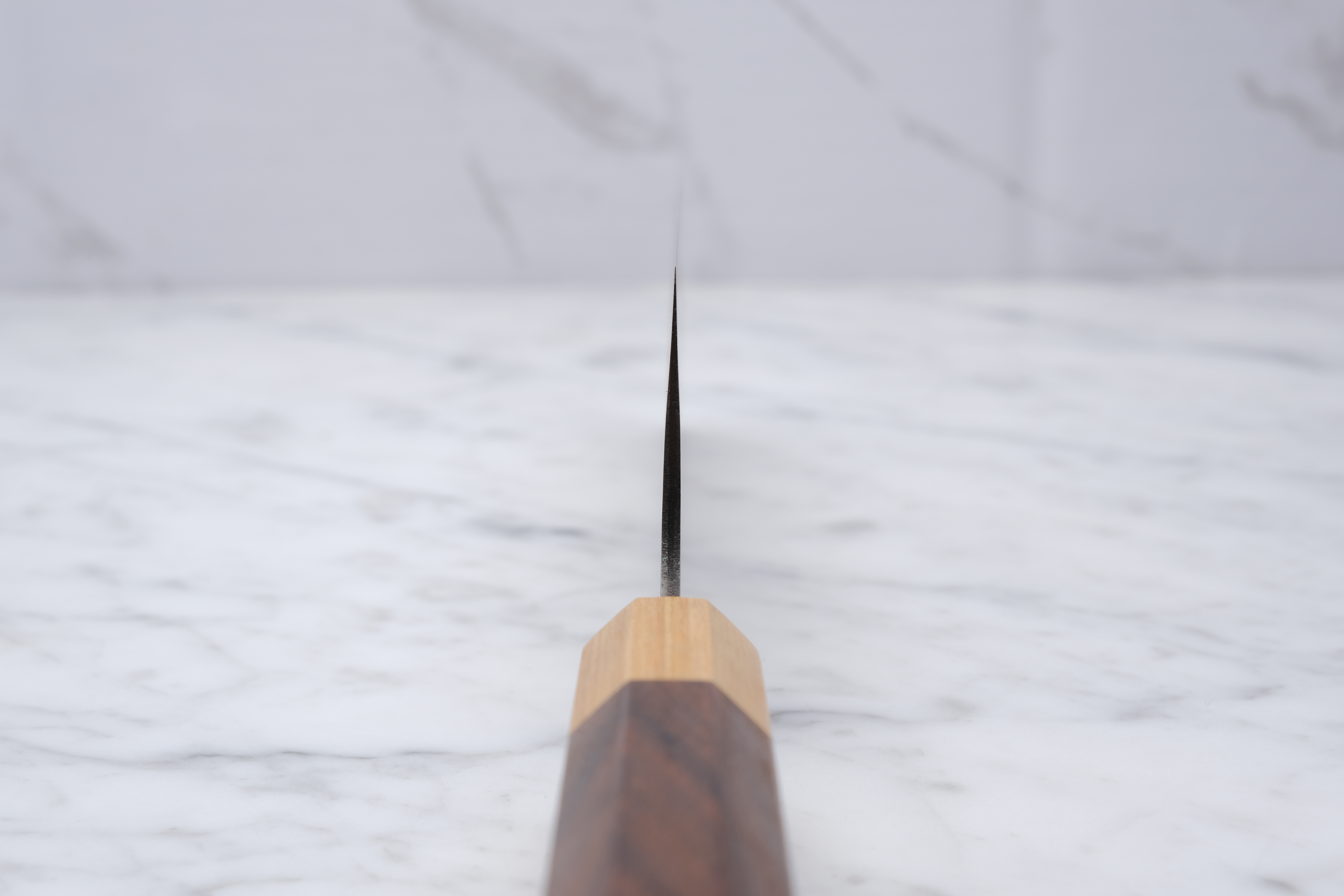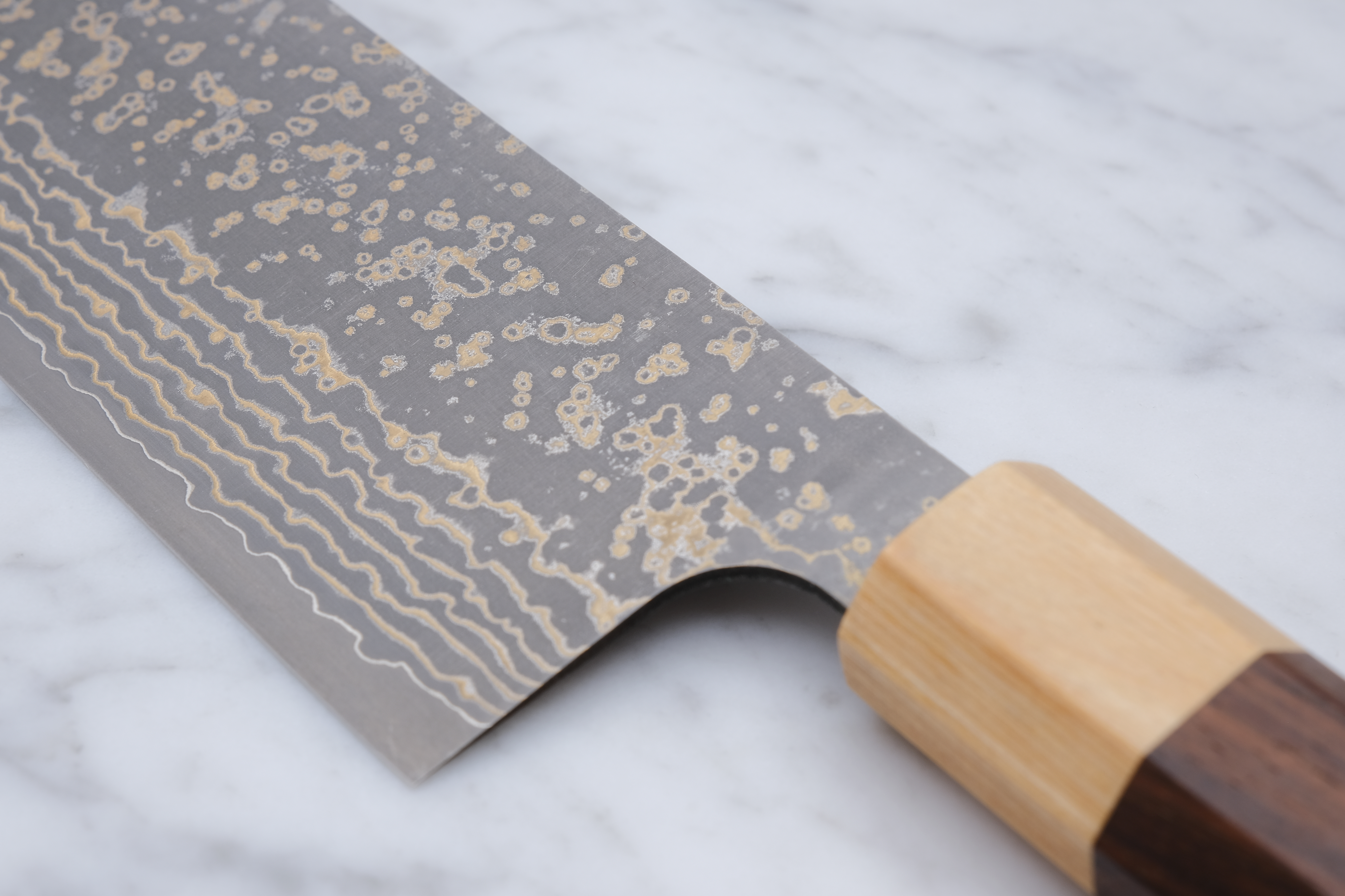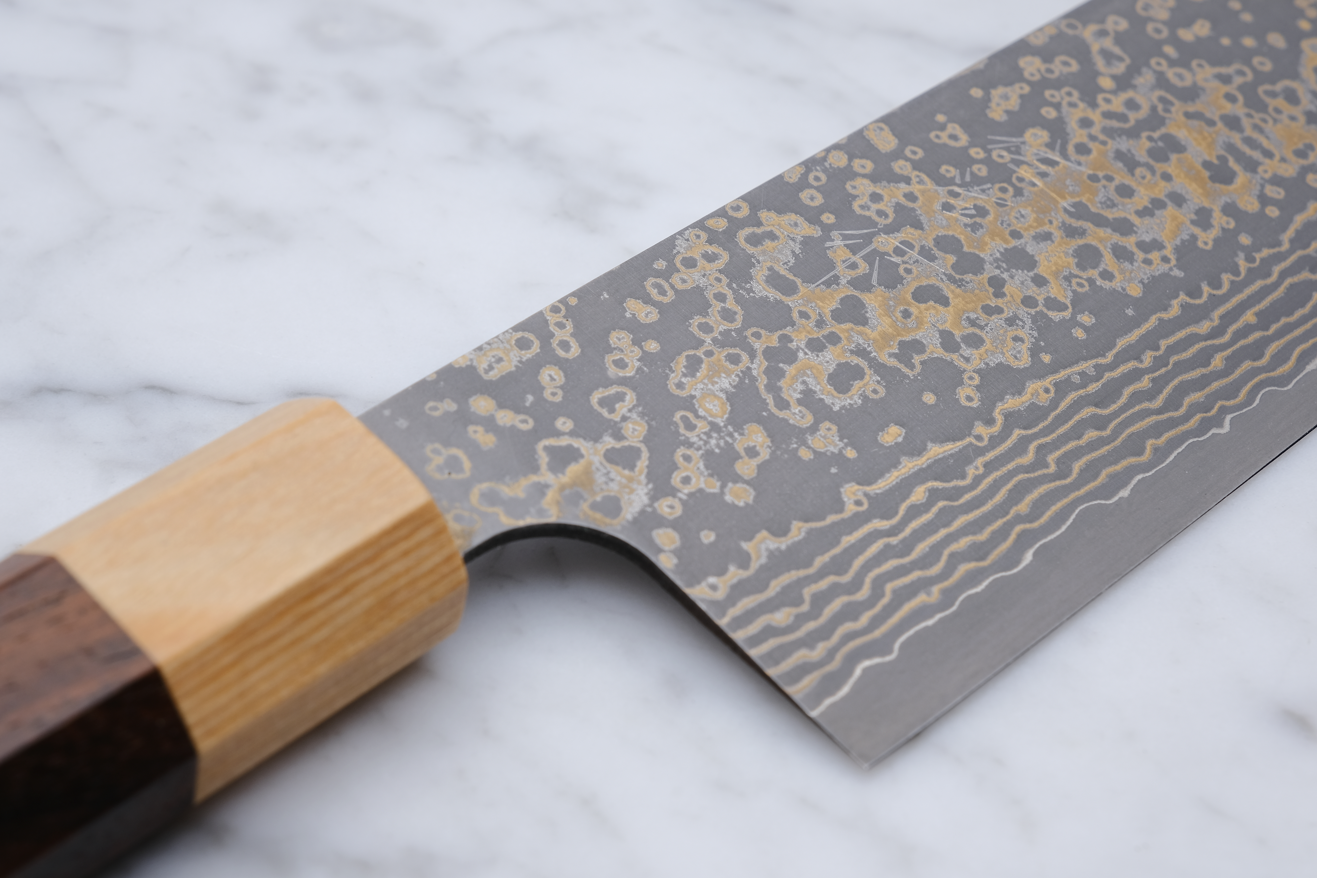 This 165 mm nakiri is from his 'Gold' series, and is made with VG-10 core steel and finished with a stunning copper damask.
