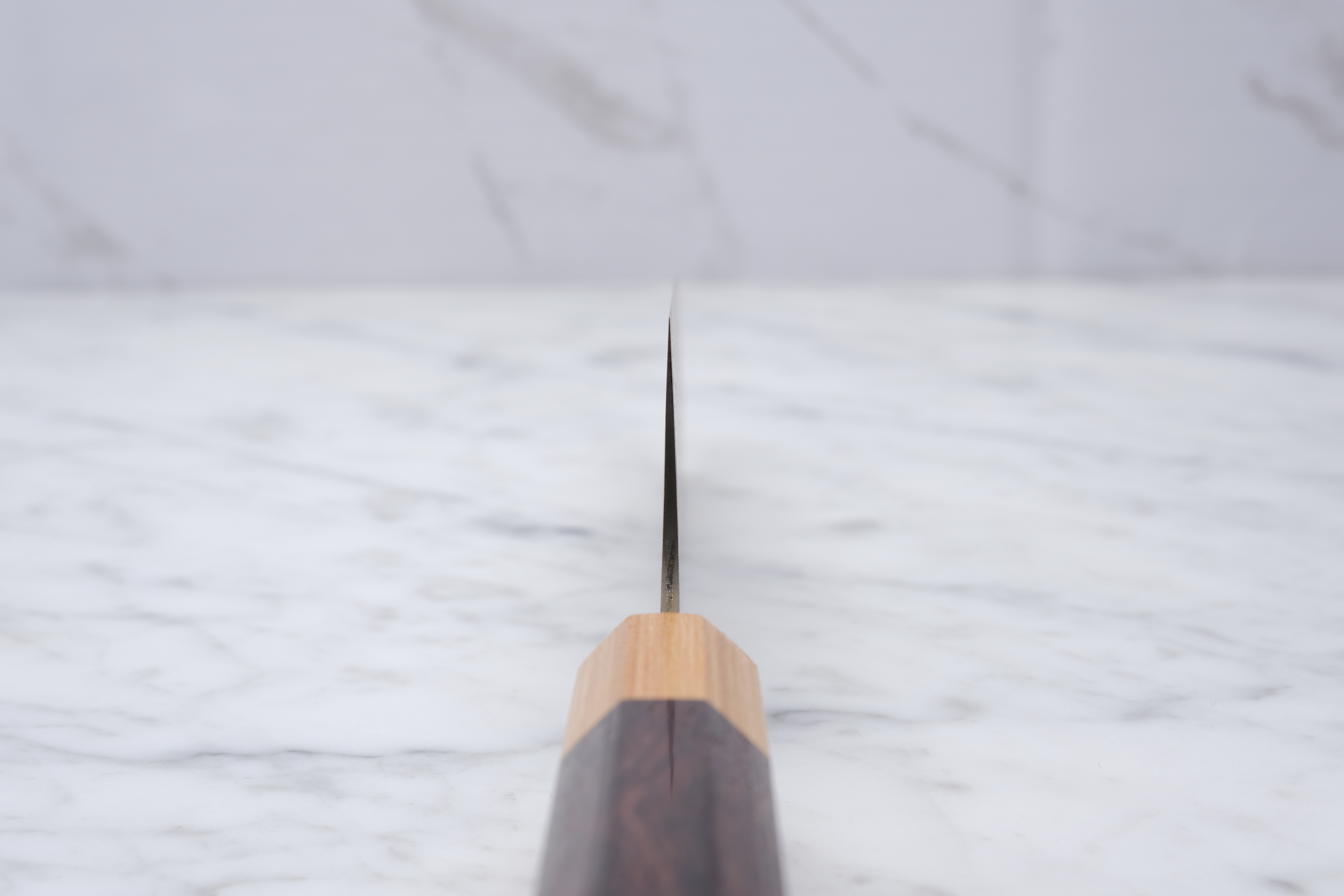 This 165 mm santoku is from his 'Gold' series, and is made with VG-10 core steel and finished with a stunning copper damask.