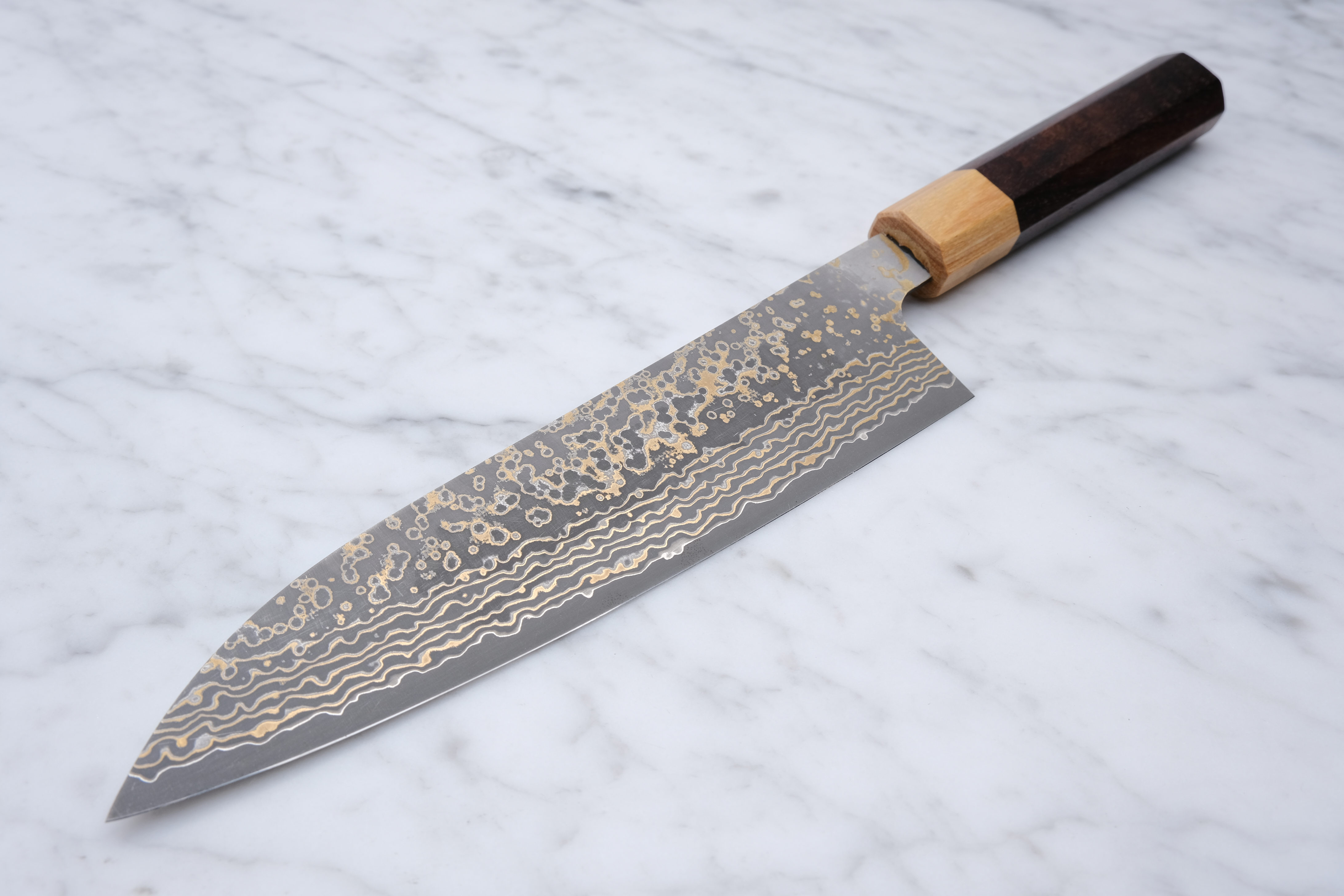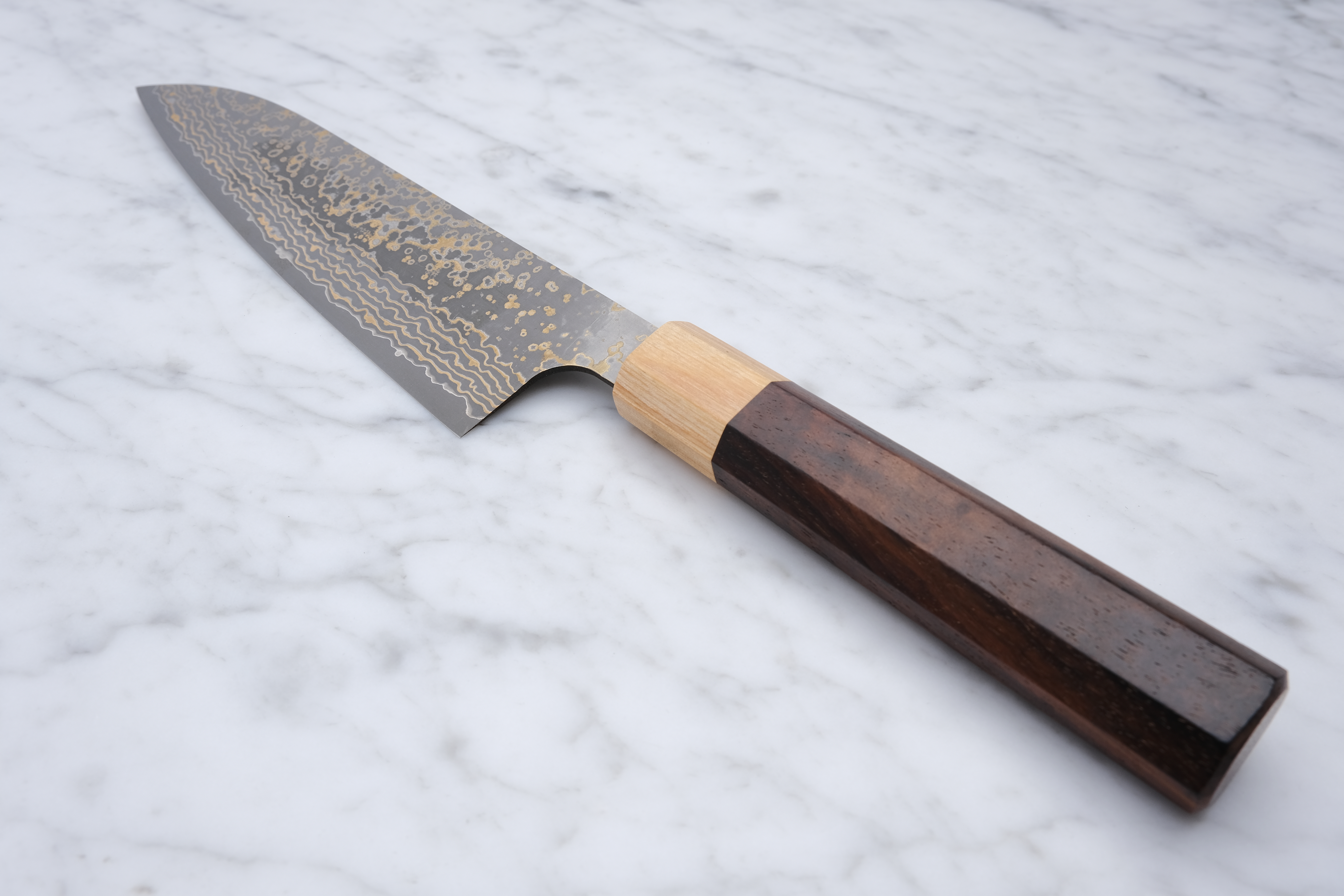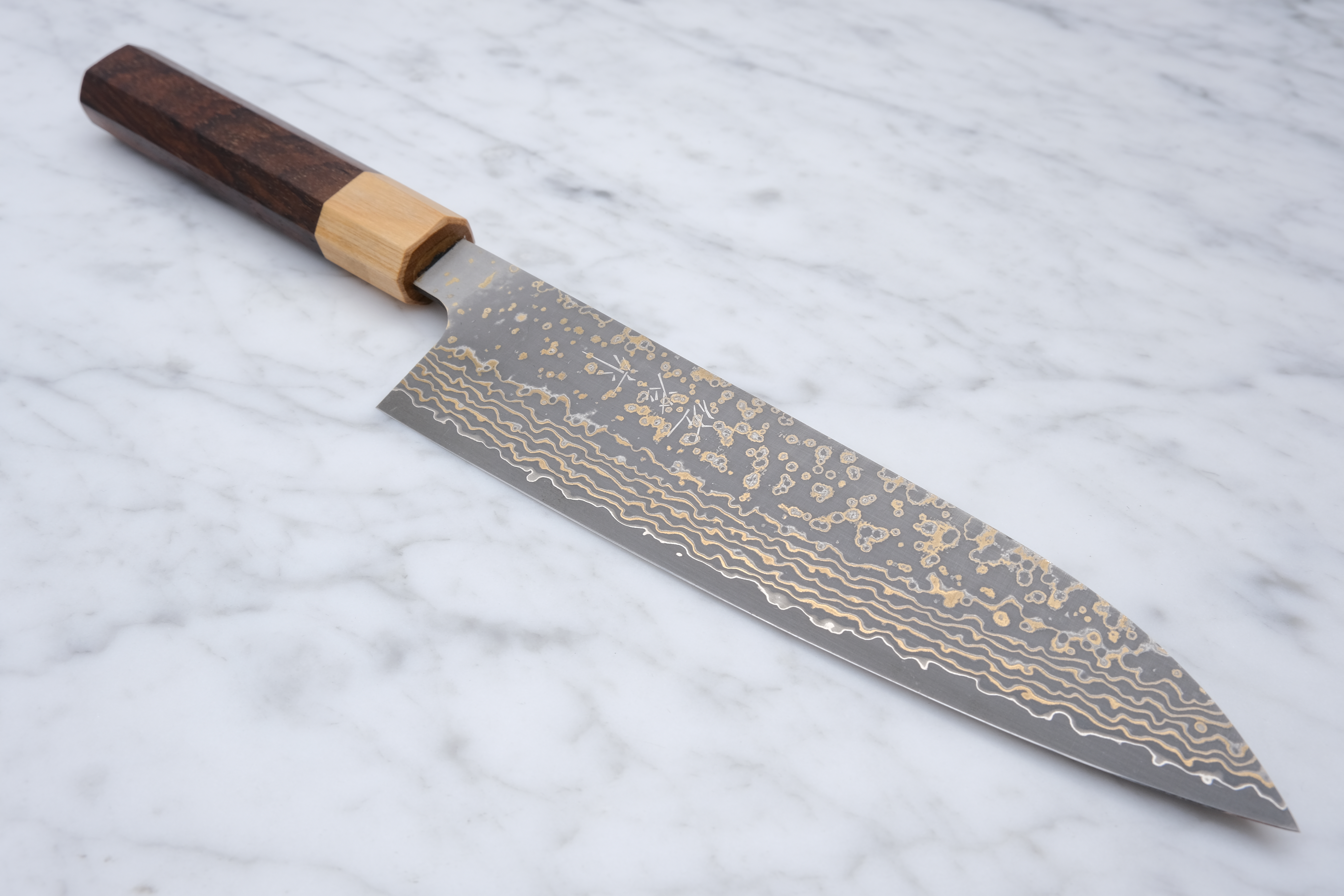 This 180mm gyoto is from his 'Gold' series, and is made with VG-10 core steel and finished with a stunning copper damask.