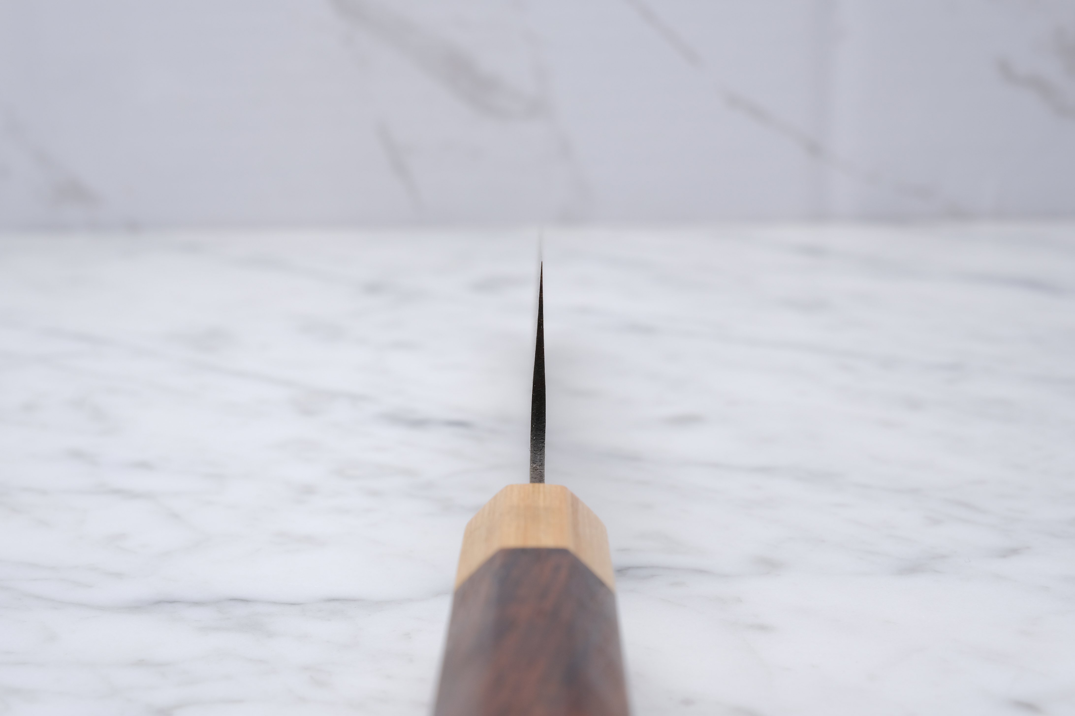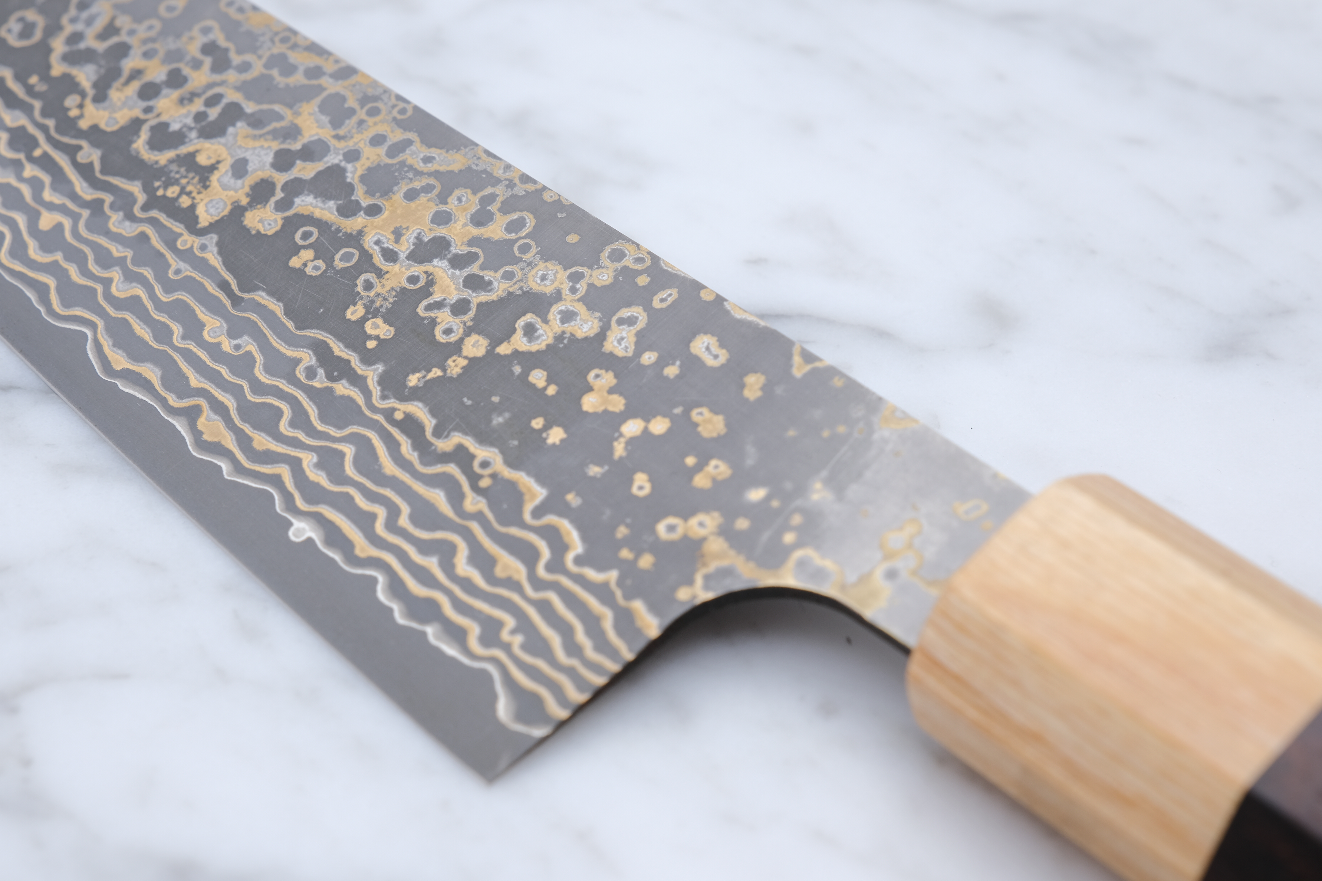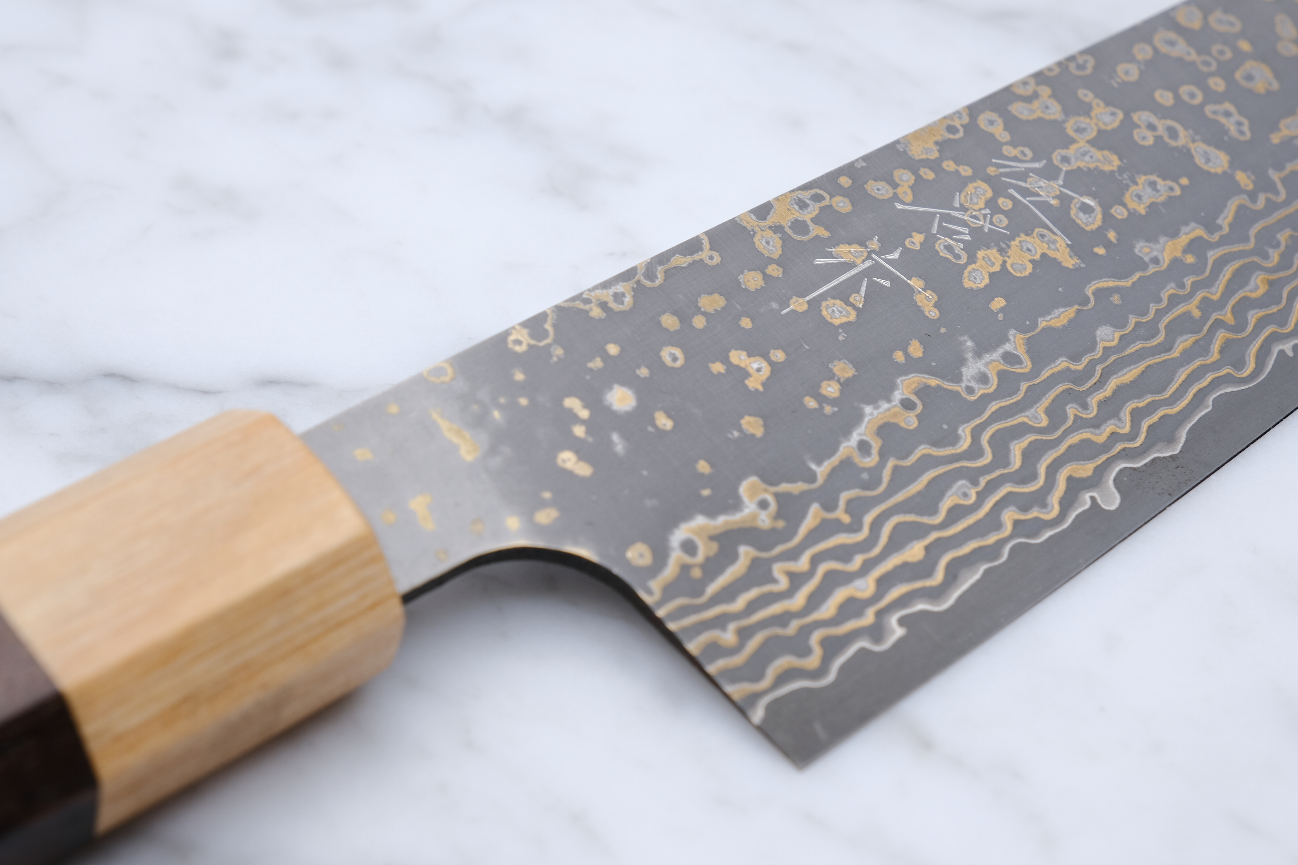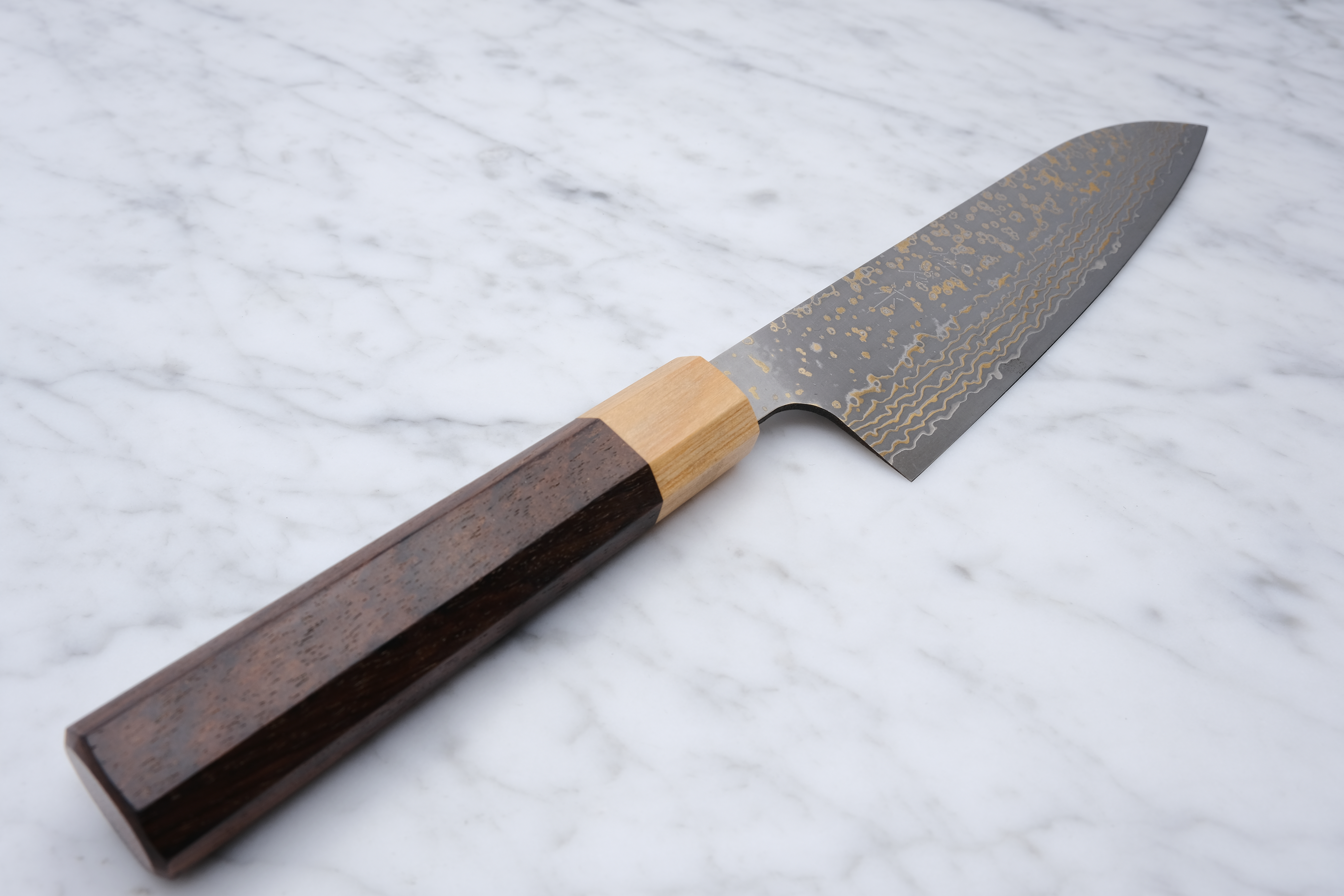 This 180mm gyoto is from his 'Gold' series, and is made with VG-10 core steel and finished with a stunning copper damask.
