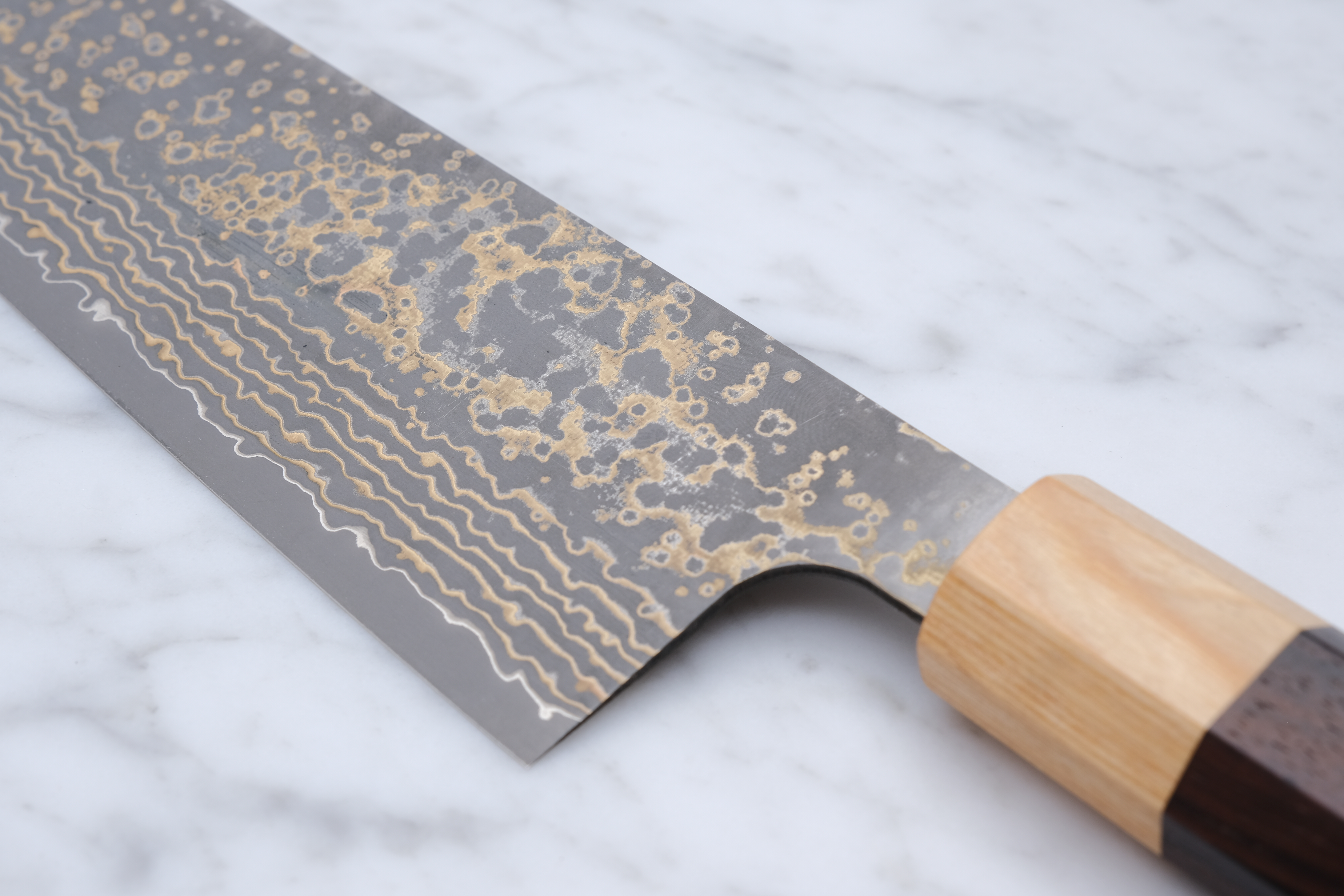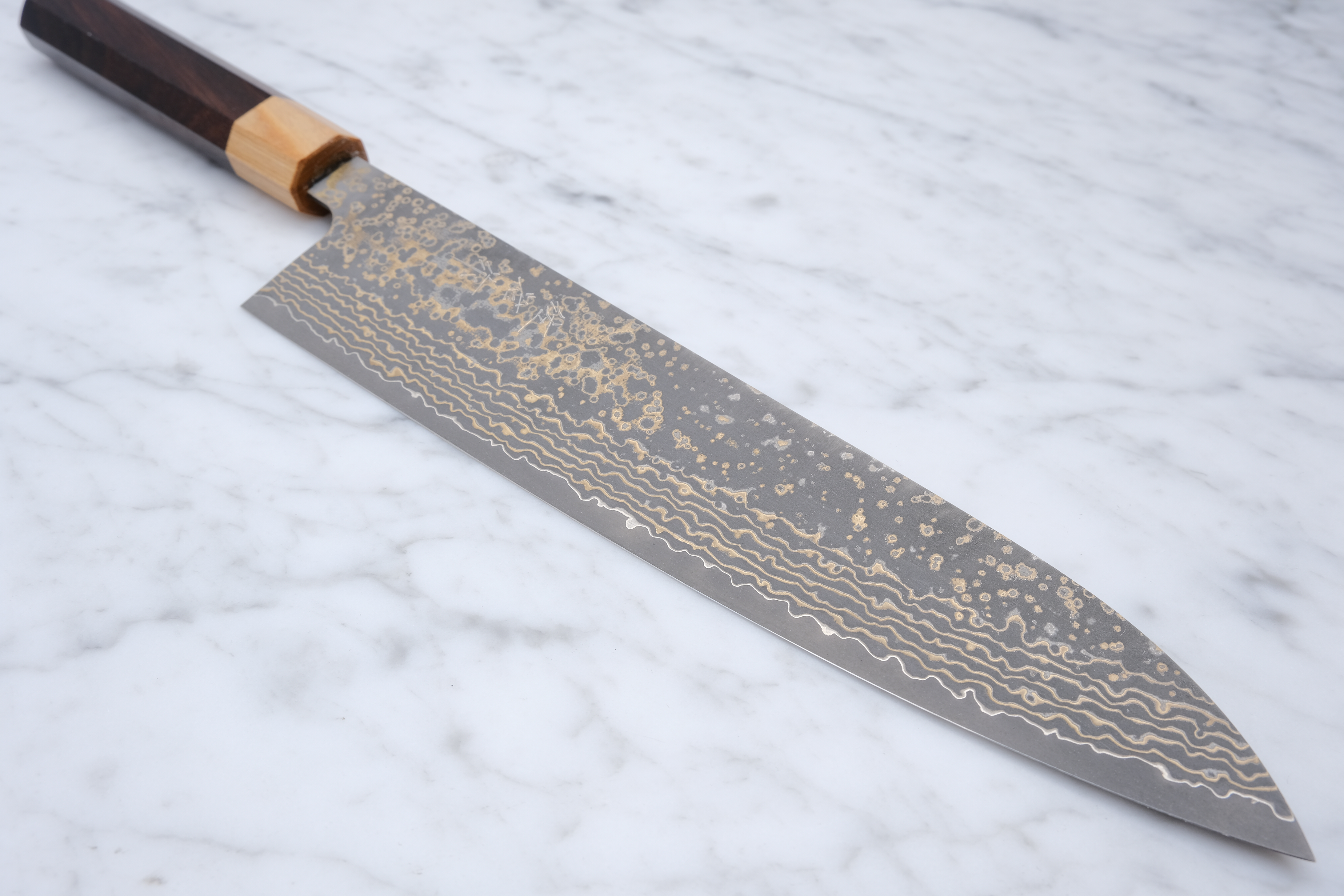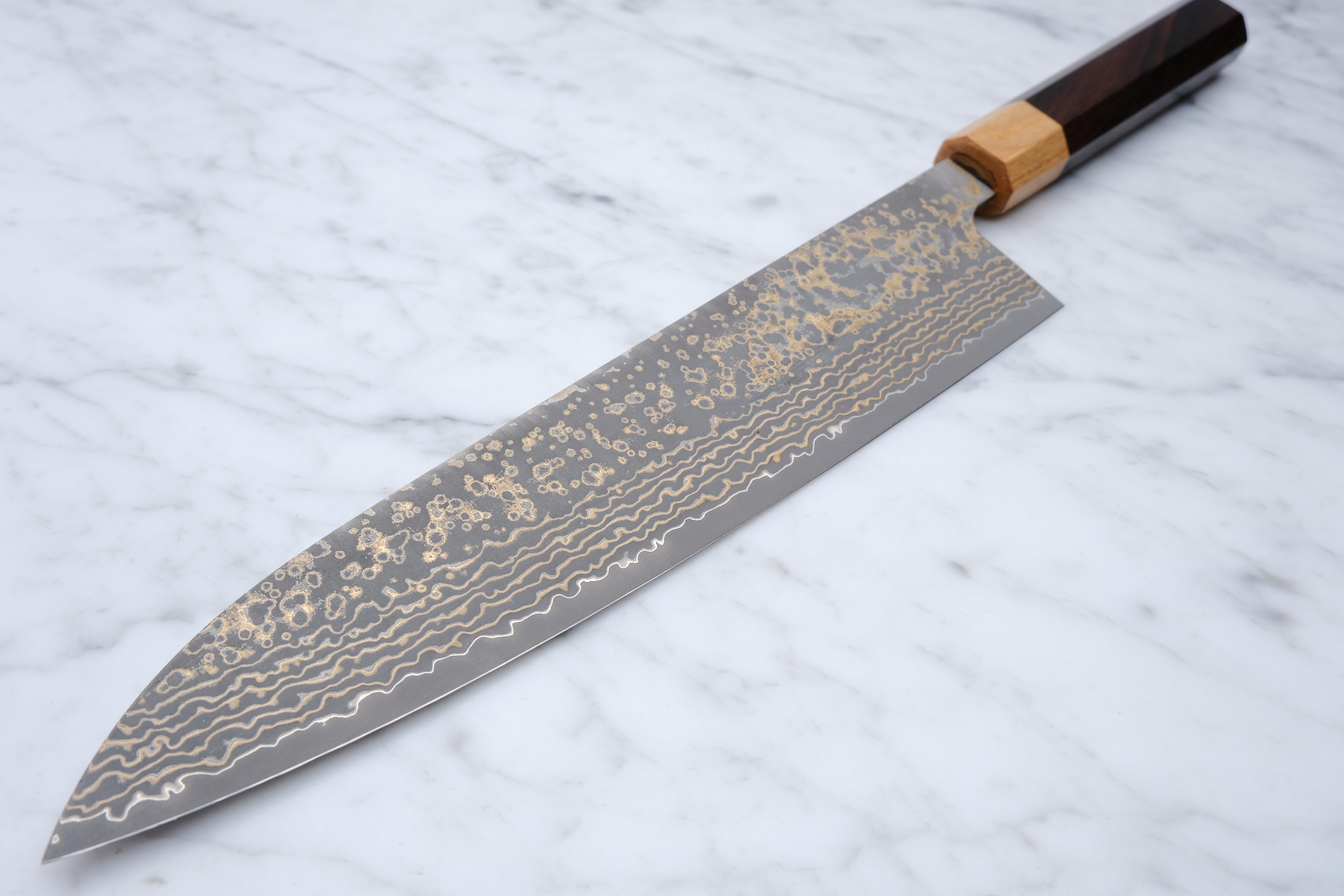 This 240mm chef's knife is from his 'Gold' series, and is made with VG-10 core steel and finished with a stunning copper damask.