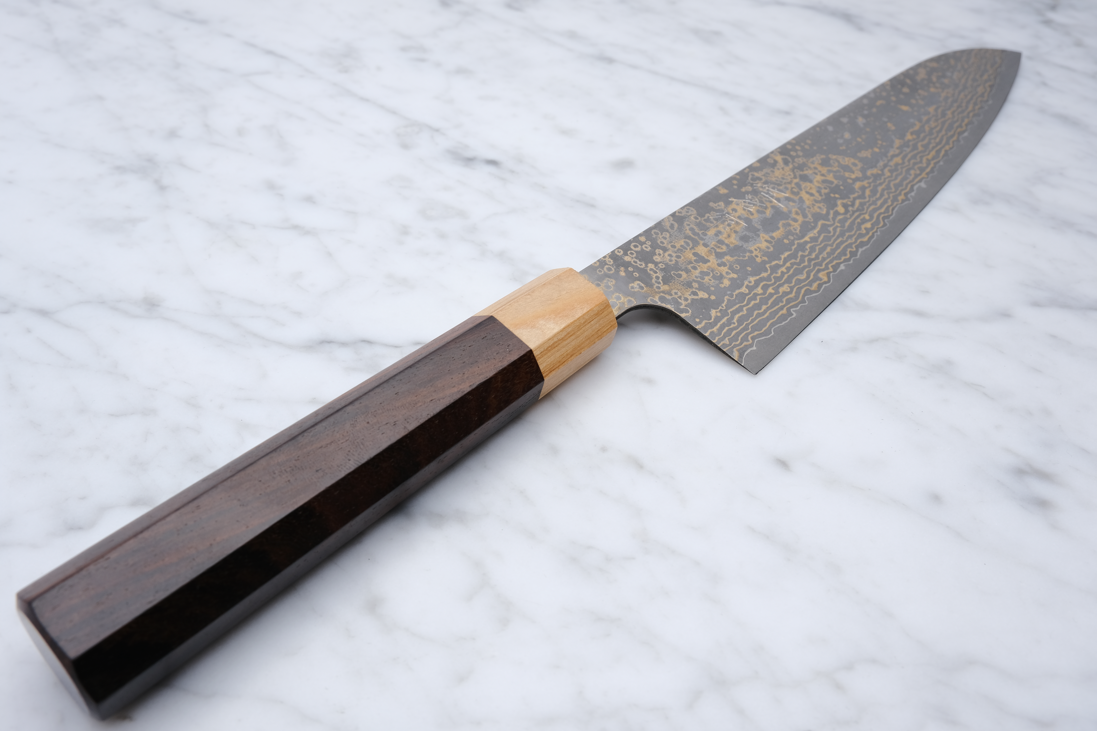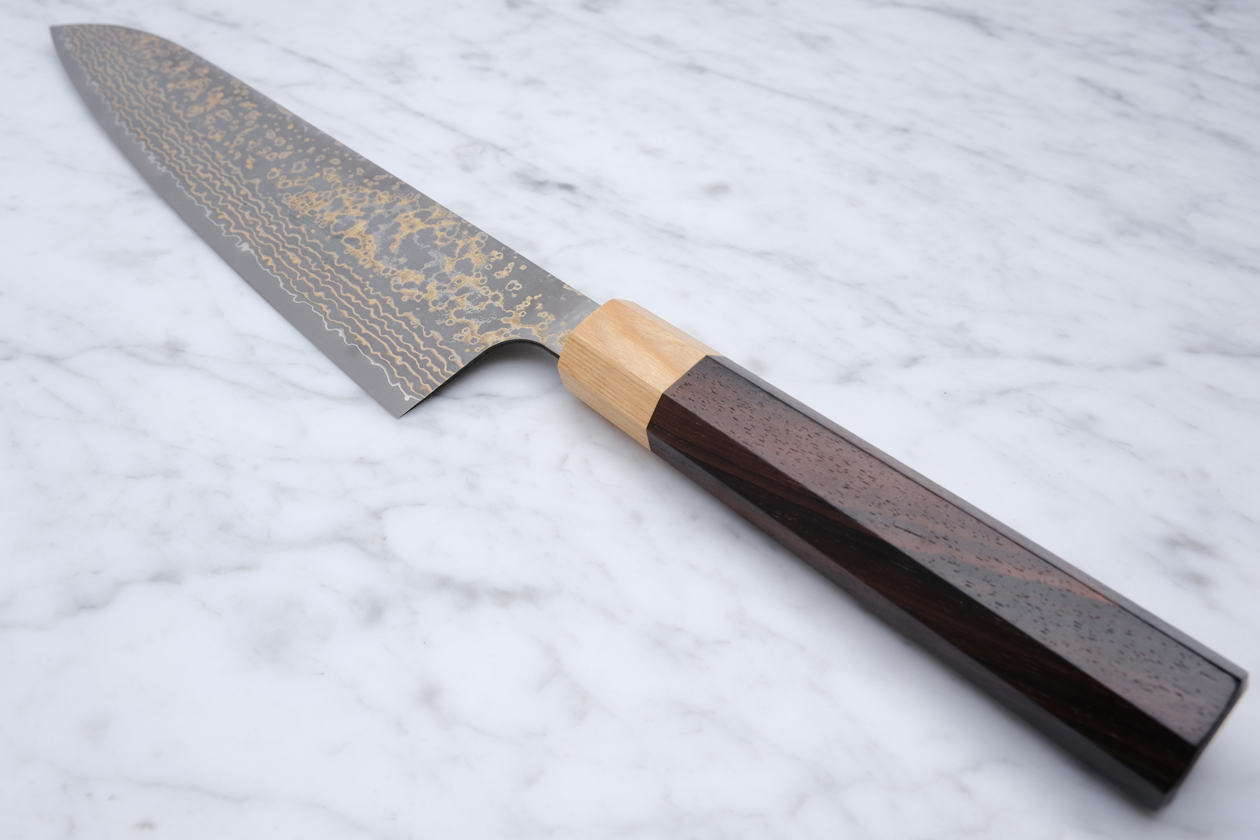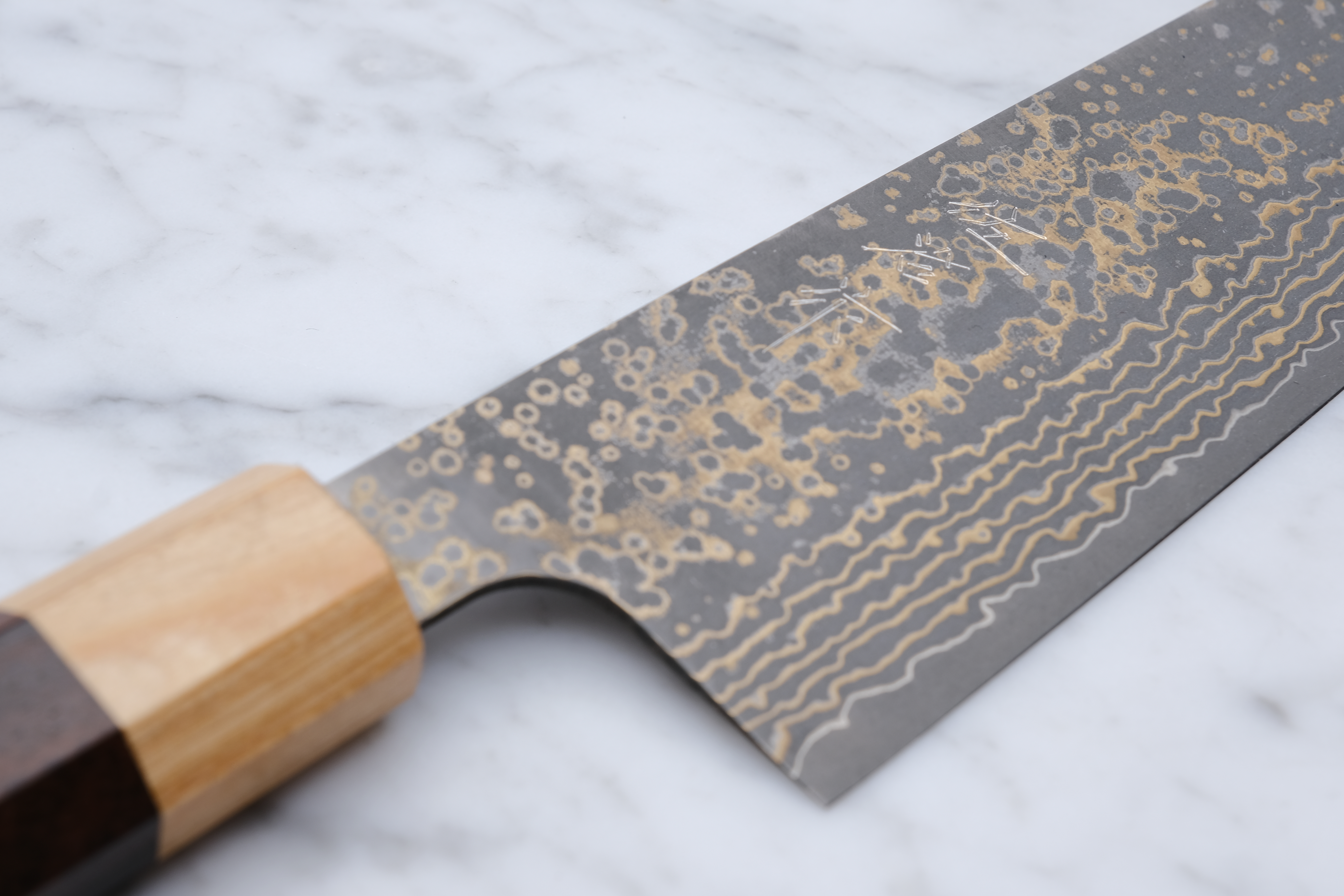 This 240mm chef's knife is from his 'Gold' series, and is made with VG-10 core steel and finished with a stunning copper damask.