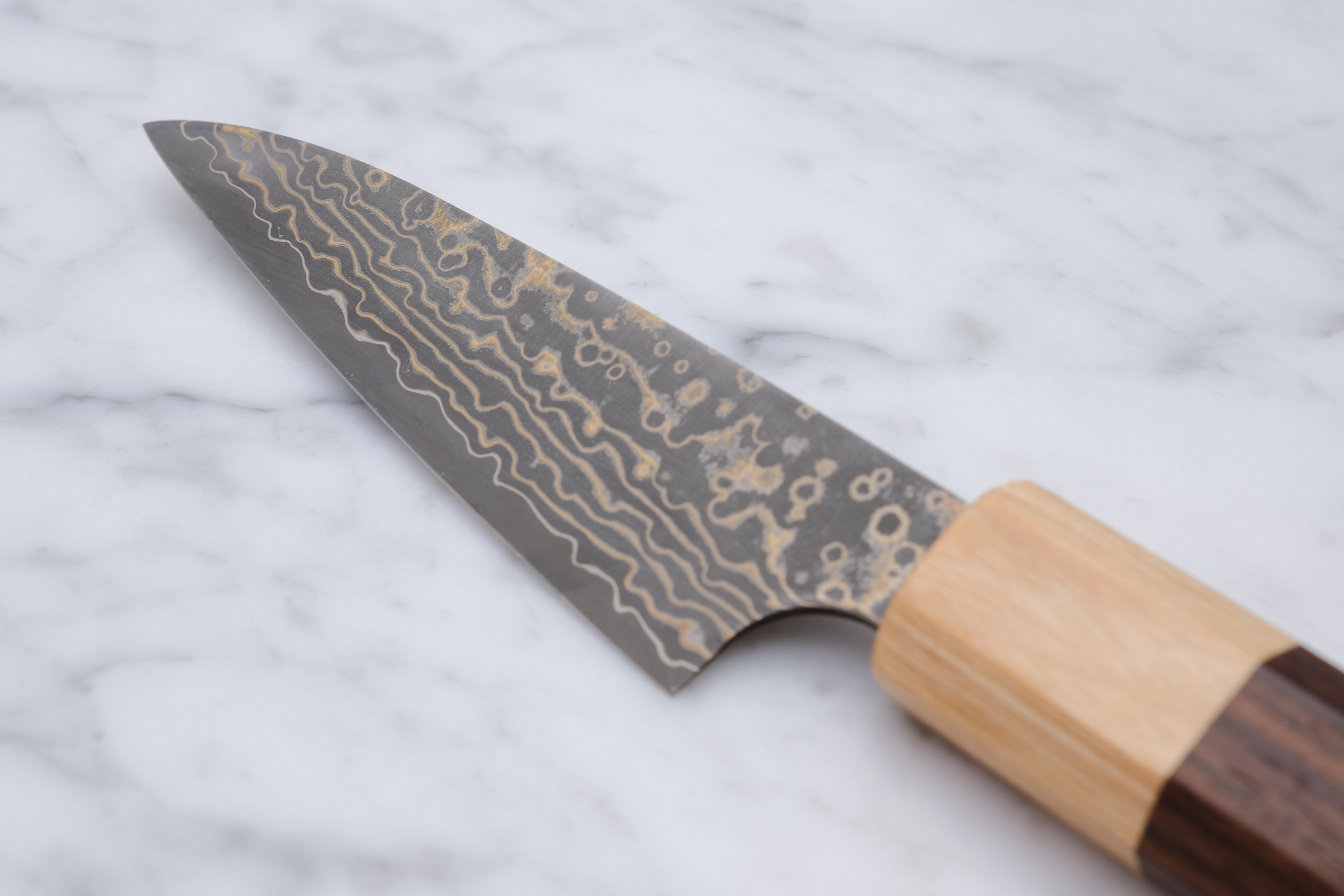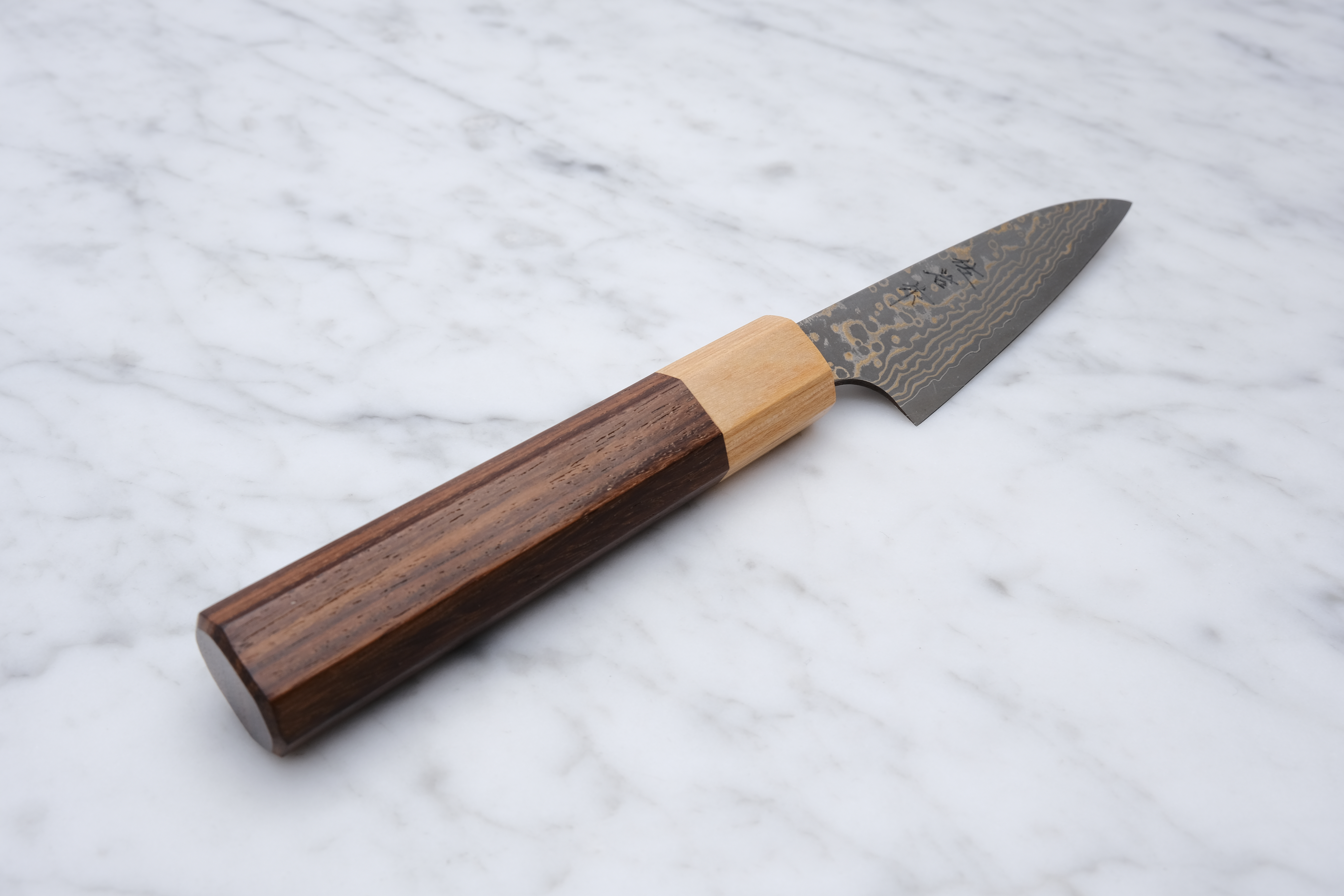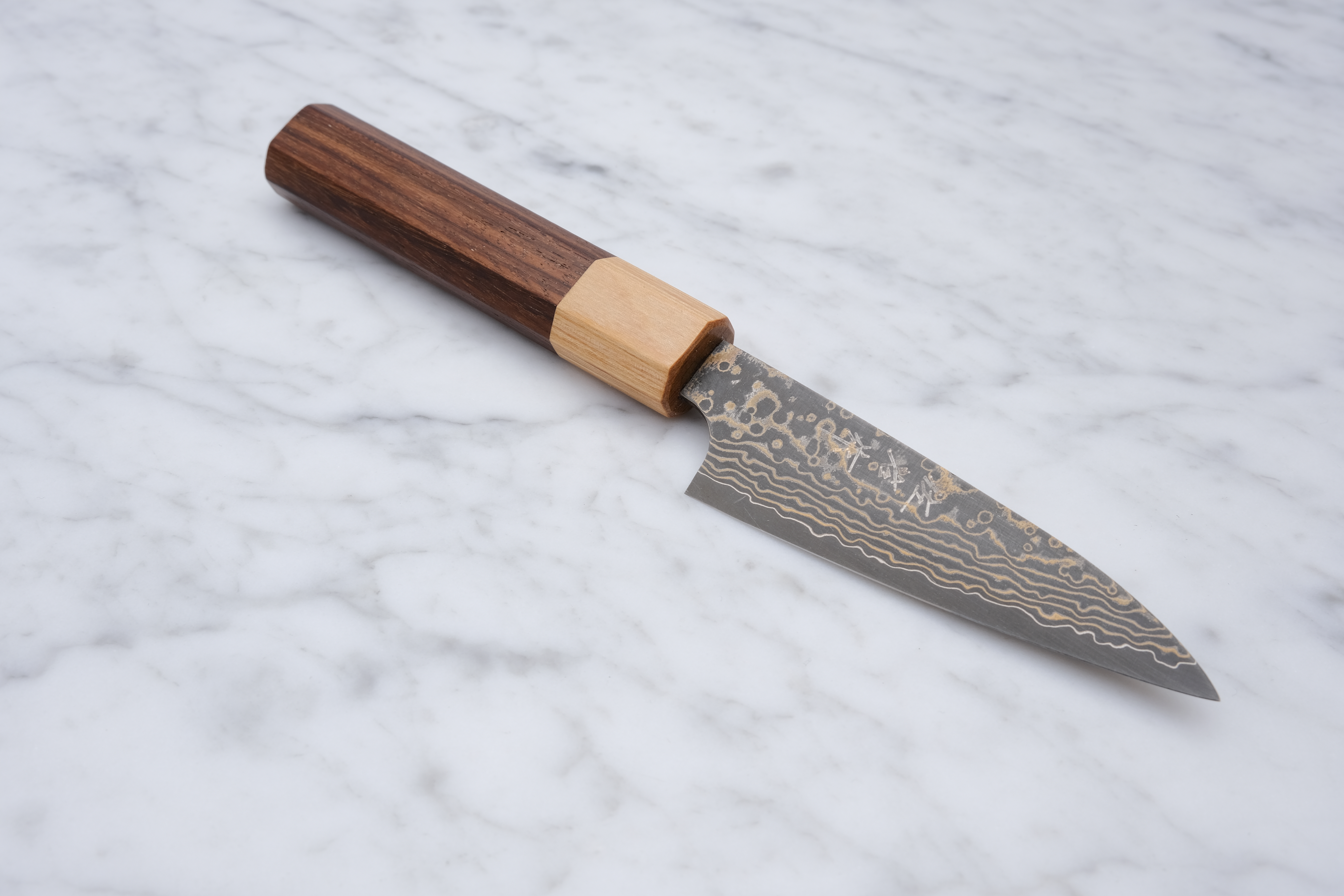 This 90mm petty is from his 'Gold' series, and is made with VG-10 core steel and finished with a stunning copper damask.