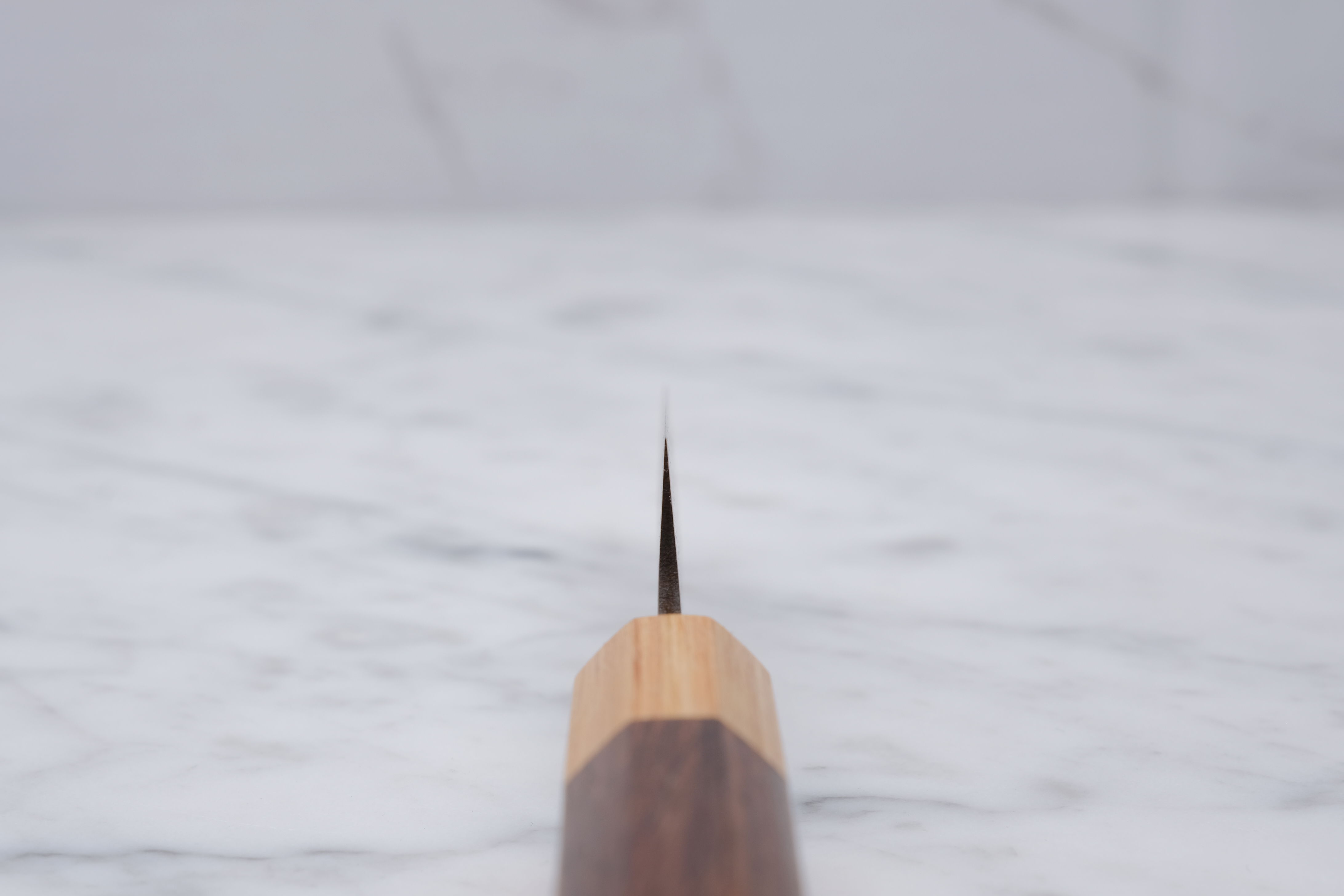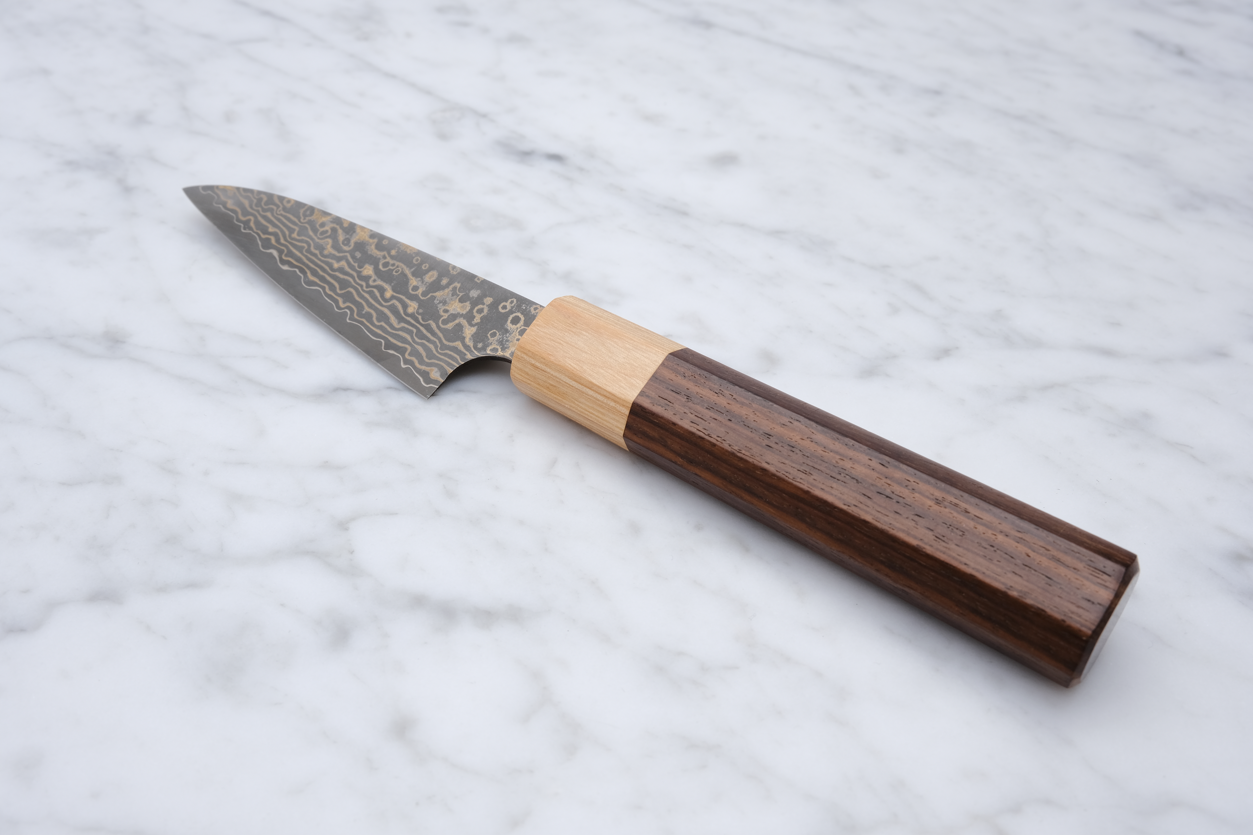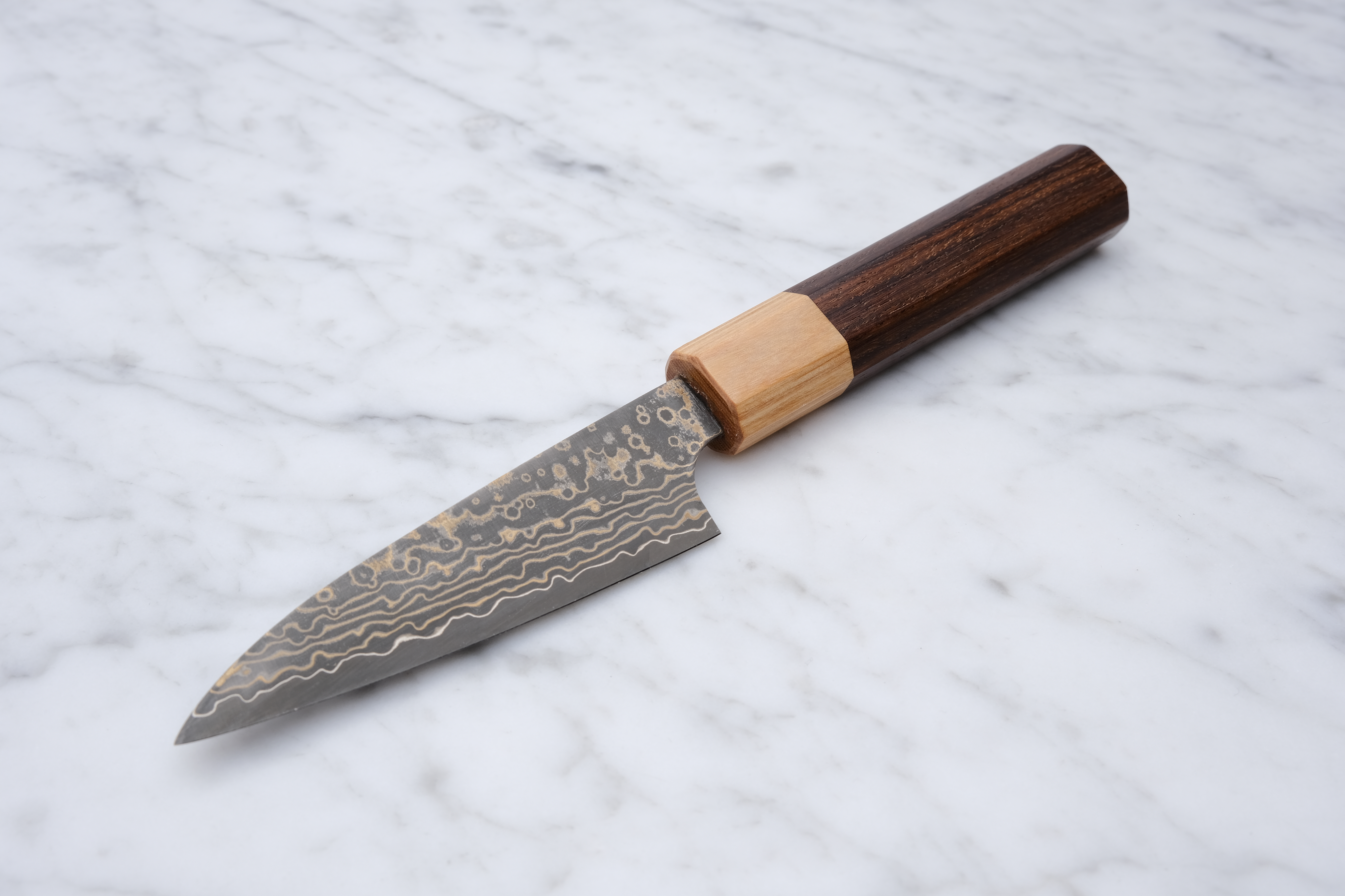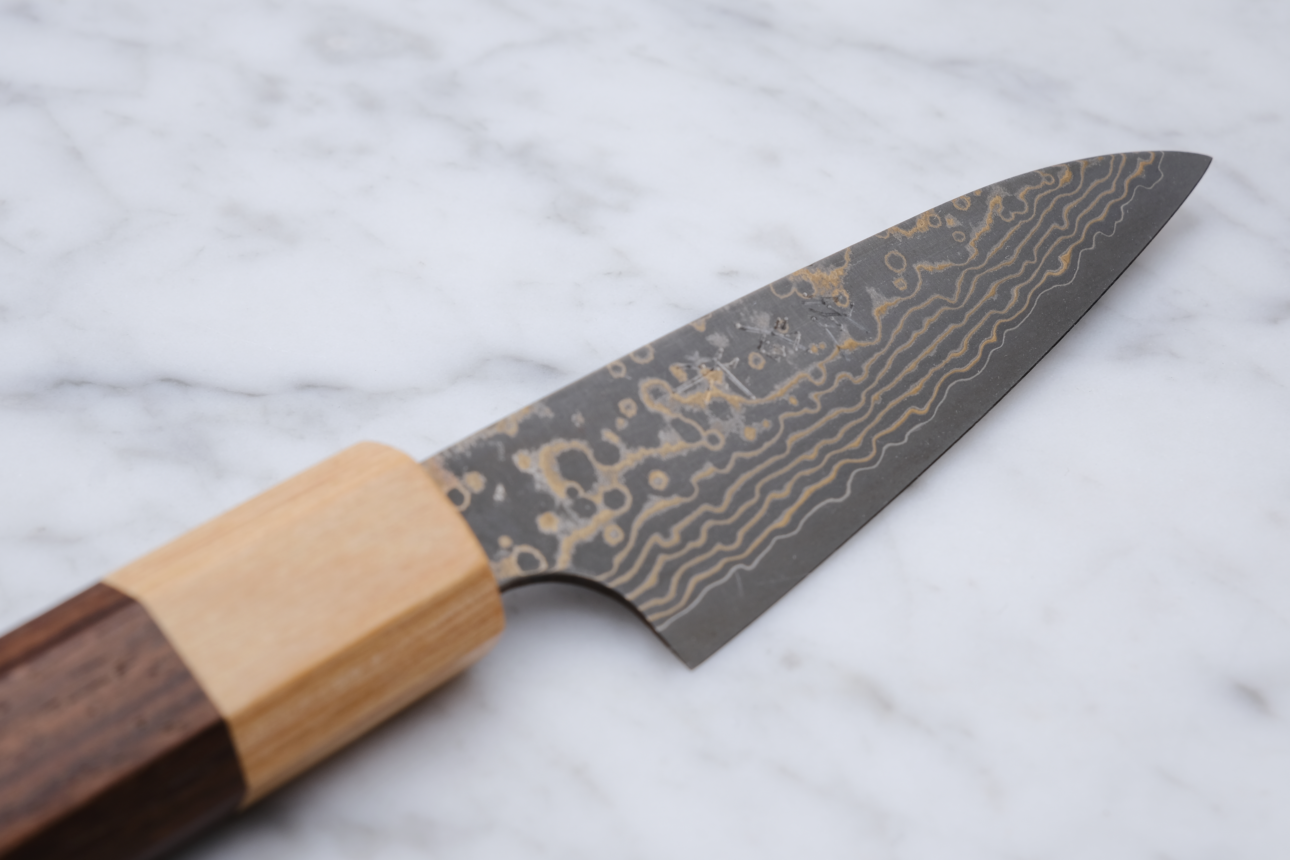 This 90mm petty is from his 'Gold' series, and is made with VG-10 core steel and finished with a stunning copper damask.