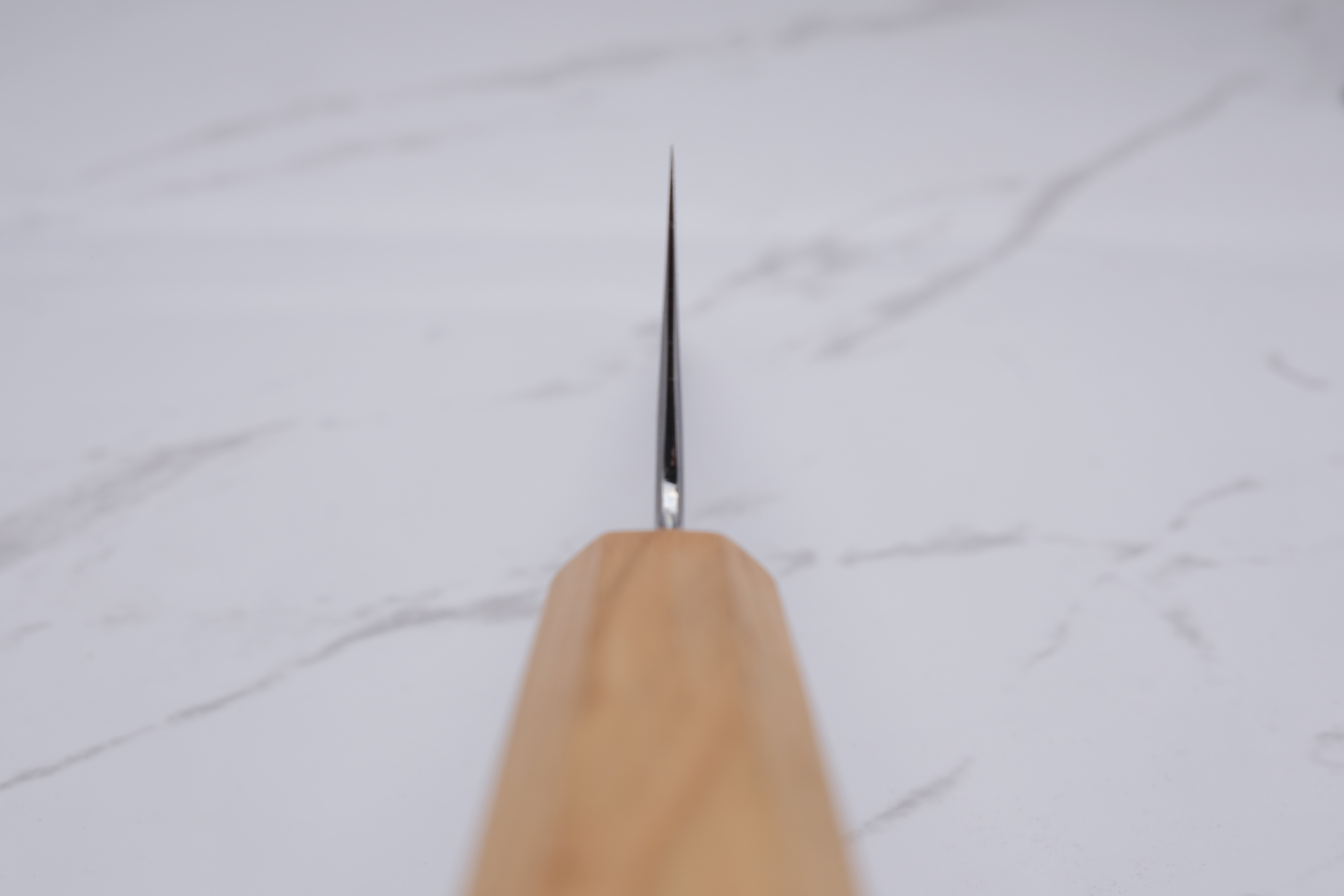 This knife series in White#2 is forged by Yoshikazu Tanaka and is sharpened by an upcoming sharpener from Baba Cutlery Works. This way, you get an incredible amount of knife for the money without compromising on quality.
