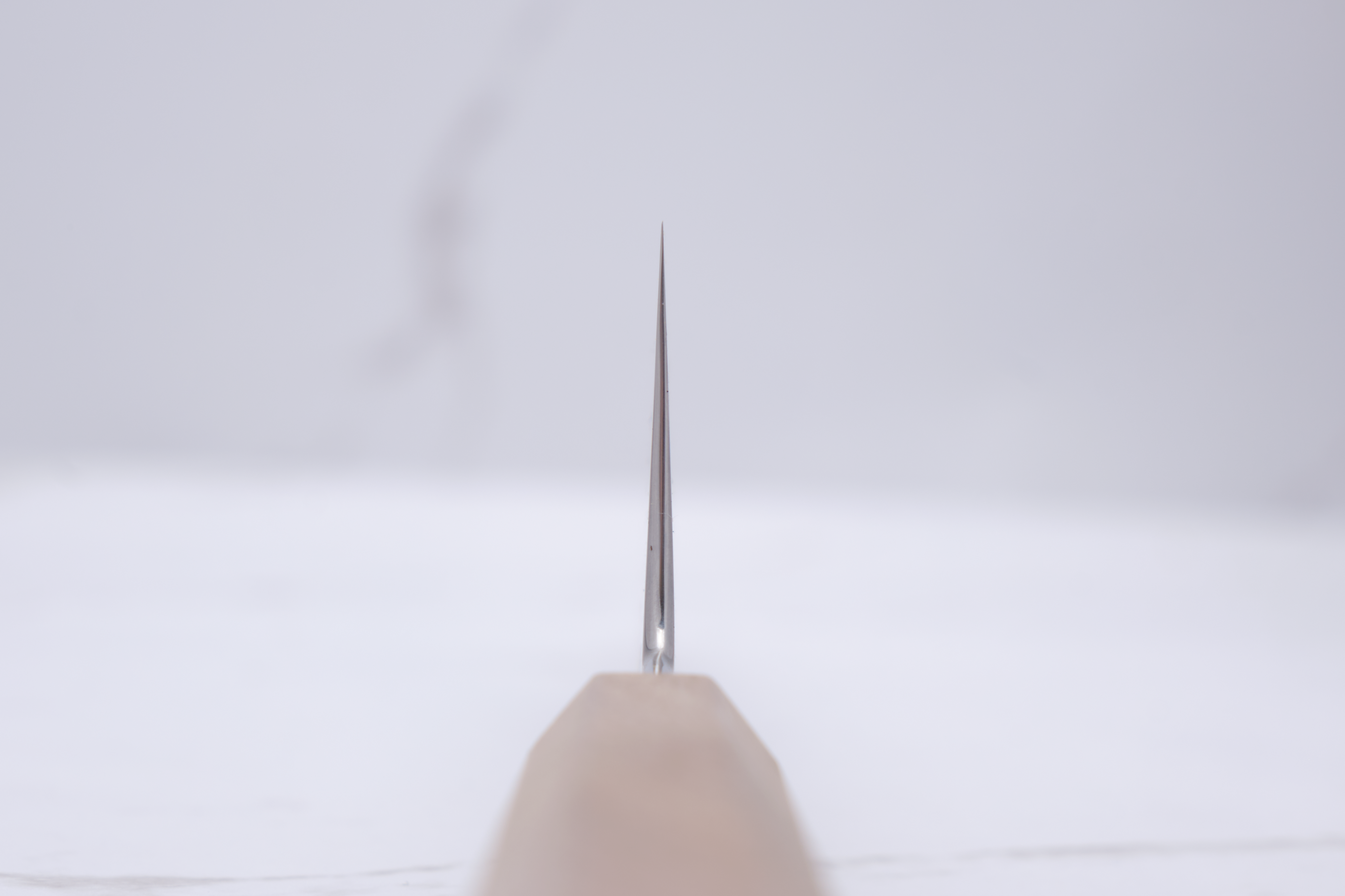 In Sakai, Japan these knives are produced. Made in White #2 in the core, and soft iron on the outside. We do not know the blacksmith or the sharpener behind the knives, but we can tell that they are fantastically processed. The curing is fantastic and the grinding is top notch. Very nice grind that makes the knives super thin behind the egg, which helps for an incredibly good cutting experience.
