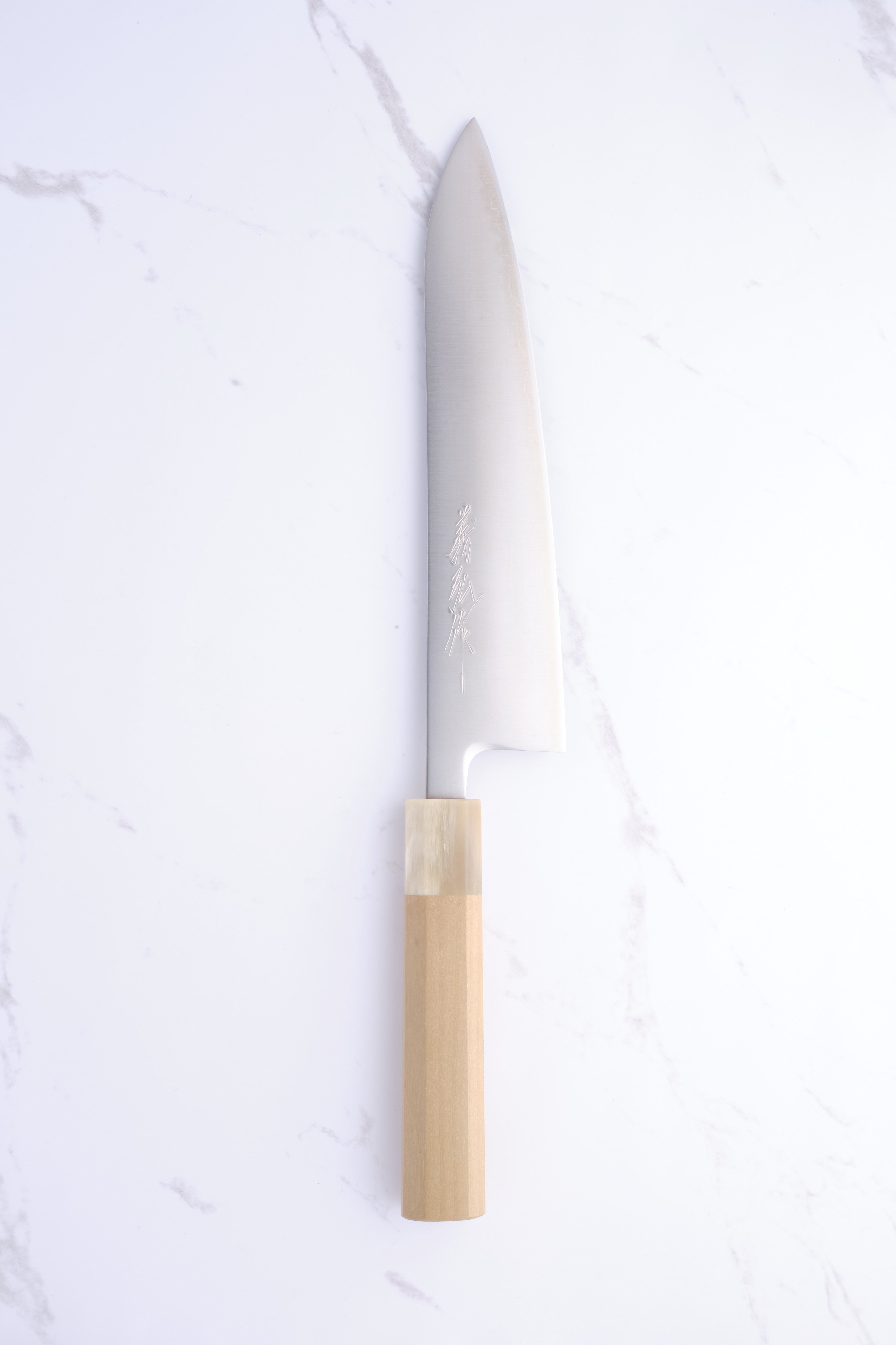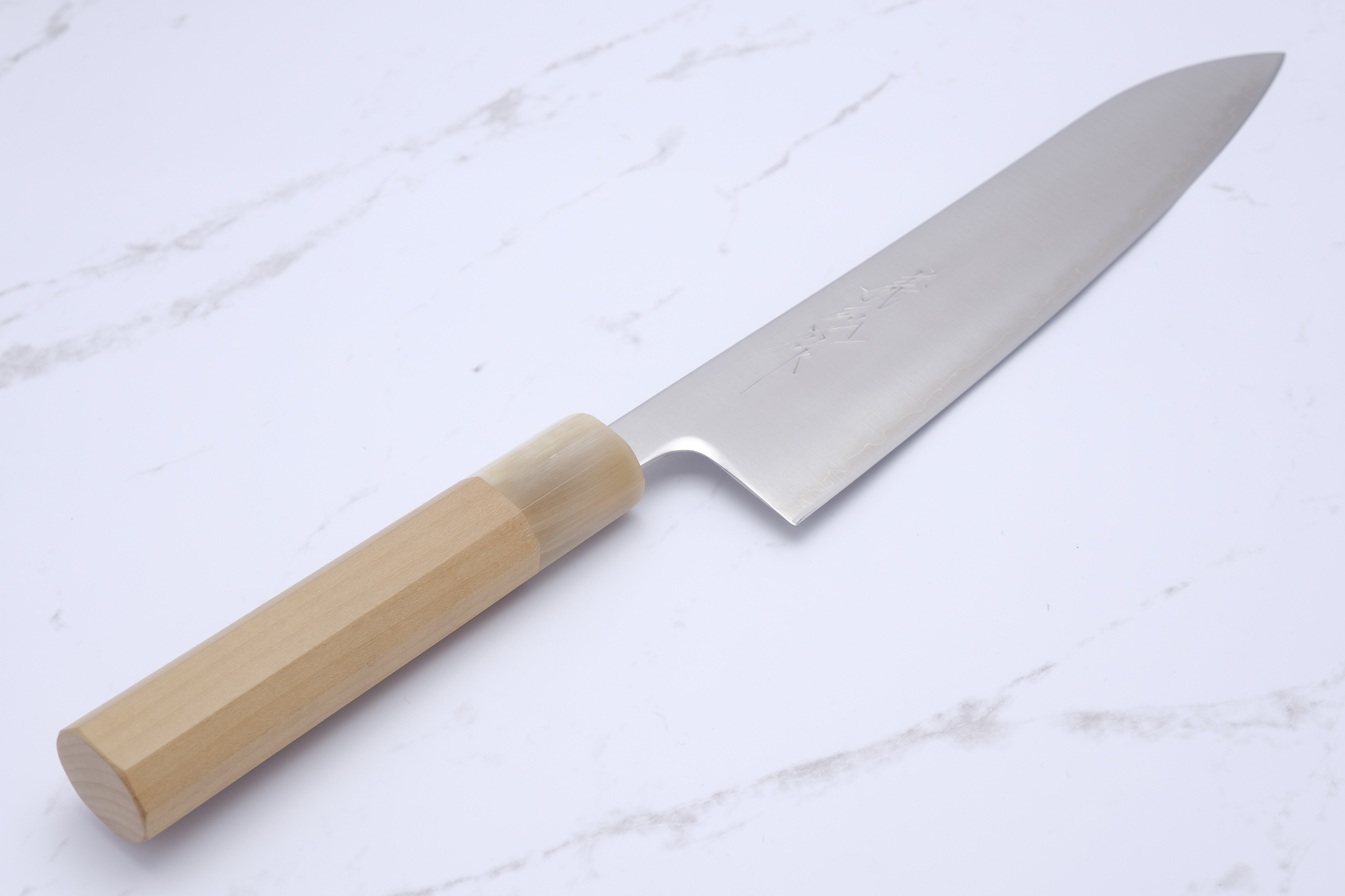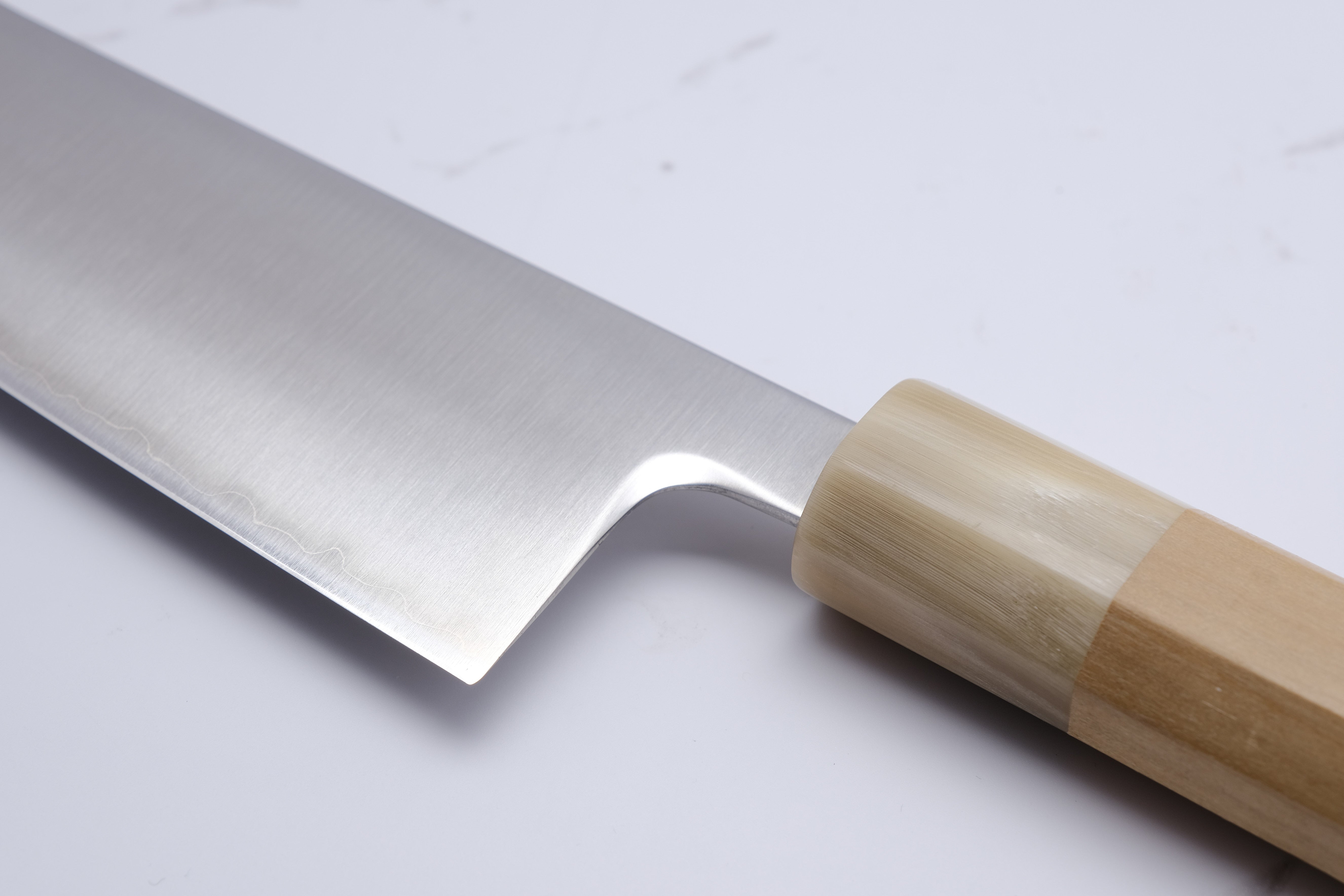 From Yamawaki Hamono comes this wonderful chef's knife in three layers of steel. The core steel is the coveted Aogami Super which rusts. On each side of the core is a layer of stainless steel which is easy to maintain