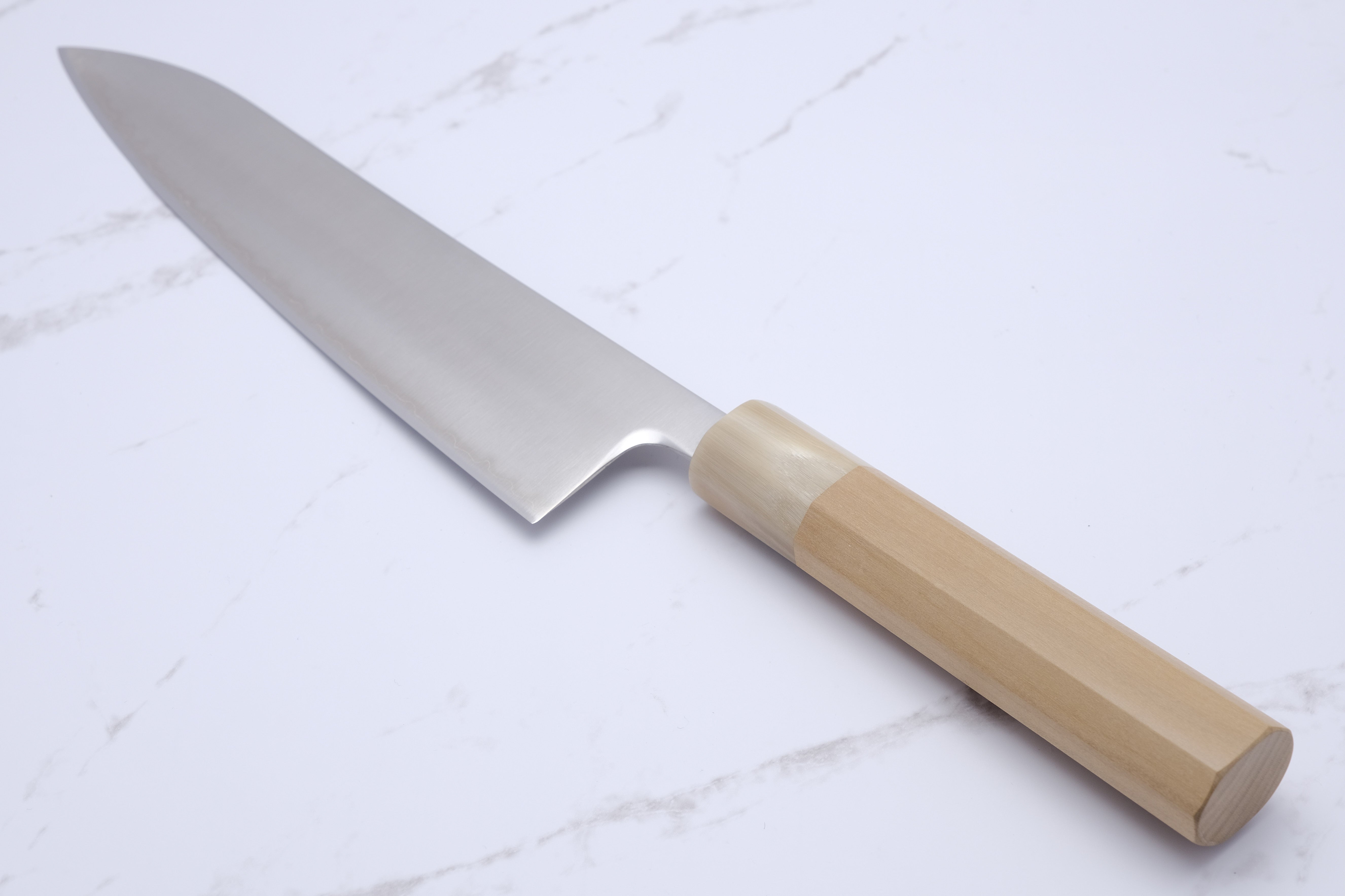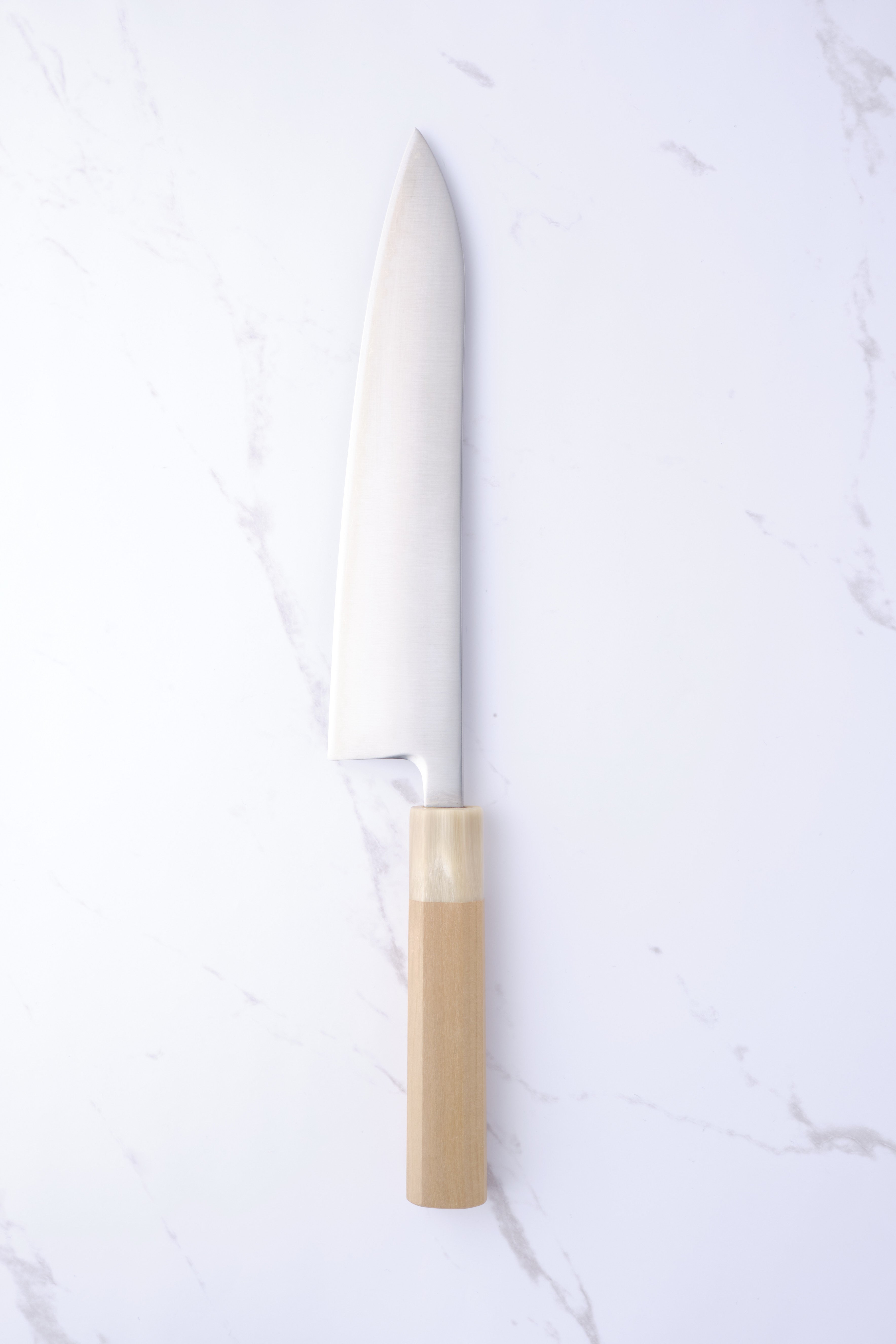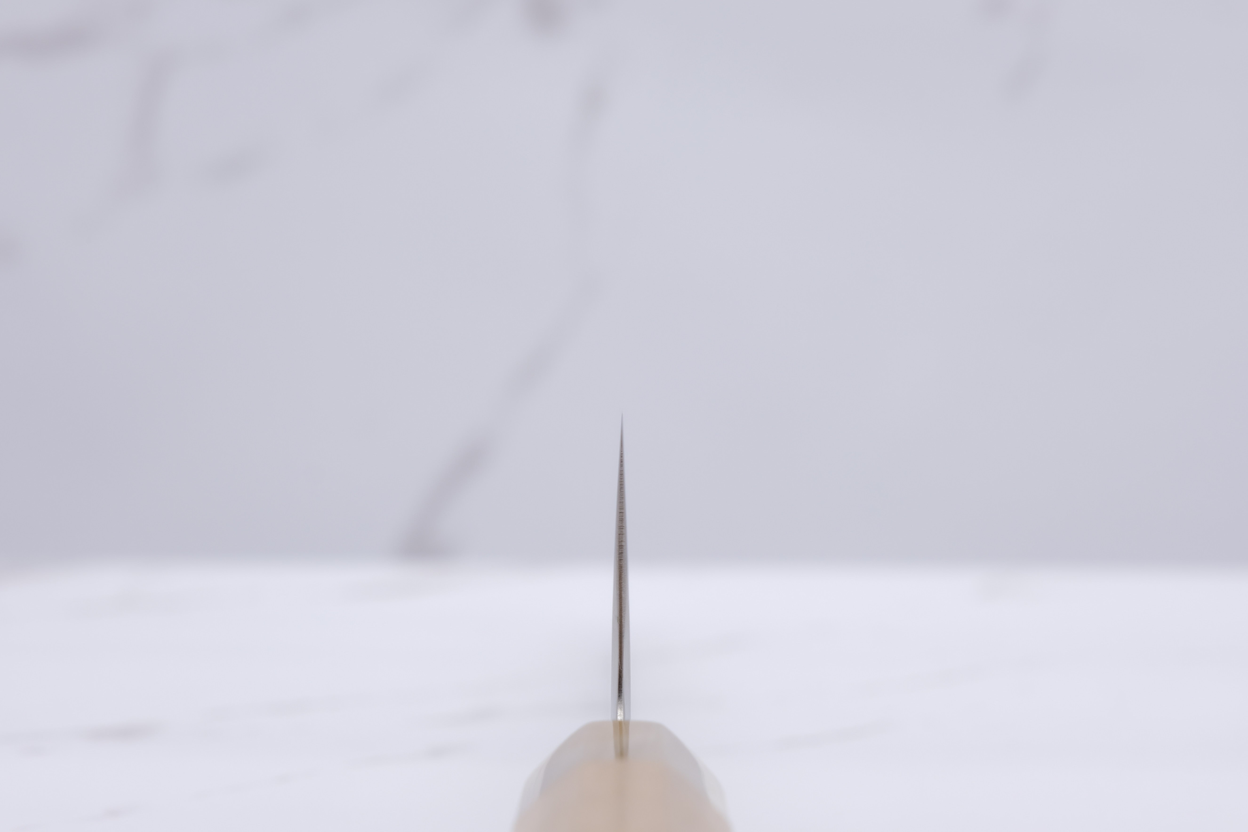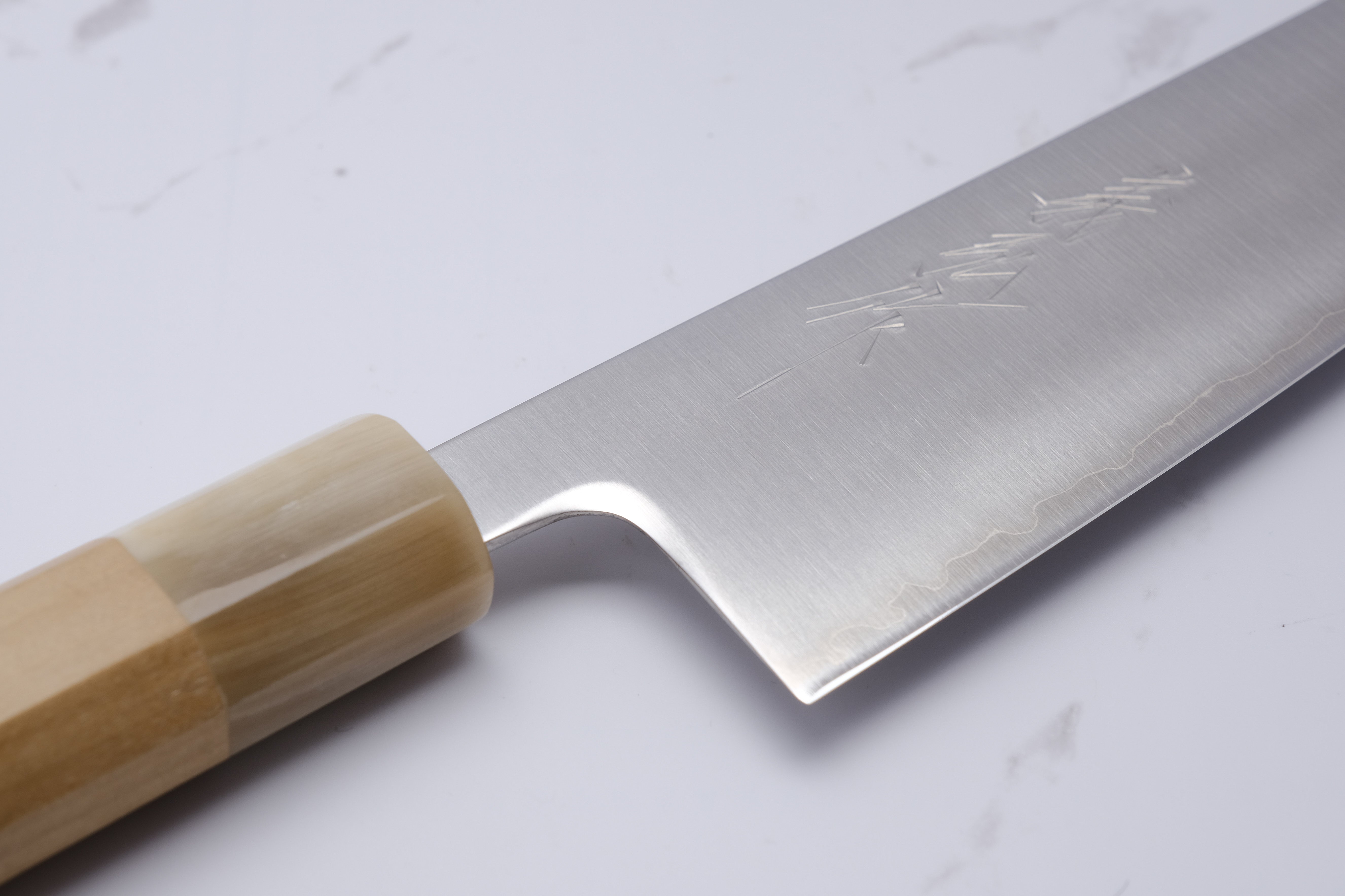 From Yamawaki Hamono comes this wonderful chef's knife in three layers of steel. The core steel is the coveted Aogami Super which rusts. On each side of the core is a layer of stainless steel which is easy to maintain