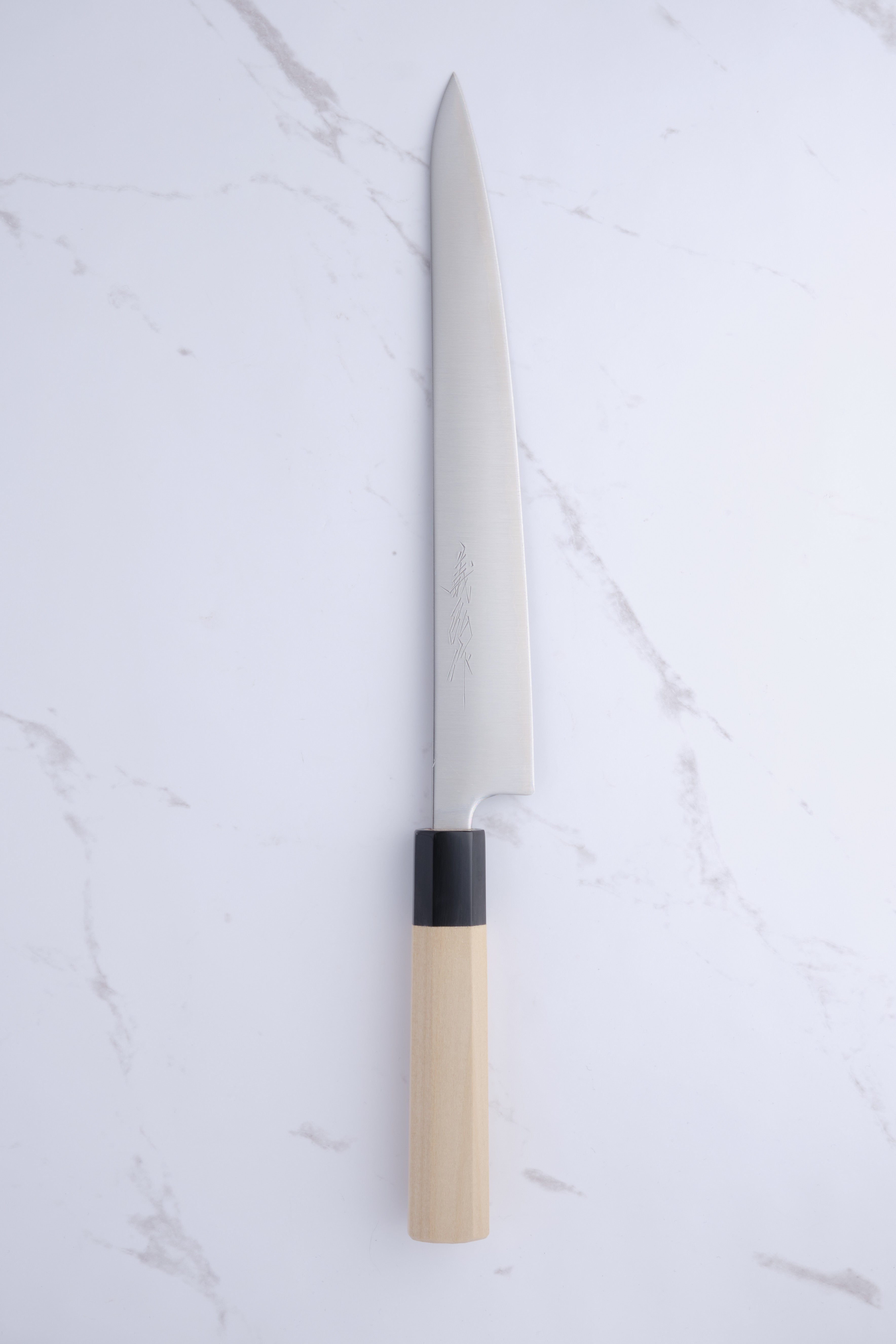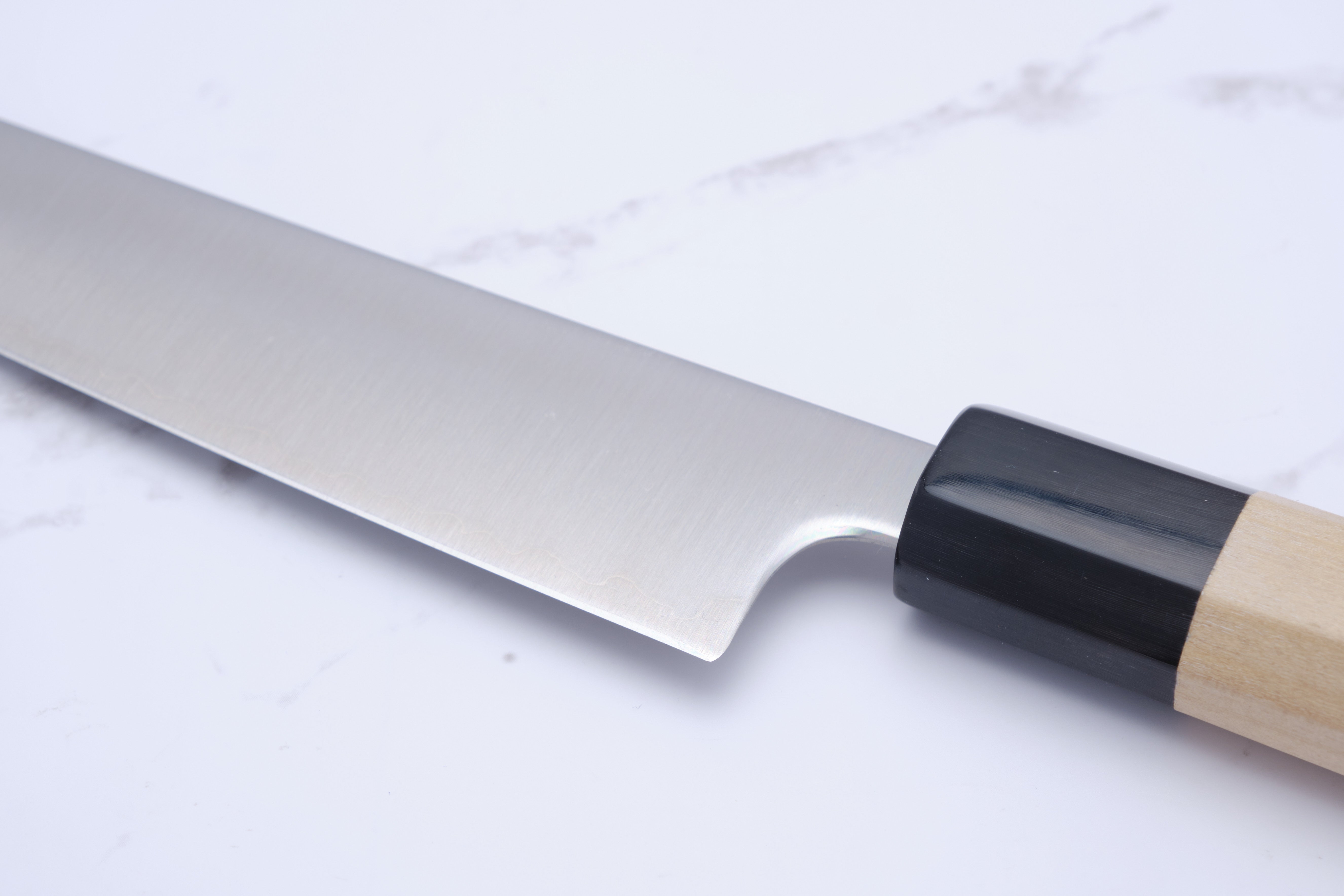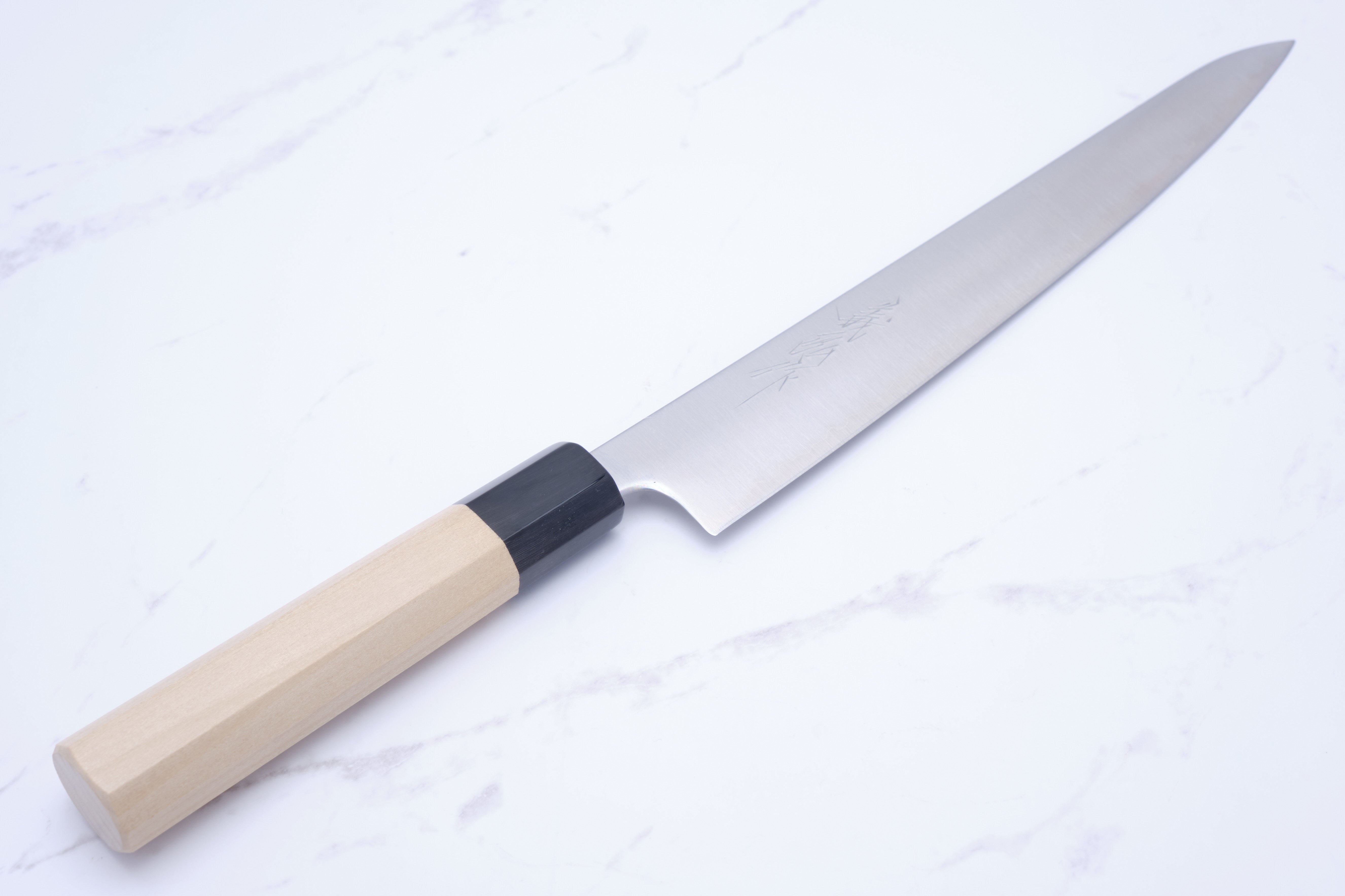 From Yamawaki Hamono comes this wonderful slicer in three layers of steel. The core steel is the coveted Aogami Super which rusts. On each side of the core is a layer of stainless steel which is easy to maintain