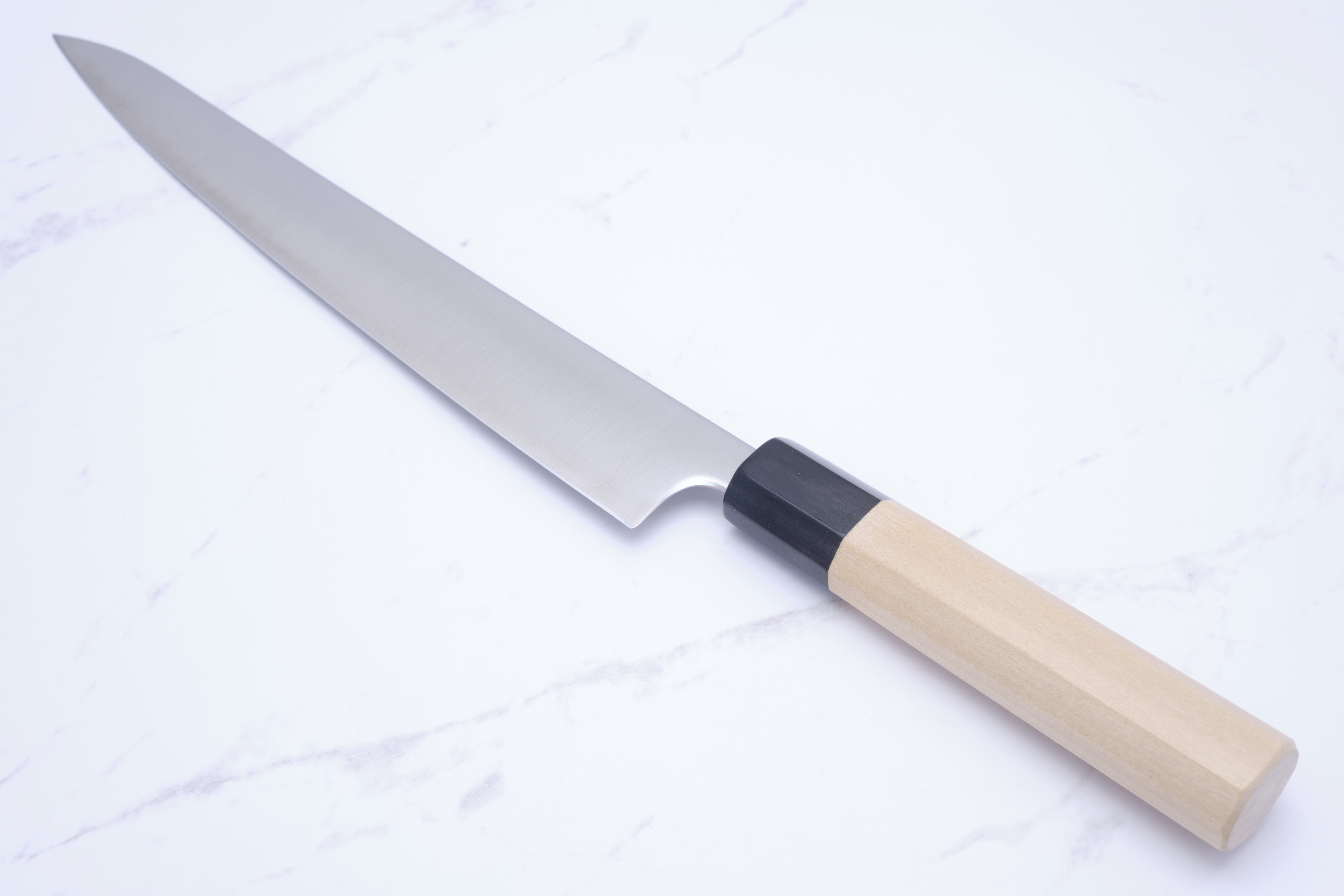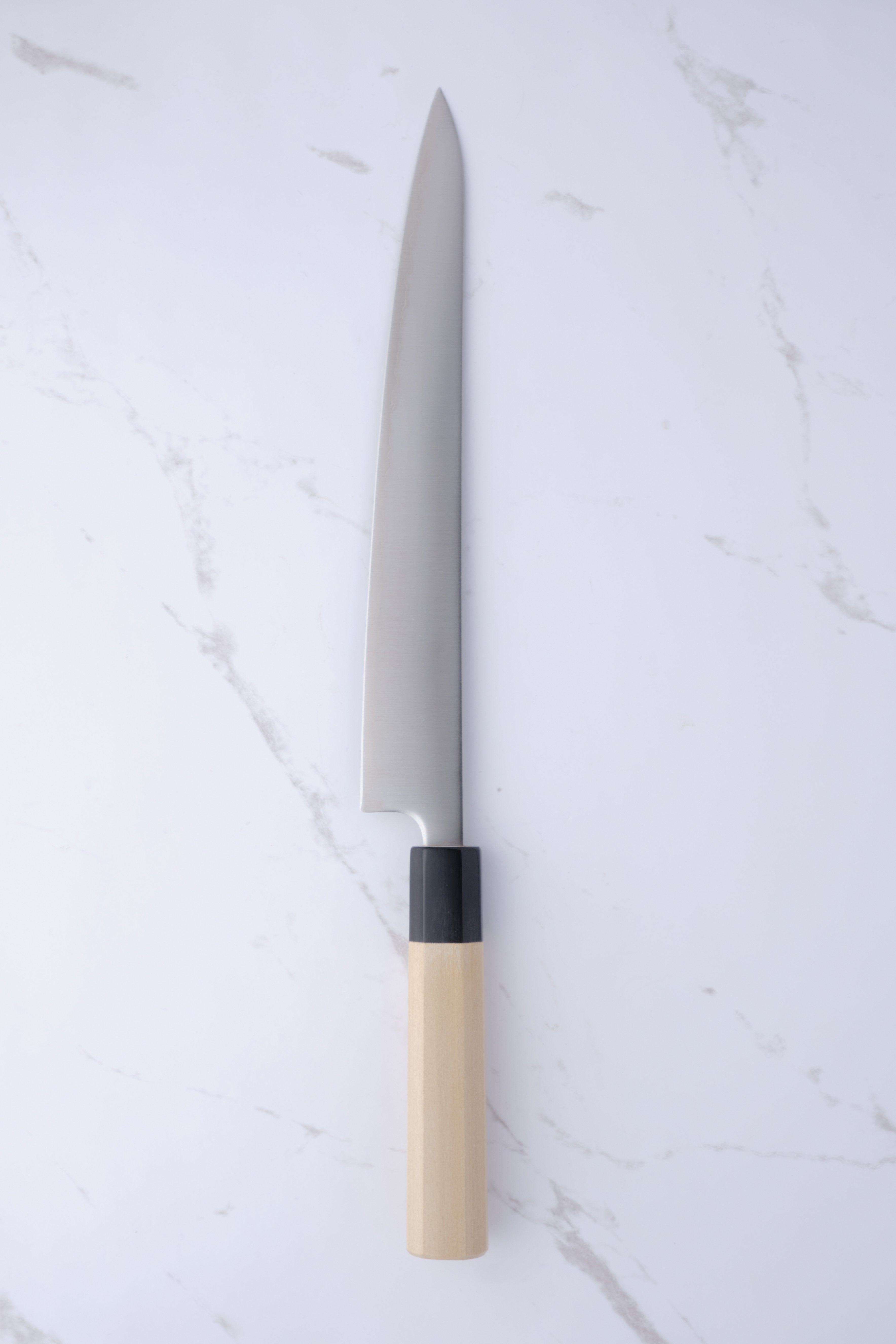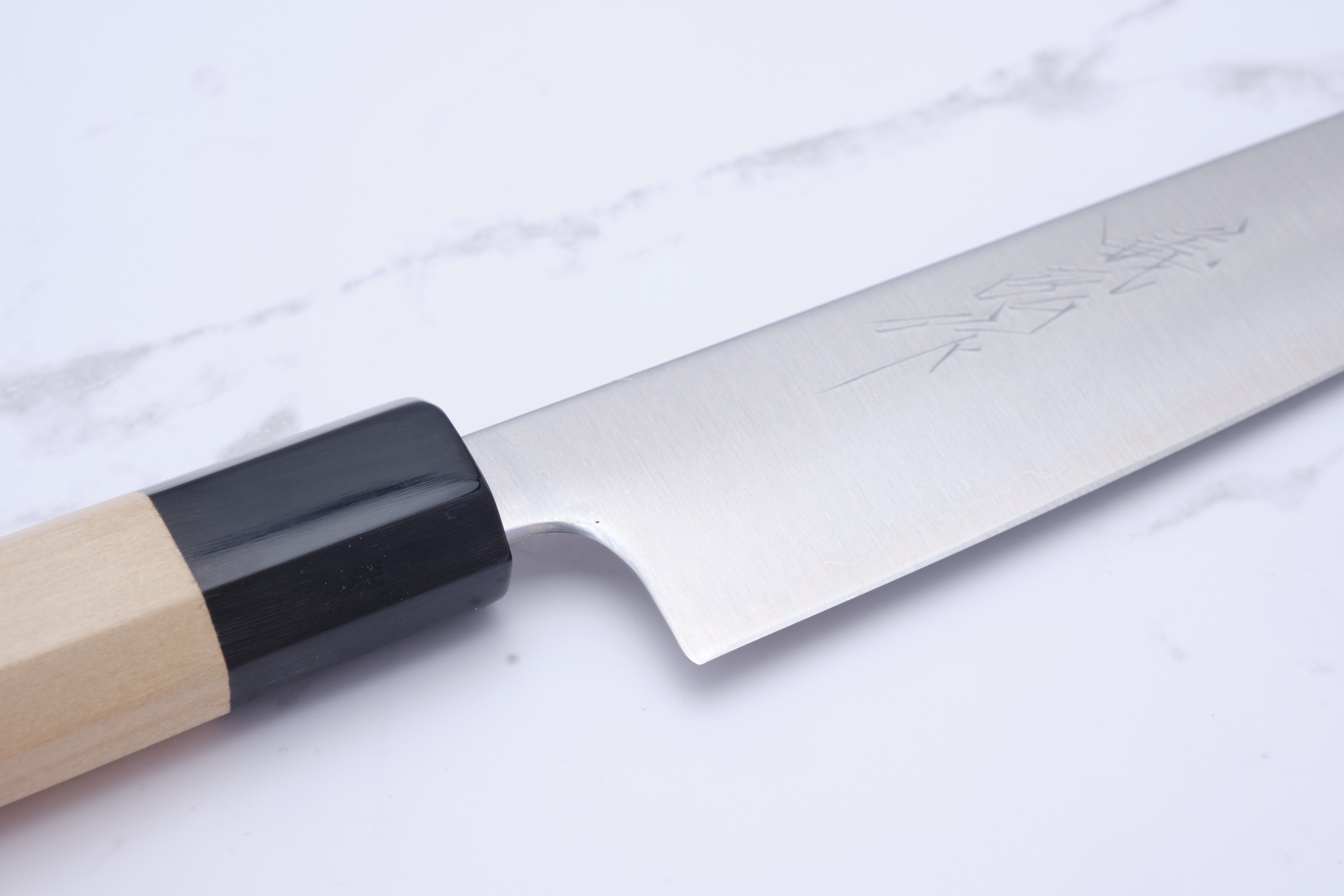 From Yamawaki Hamono comes this wonderful slicer in three layers of steel. The core steel is the coveted Aogami Super which rusts. On each side of the core is a layer of stainless steel which is easy to maintain