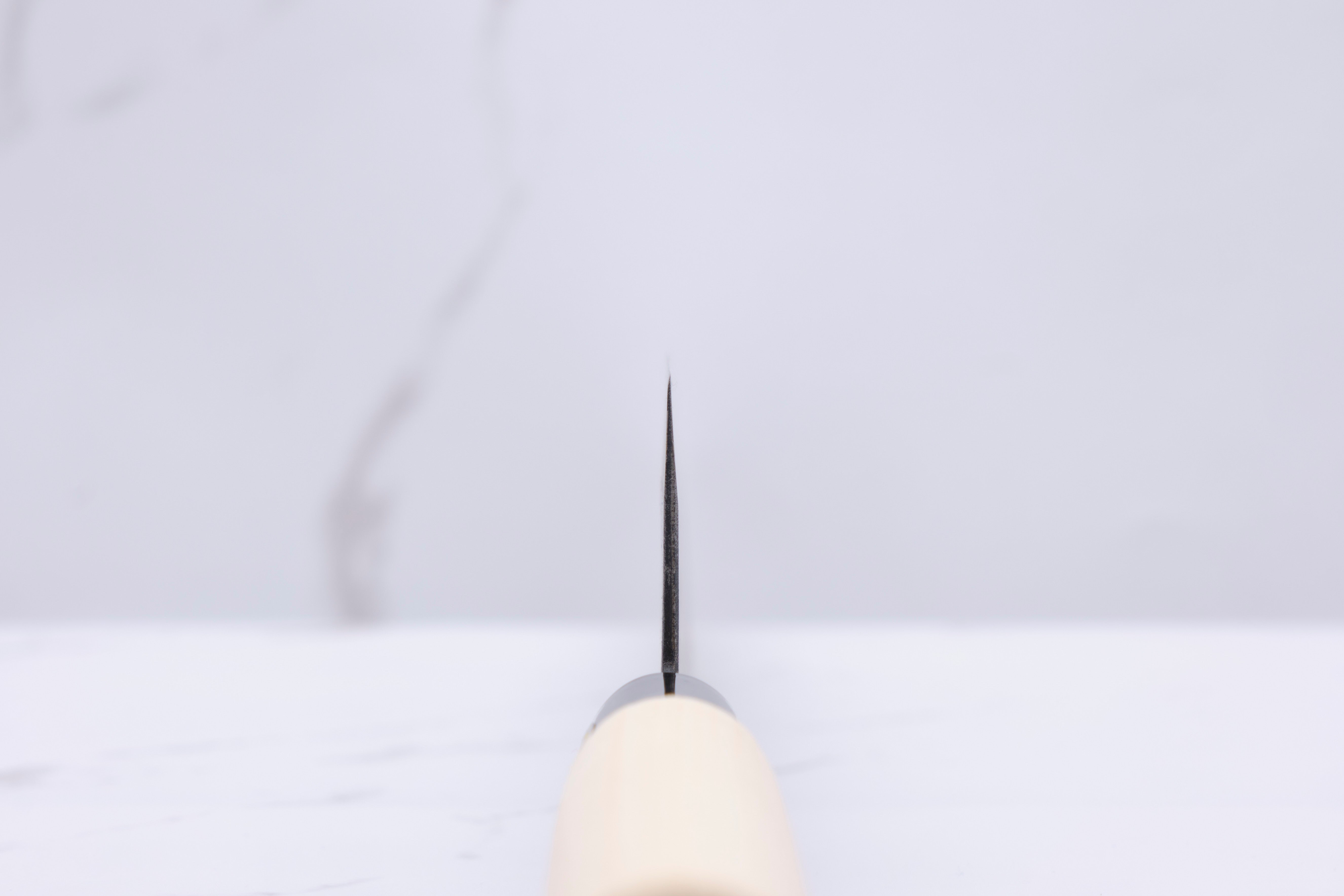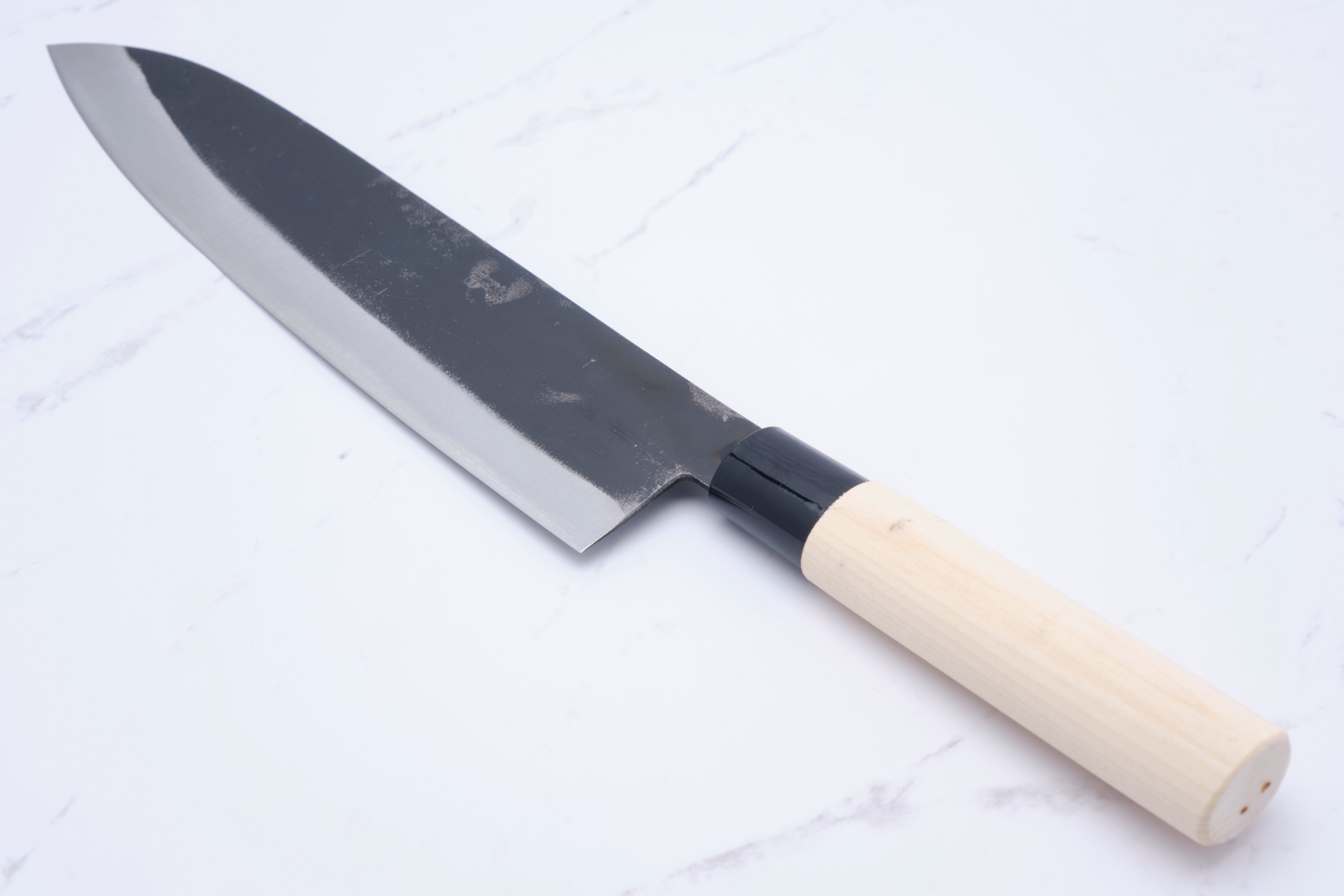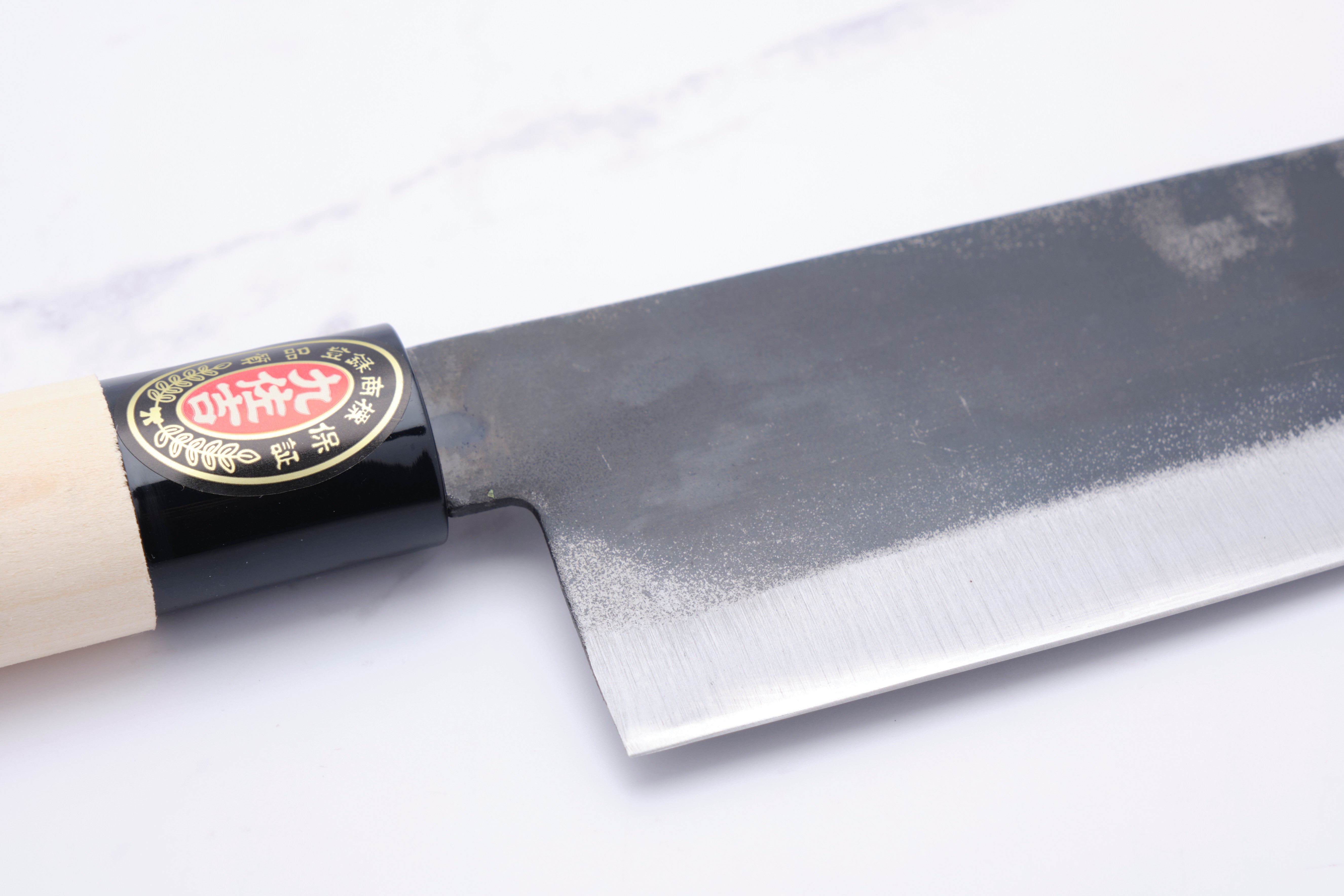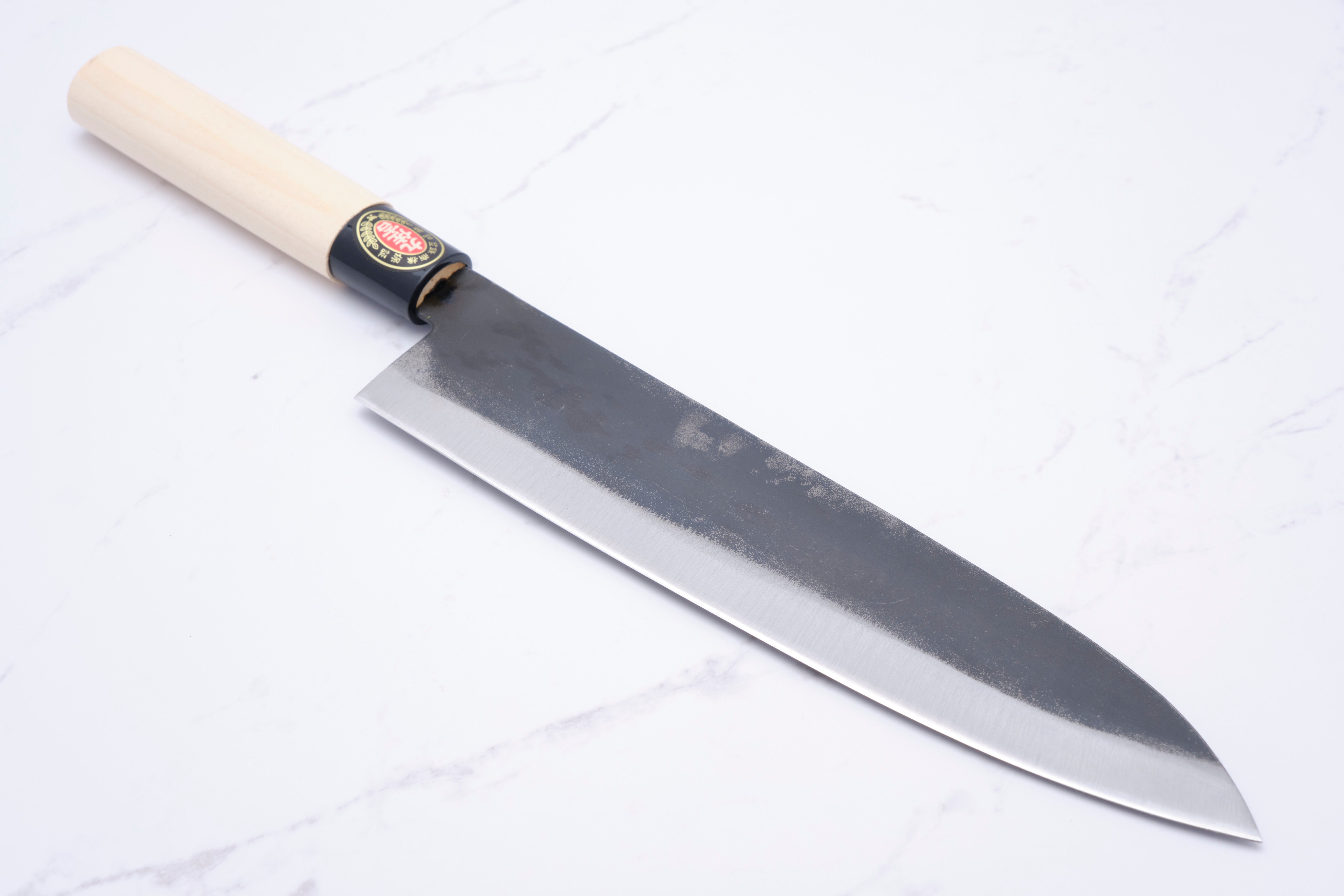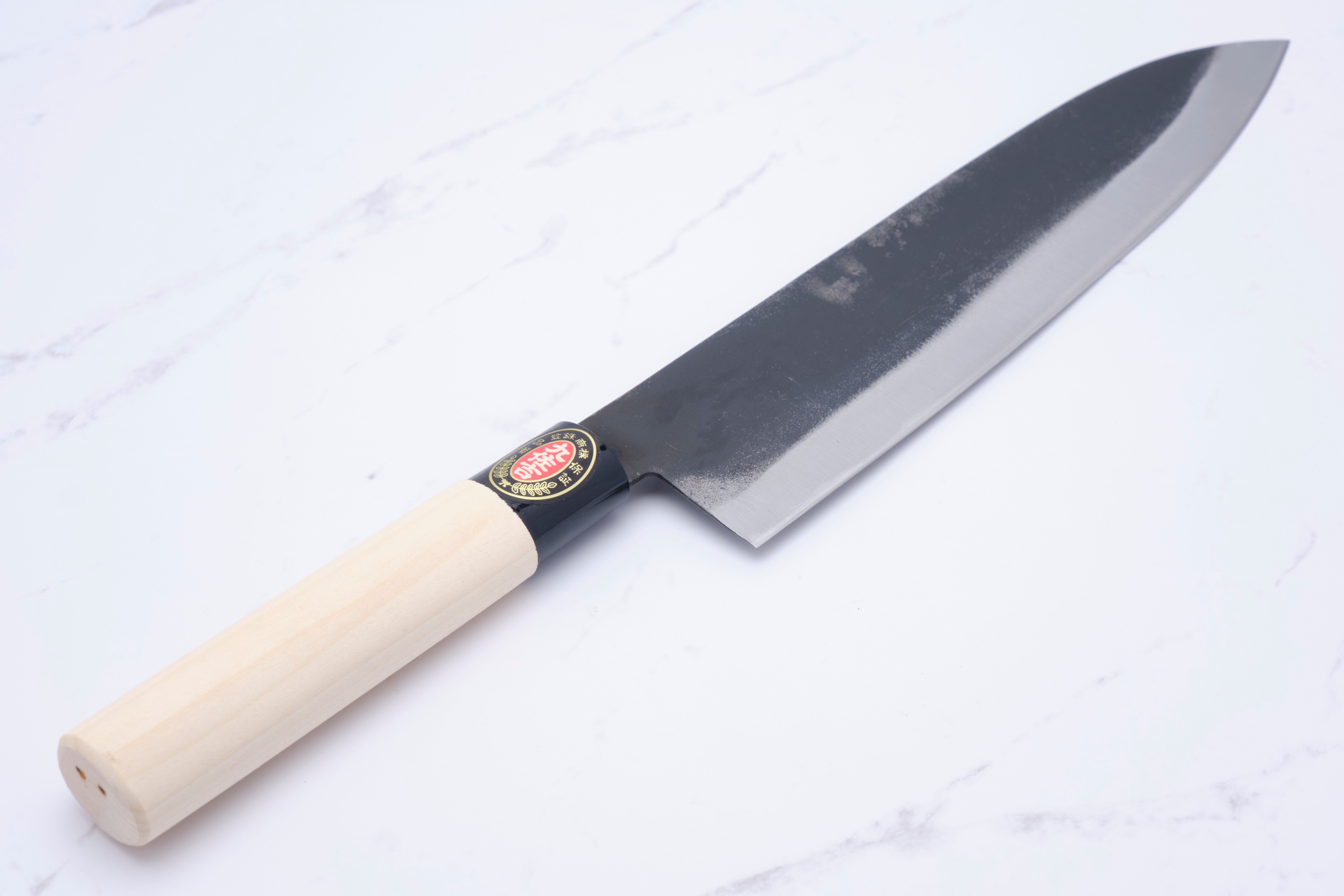 Yoshida 240 mm Chef's Knife Aogami-2 from Yoshida Hamono is an exceptional chef's knife that combines traditional craftsmanship with modern precision. This knife is made of 3-layer Blue #2 carbon steel and soft iron, ensuring exceptional sharpness and durability. With a hardness of 62-63 HRC, it is designed to handle even the most demanding tasks in the kitchen. The oval magnolia handle type provides a comfortable grip that makes it easy to work for longer. Whether you are a professional chef or a food enthusiast, this knife will be an indispensable tool in your kitchen.