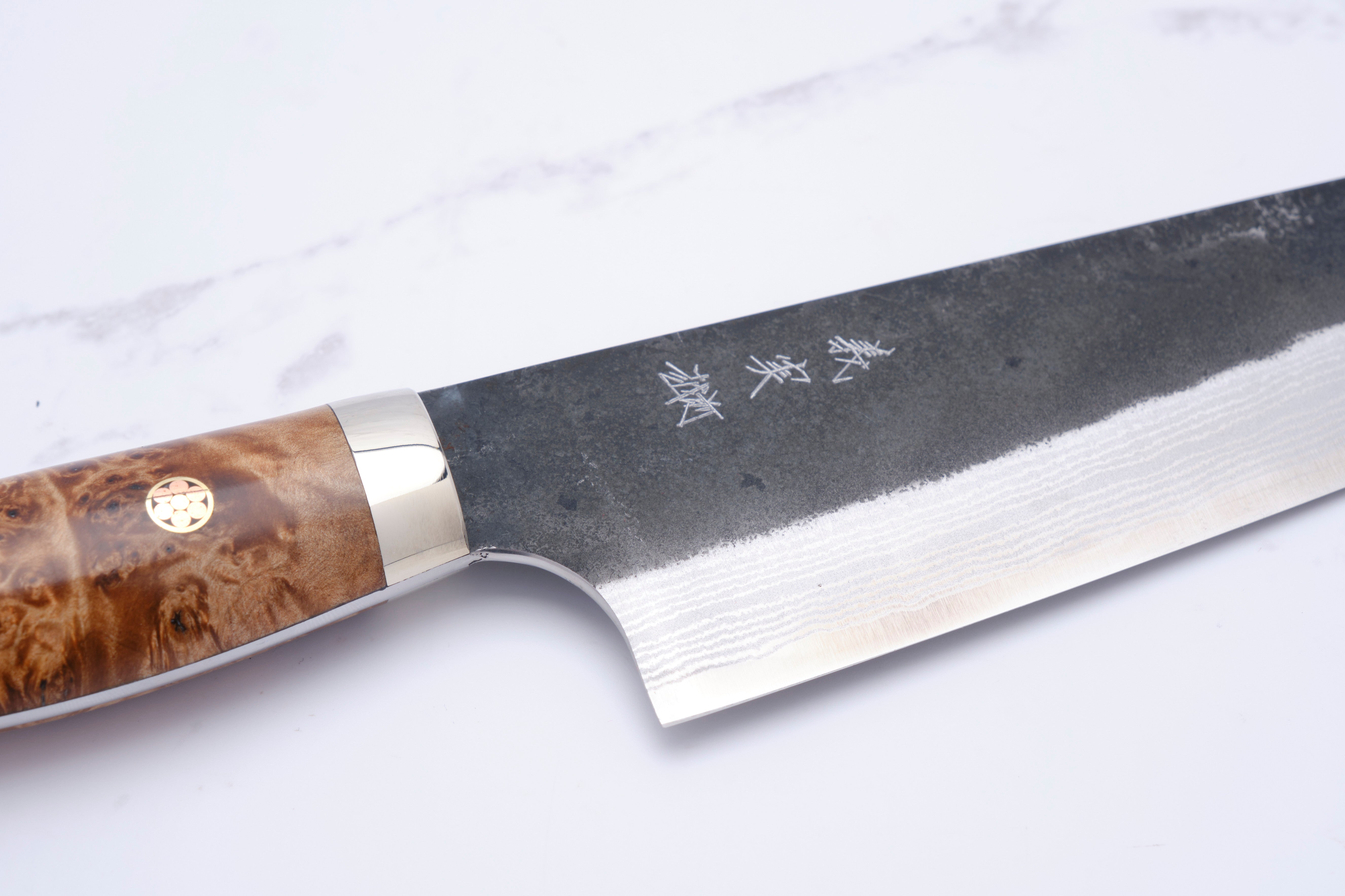 This knife is a 180mm Santoku with Aogami Super (Blue Super) as core steel, surrounded by a beautiful kurouchi at the top of the blade, and Yoshimi-san's incredibly beautiful Damascus cladding further down towards the blade. The stock is custom western-style made of maple knot.