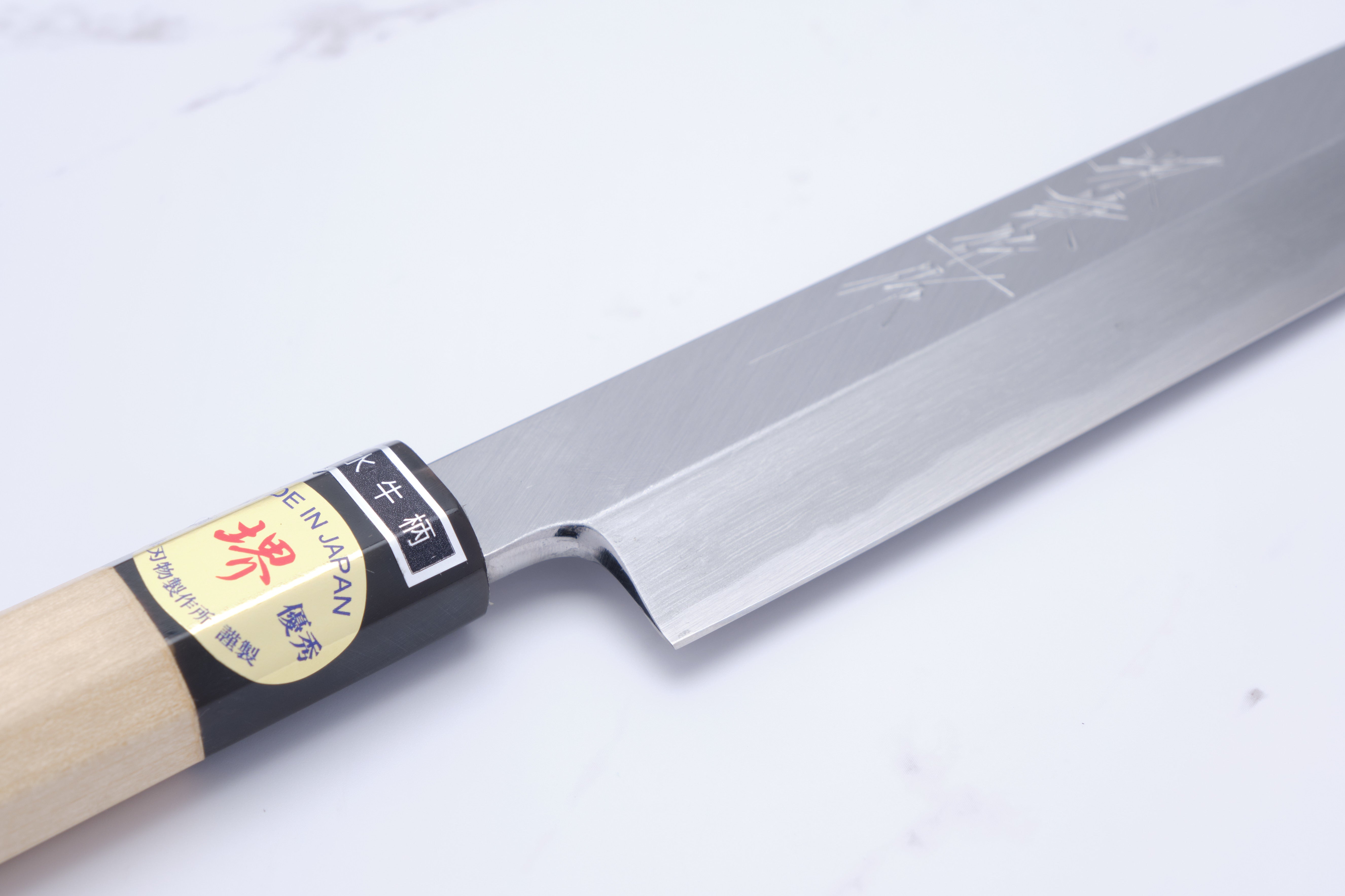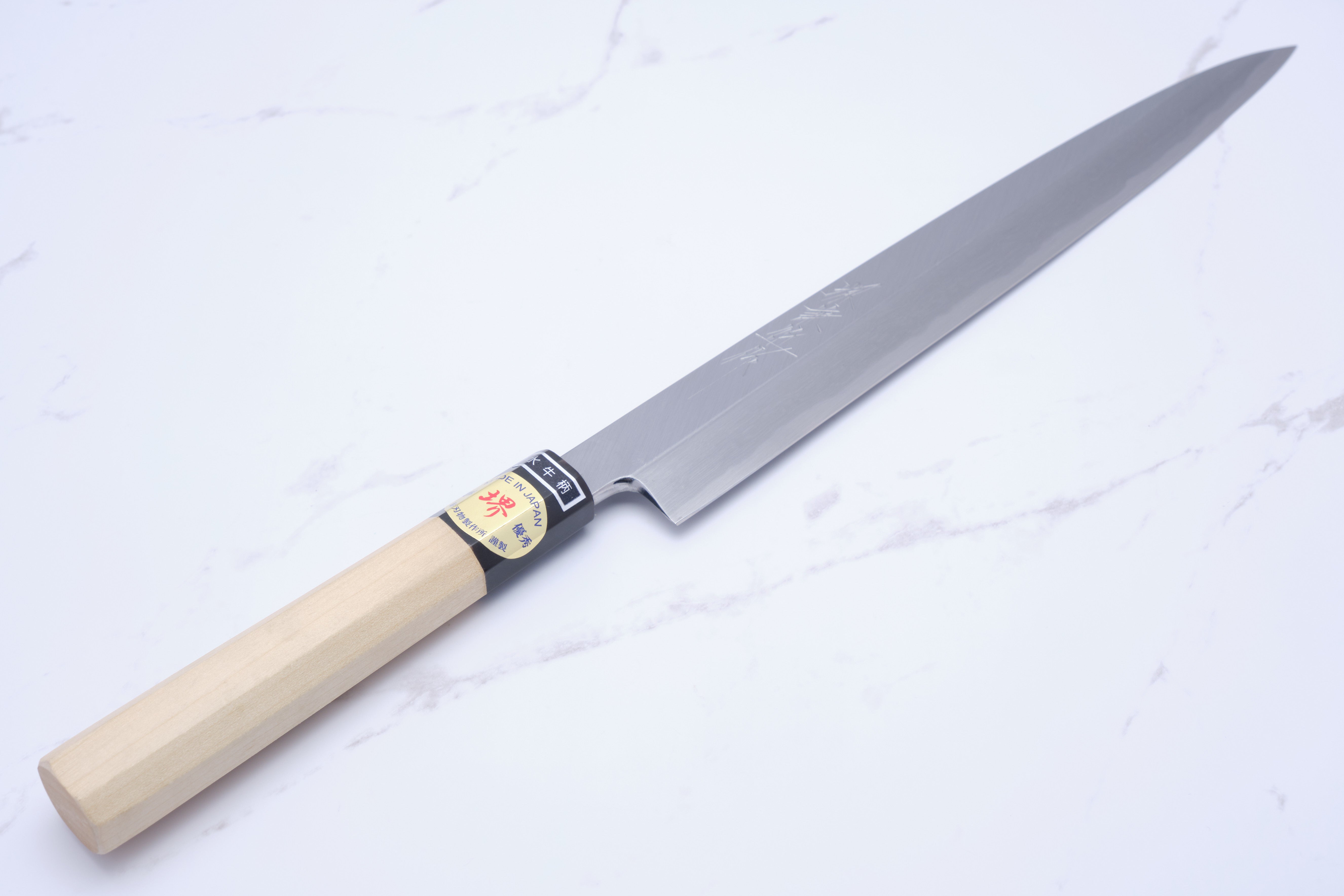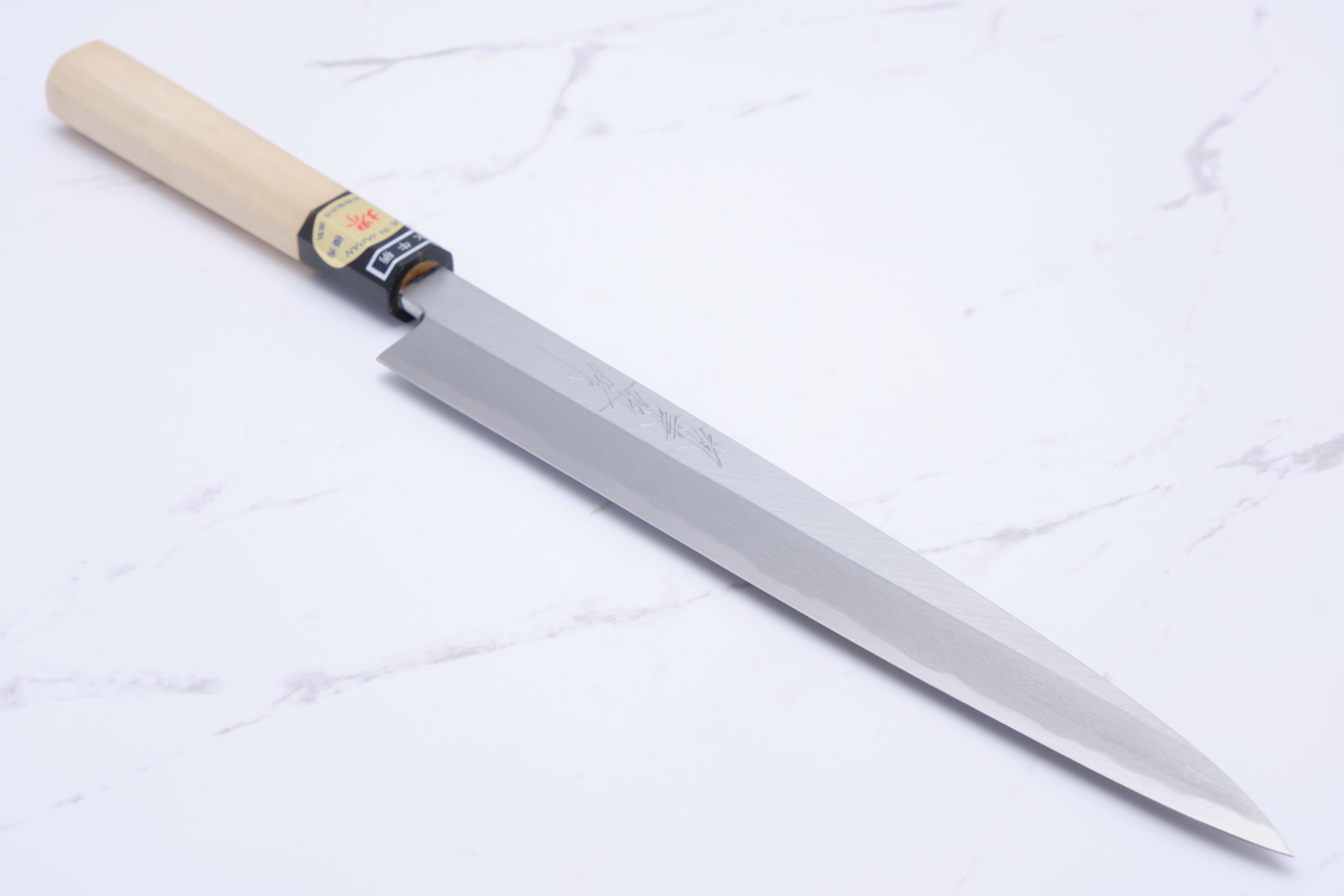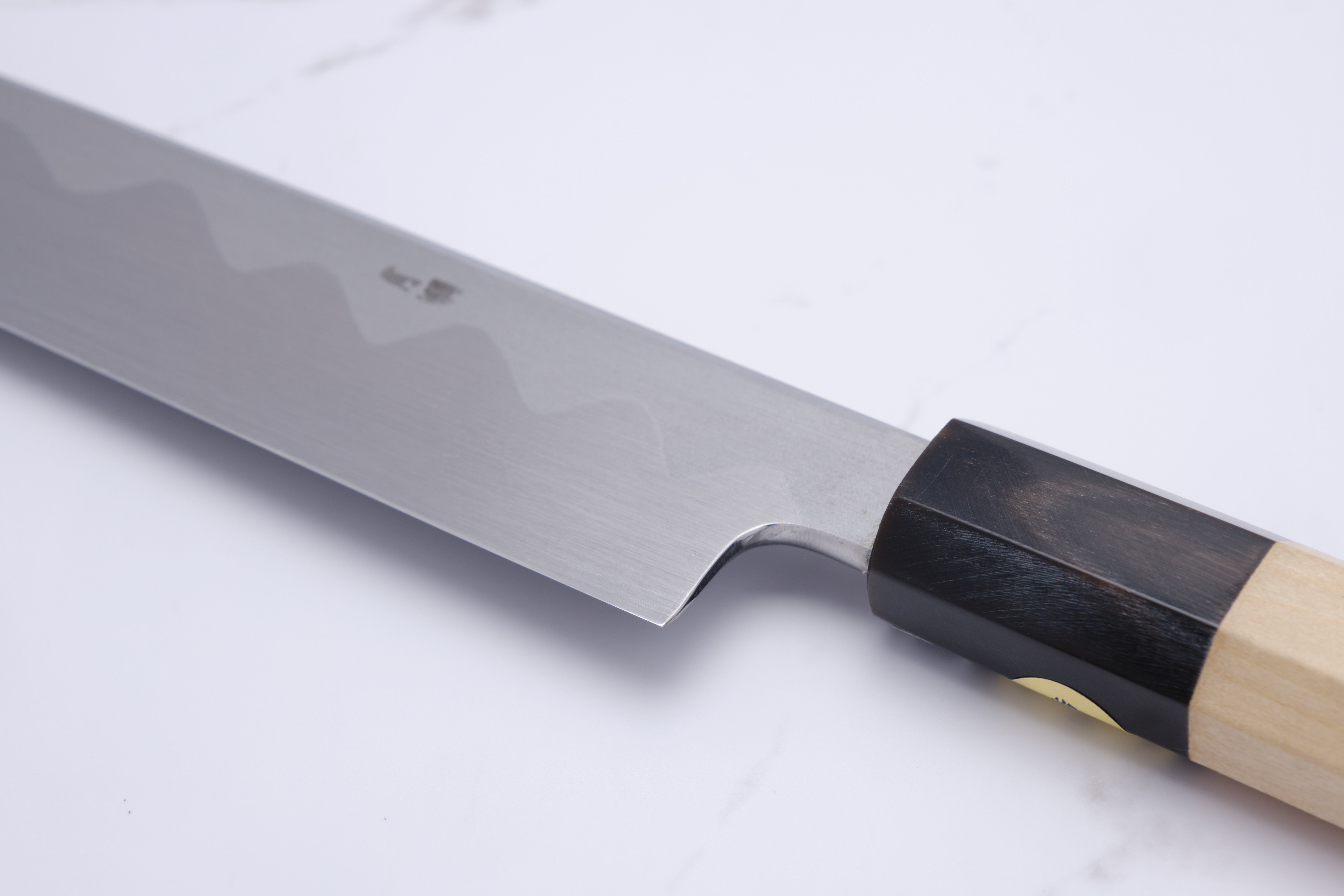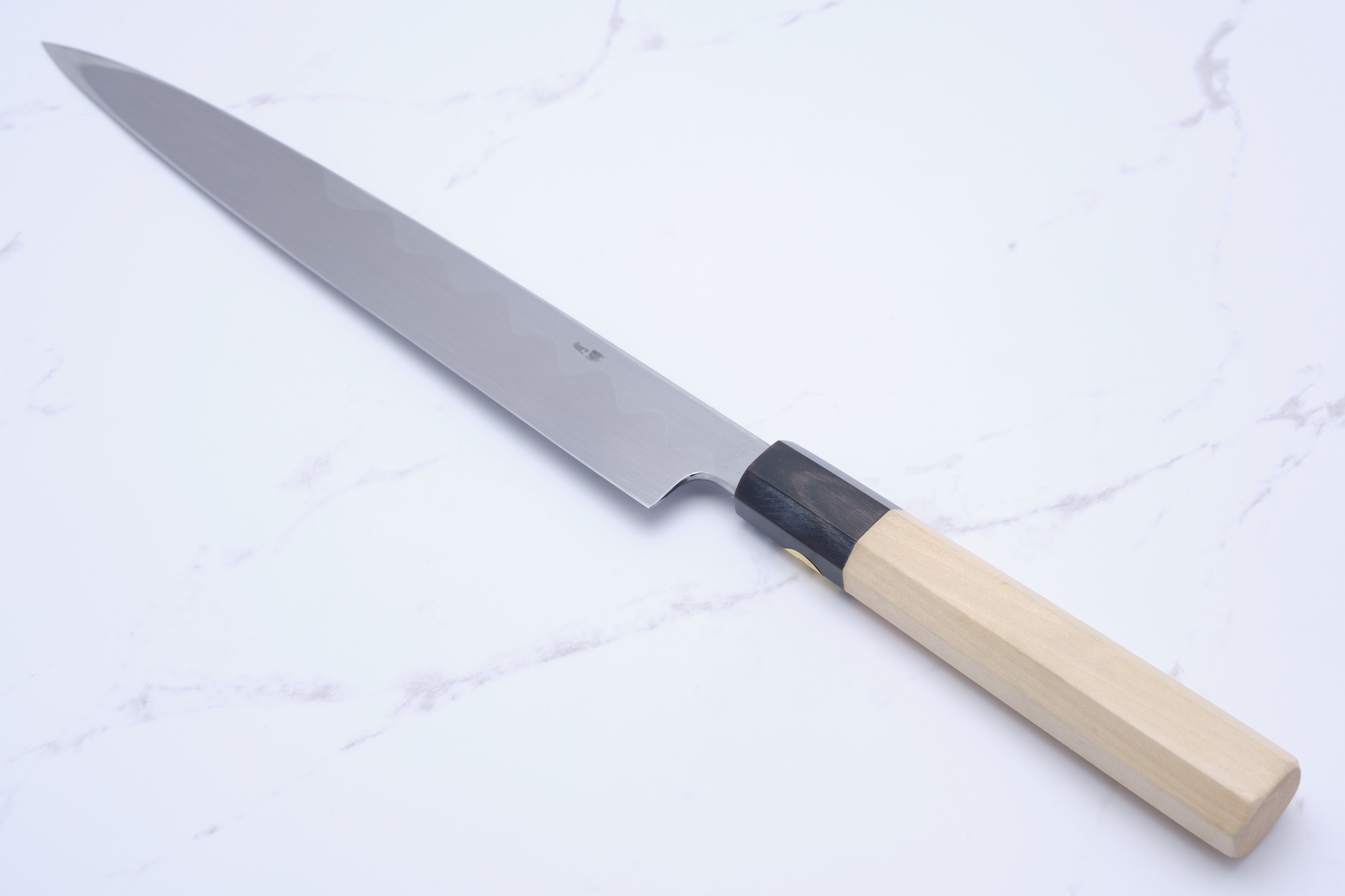 Yanagibaen er tiltænkt udskæring af fisk til sashimi og sushiruller. Modellen her er den helt klassiske i to lag stål med hård kerne og blød ryg. Kernestålet her er aogami 2, dvs. blåt stål, hvilket er en legering, der ruster, men som samtidigt har et meget højt potentiale for skarphed.