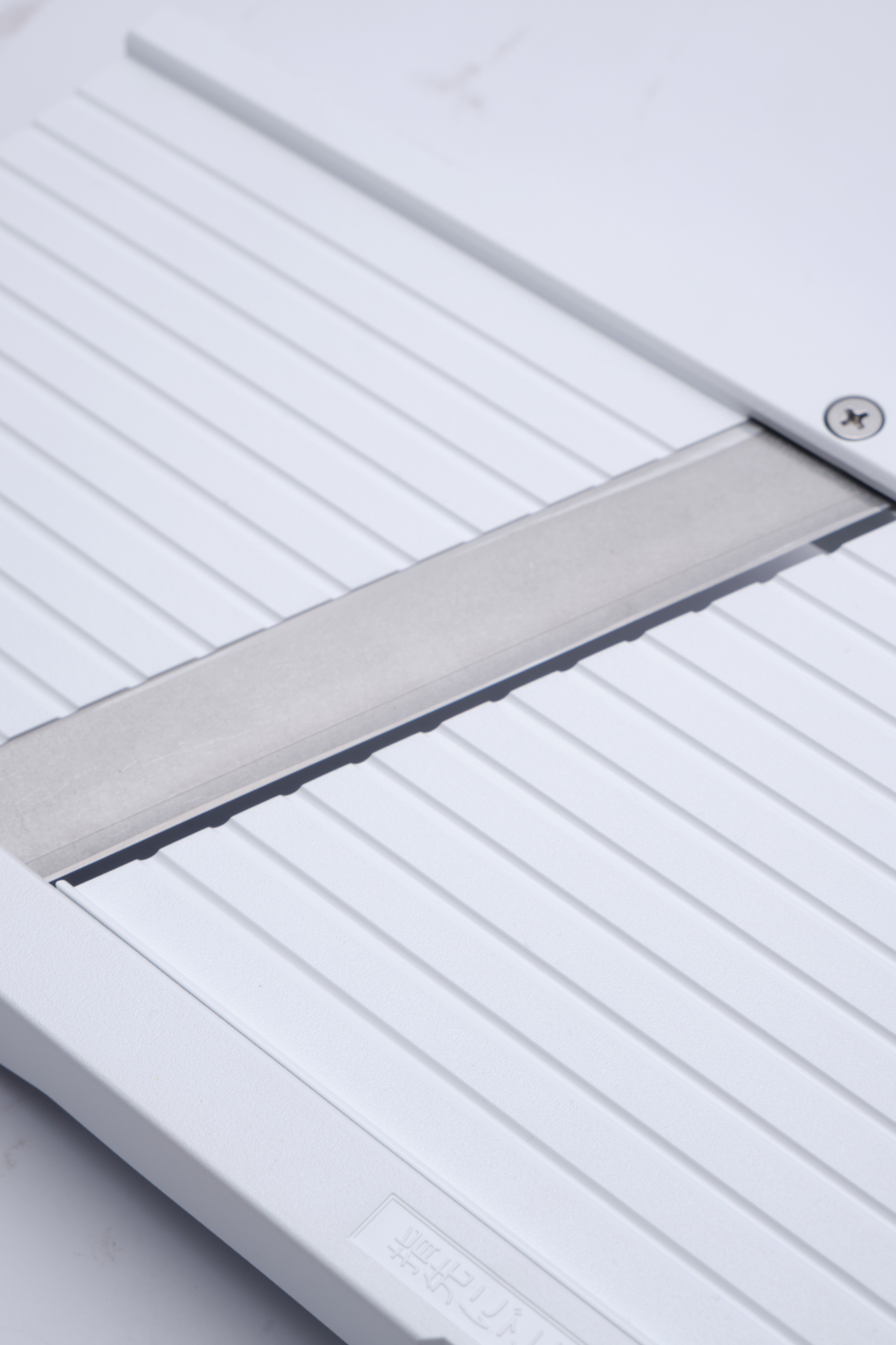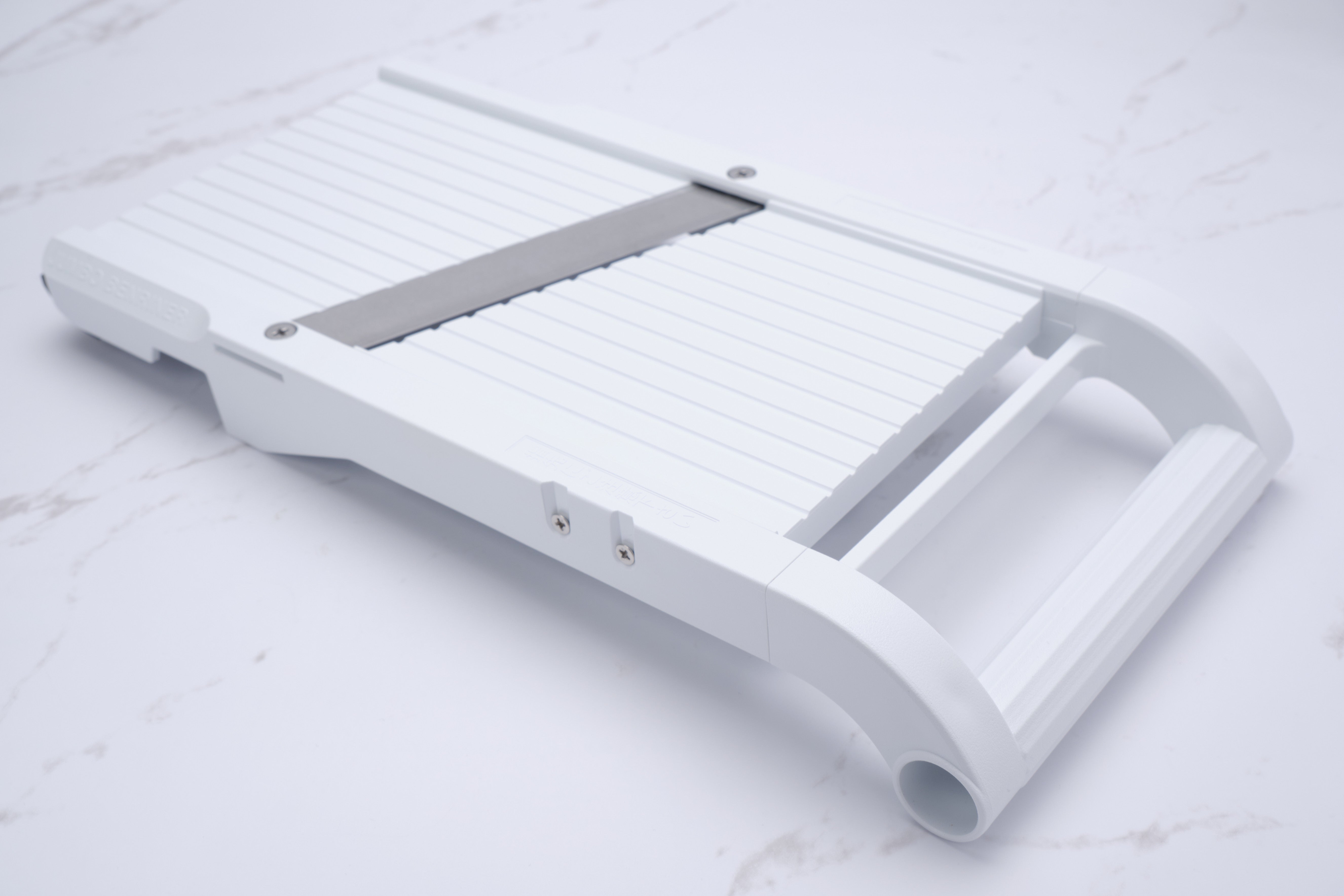 Klingen kan afmonteres ved at løsne de to skruer for oven. Tykkelsen af det afskårne justeres med et drejehjul på undersiden af mandolinjernet, og det giver mulighed for at skære i tykkelser fra 0,5 til 10 mm. Der er ligeledes en skridsikker belægning på undersiden af mandolinjernet så det kan stå fast på underlaget.