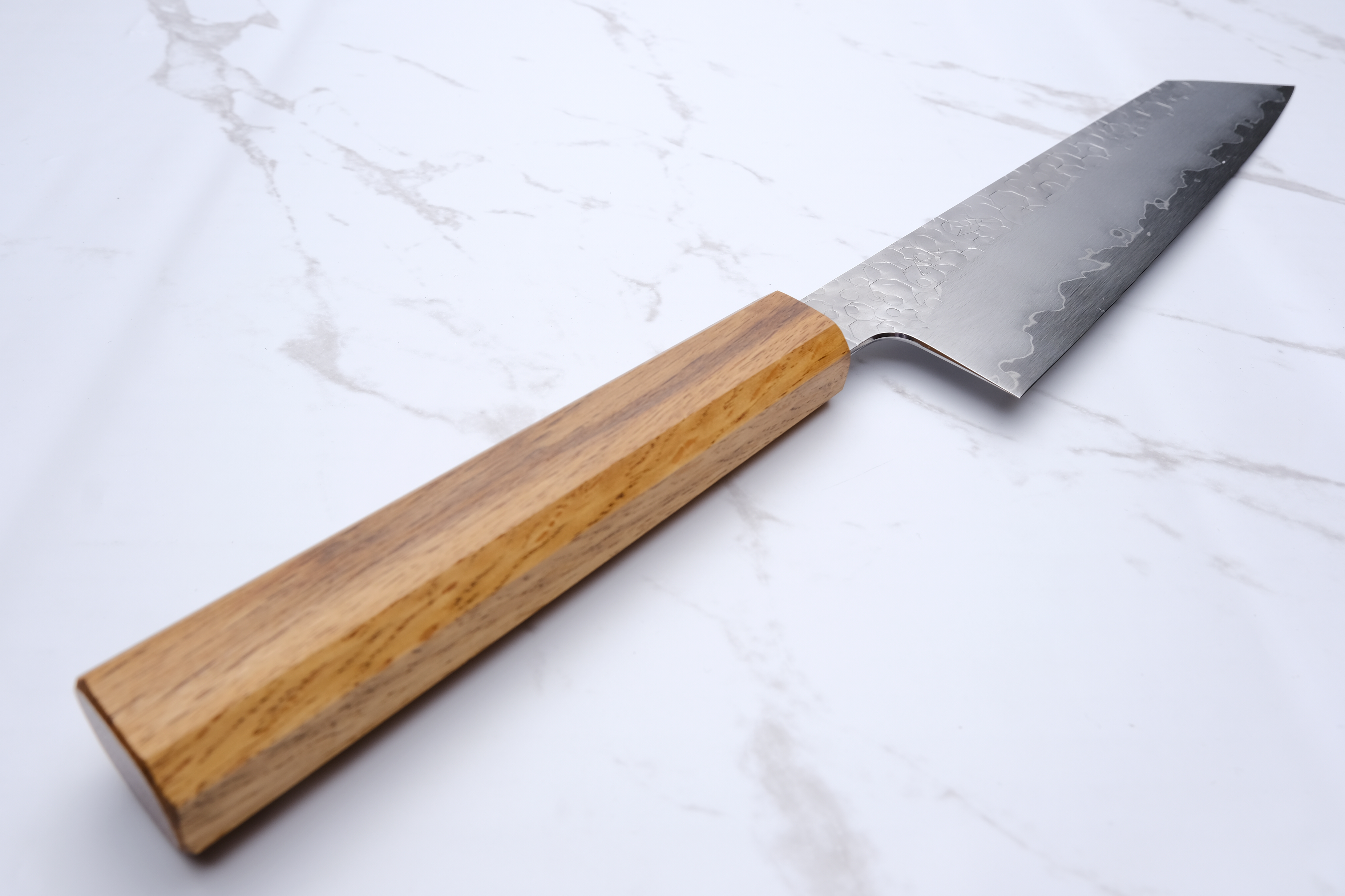 Grindet er virkelig veludført. Den er virkelig tynd bag æggen og skærer selvfølgelig fantastisk. Fit&Finish er som vi kender fra Hado - altså suverænt. Poleret ryg og choil, flot polering og en smuk tsuchime finish på toppen af klingen.