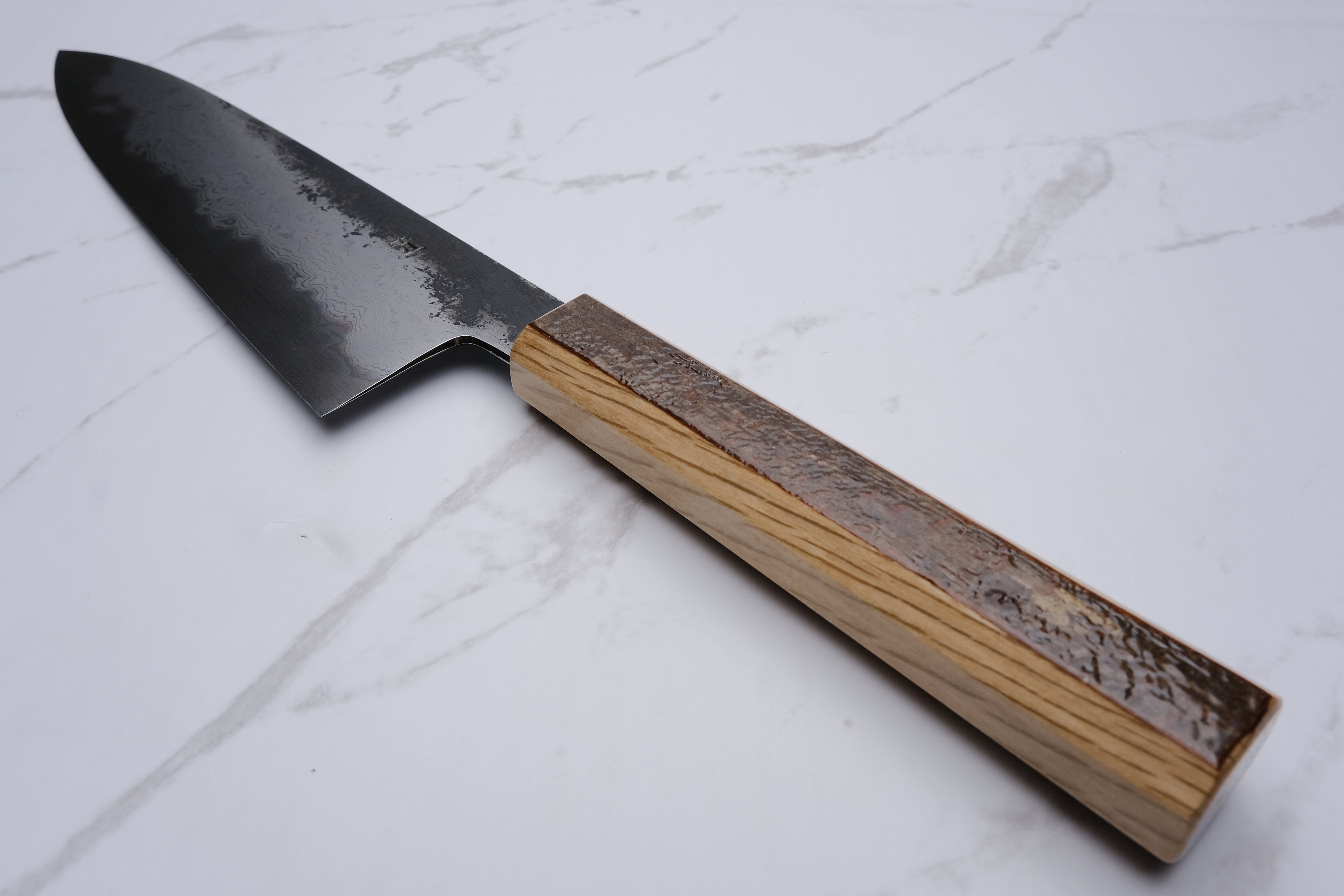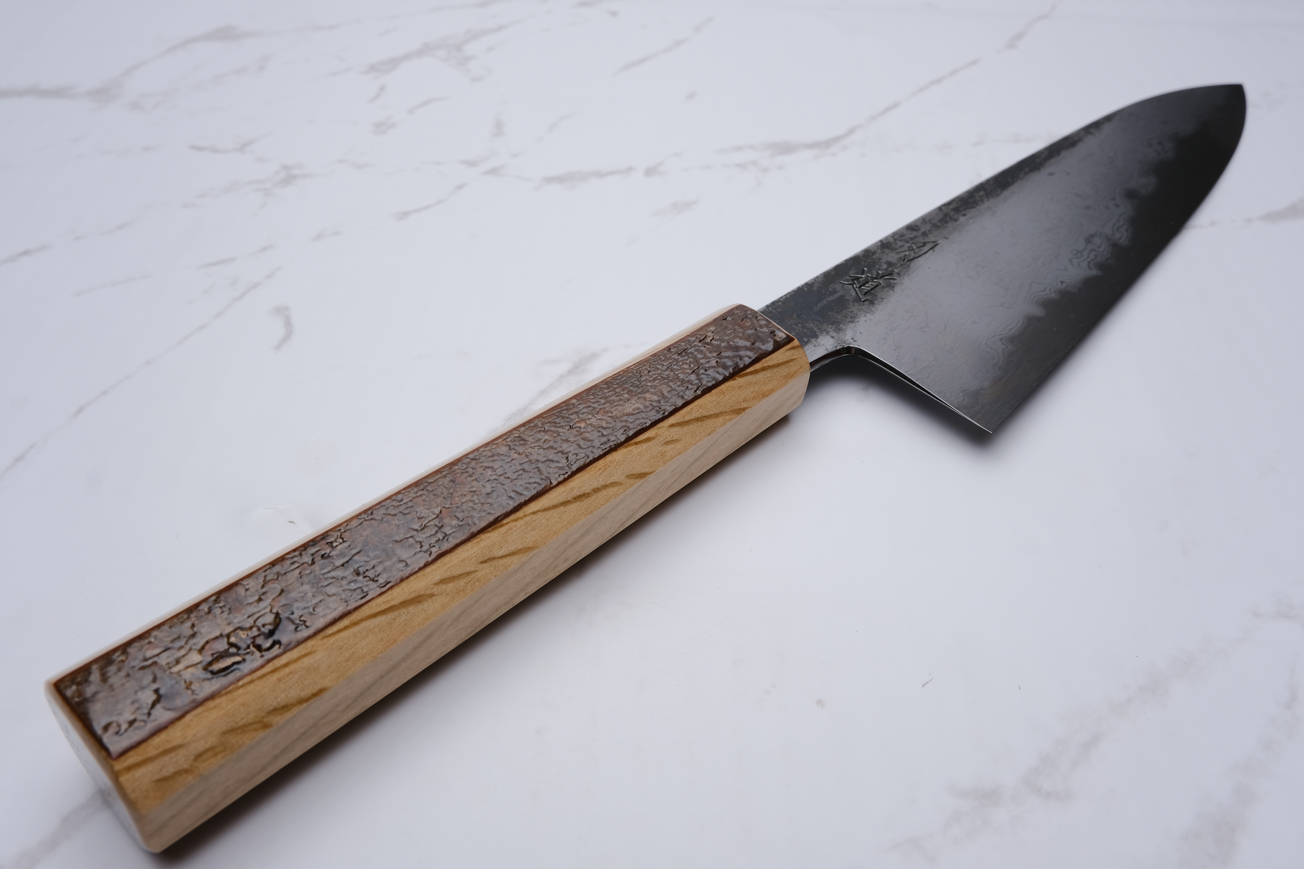 Disse knive er lavet af netop de 2 overnævnte herrer. Tanaka-san har bygget kniven i 3 lag med Aogami #1 i kernen og omringet damaskus cladding af blødt jern.