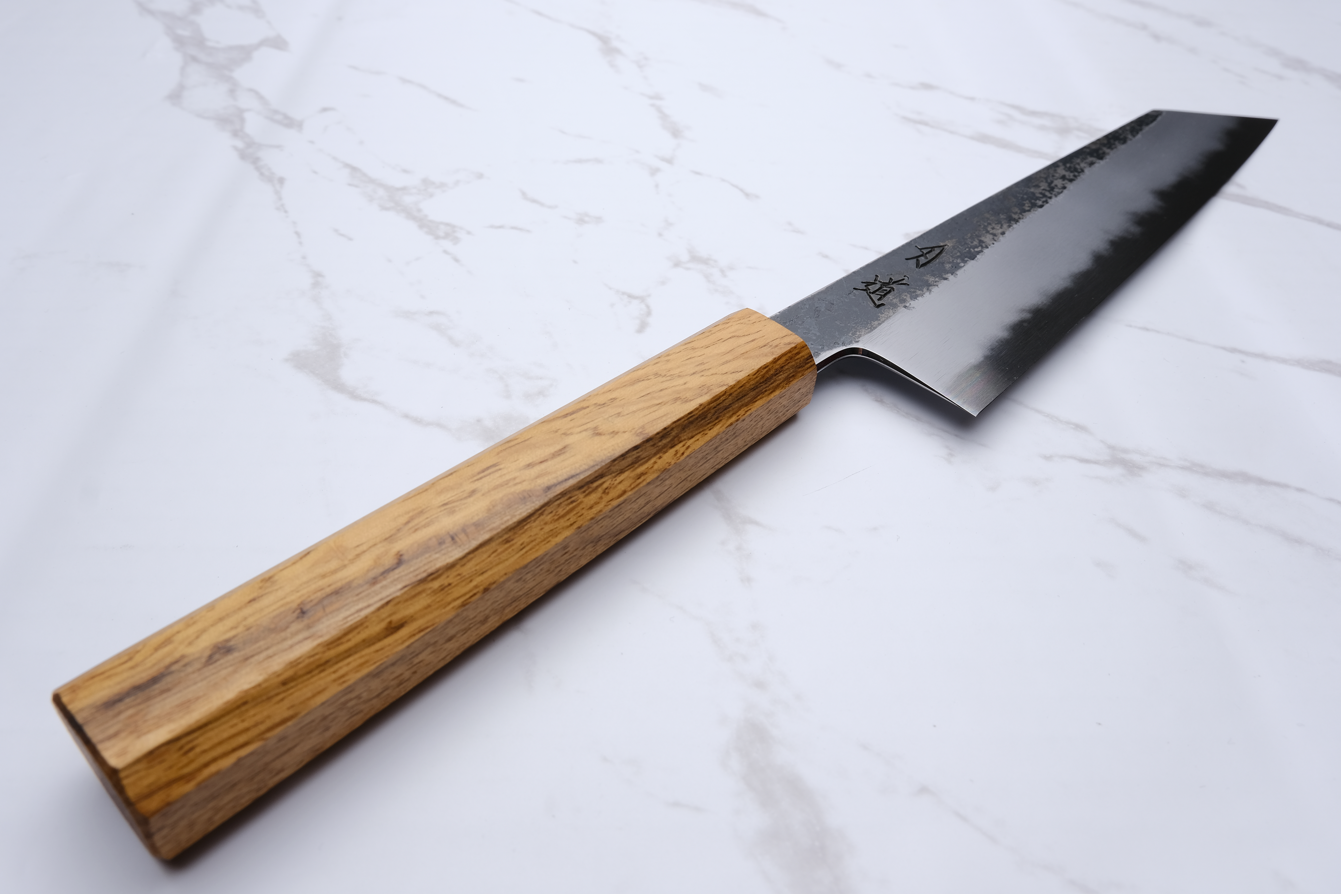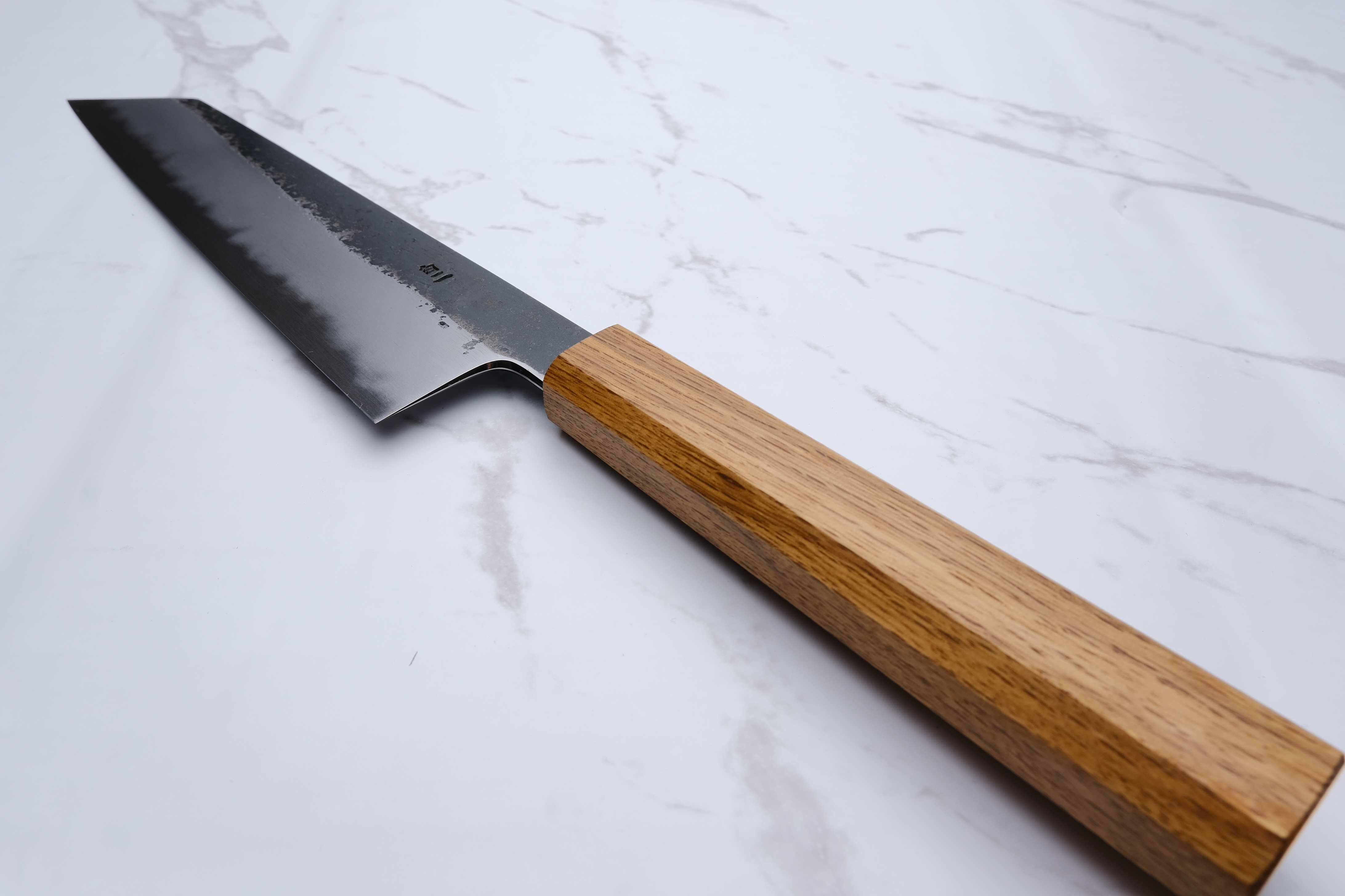 Disse knive er lavet af netop de 2 overnævnte herrer. Tanaka-san har bygget kniven i 3 lag med Shirogami #2 i kernen og omringet af blødt jern.