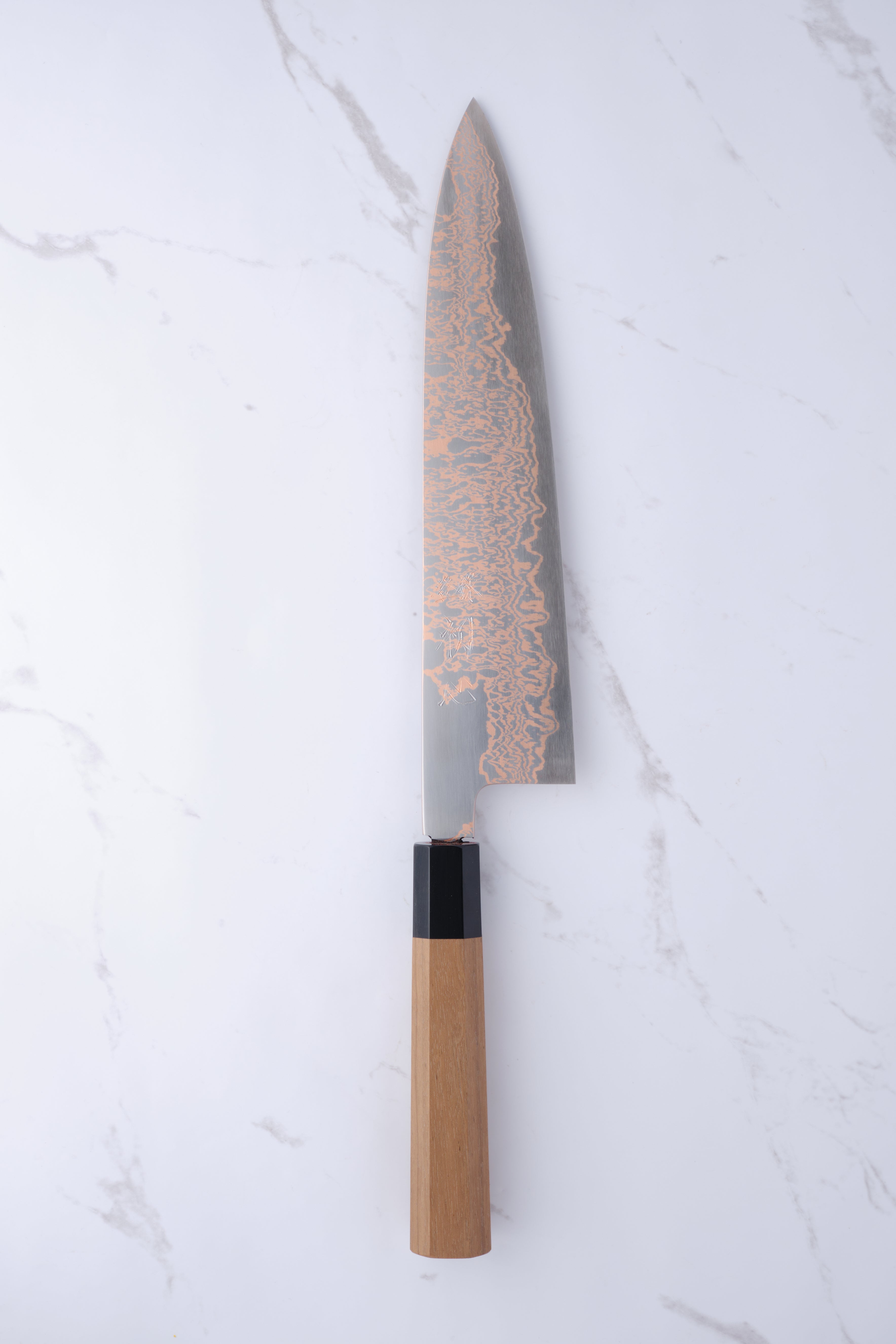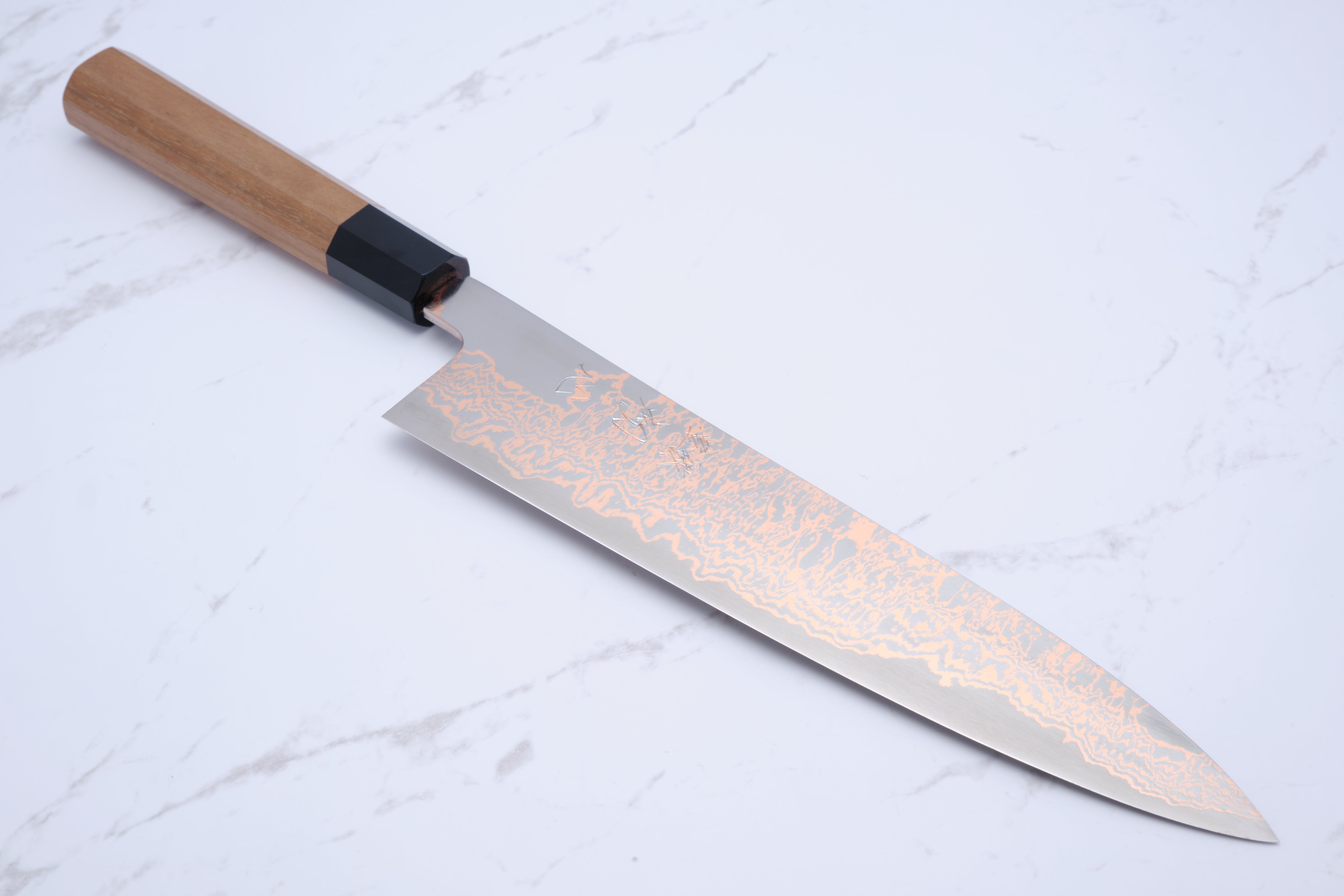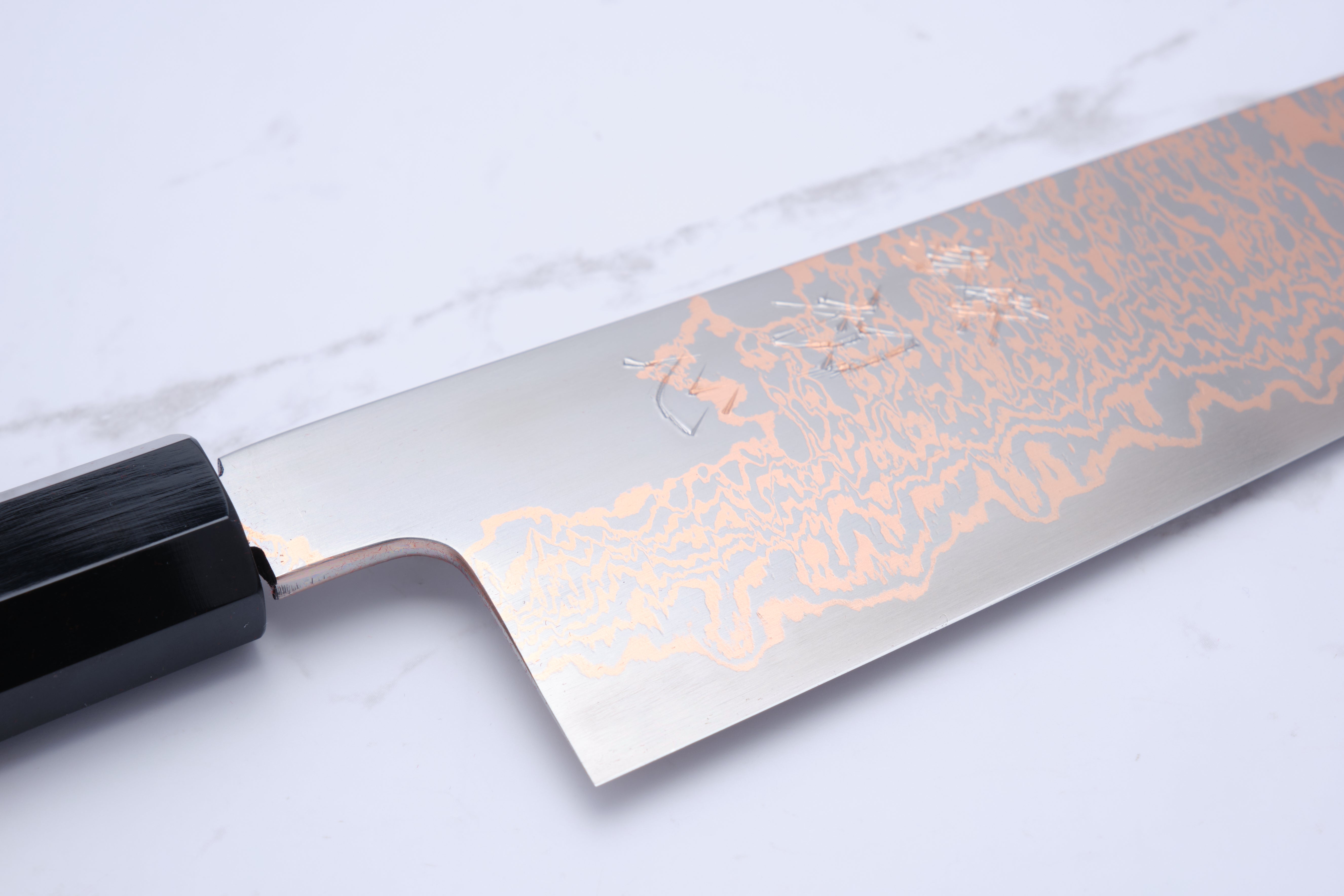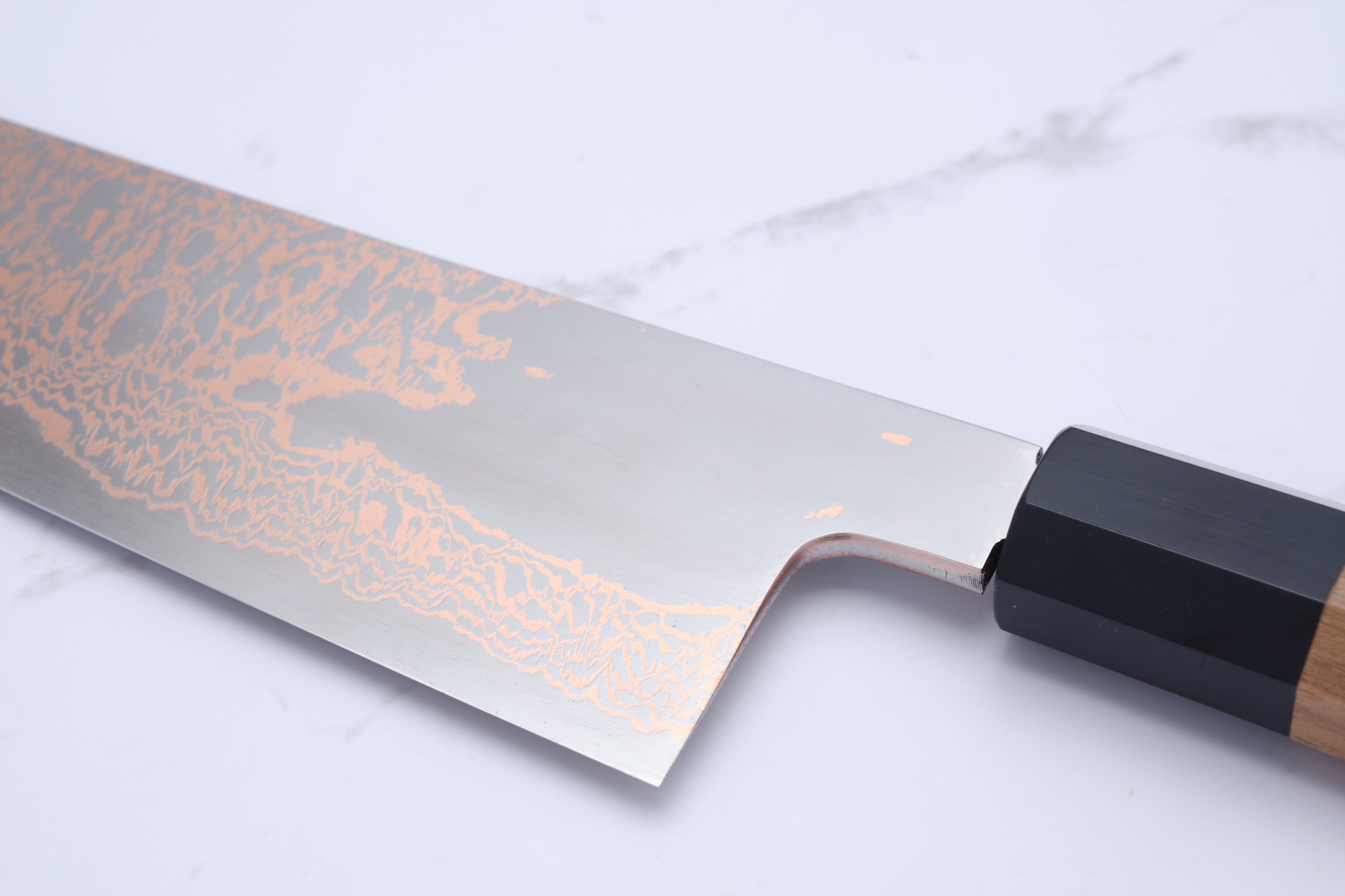 Hatsukokoro Yorokobi 240 mm Gyuto er en exceptionel kokkekniv, der kombinerer traditionelt japansk håndværk med moderne design. Denne kniv er fremstillet med en kerne af SLD stål, der sikrer enestående skarphed og holdbarhed, mens det bløde kobber damascus udenom giver et smukt og unikt udseende. Med sin 24 cm lange klinge er denne gyuto ideel til en bred vifte af køkkenopgaver, fra snitning af grøntsager til skæring af kød. Kniven er ikke rustfri, hvilket betyder, at den kan udvikle en patina over tid, men den er let at vedligeholde og slibe, hvilket gør den til et fremragende valg for både professionelle kokke og madentusiaster.