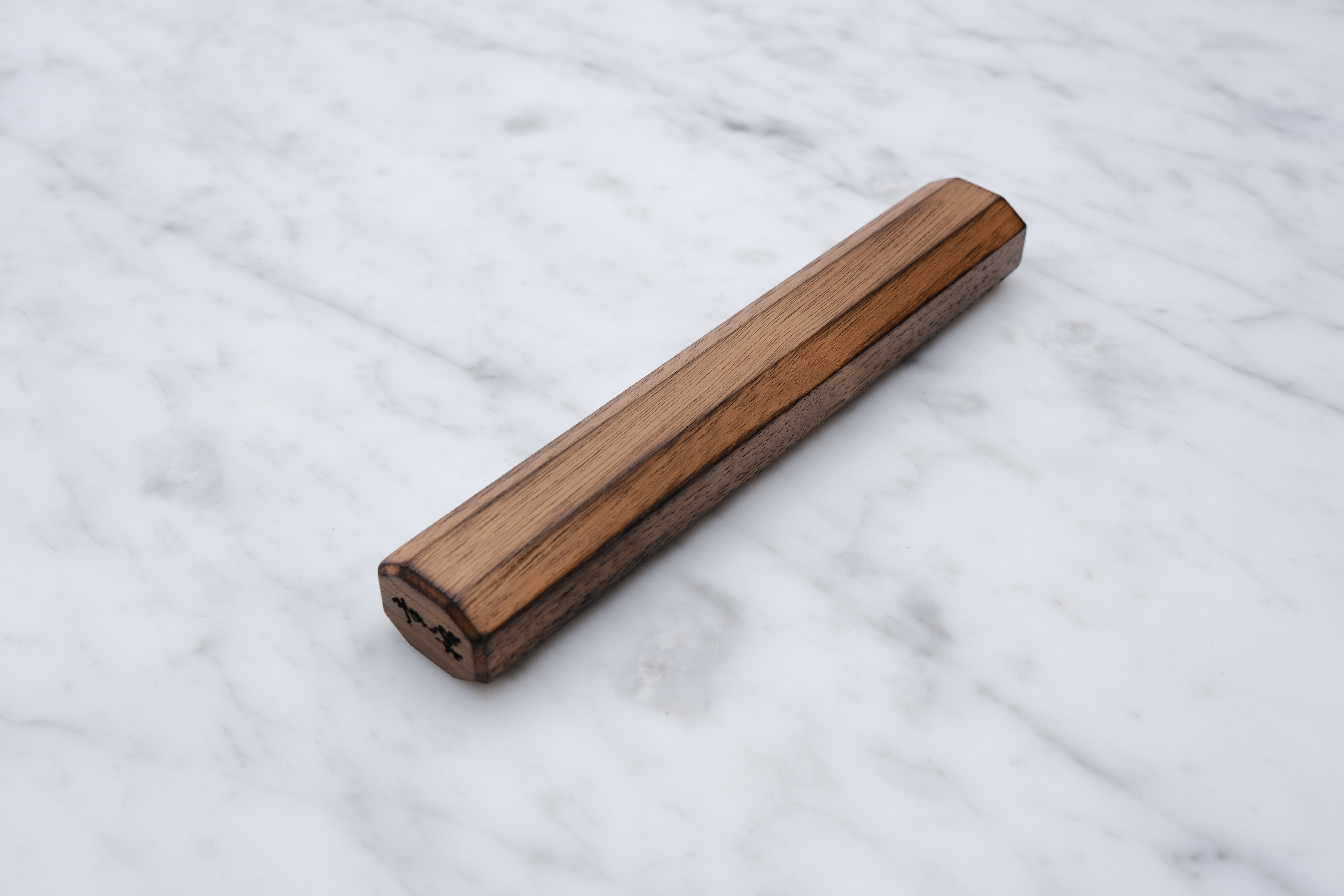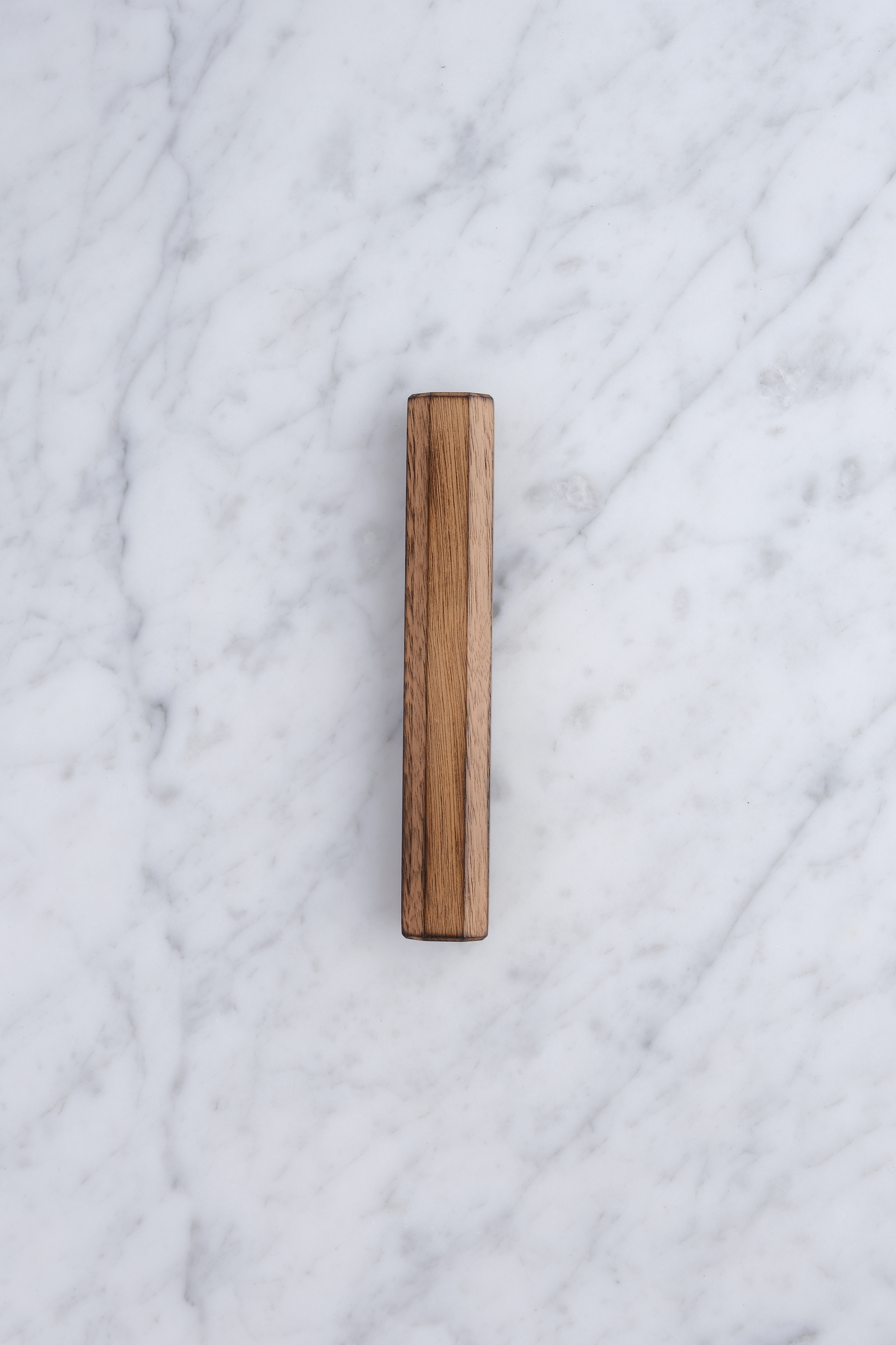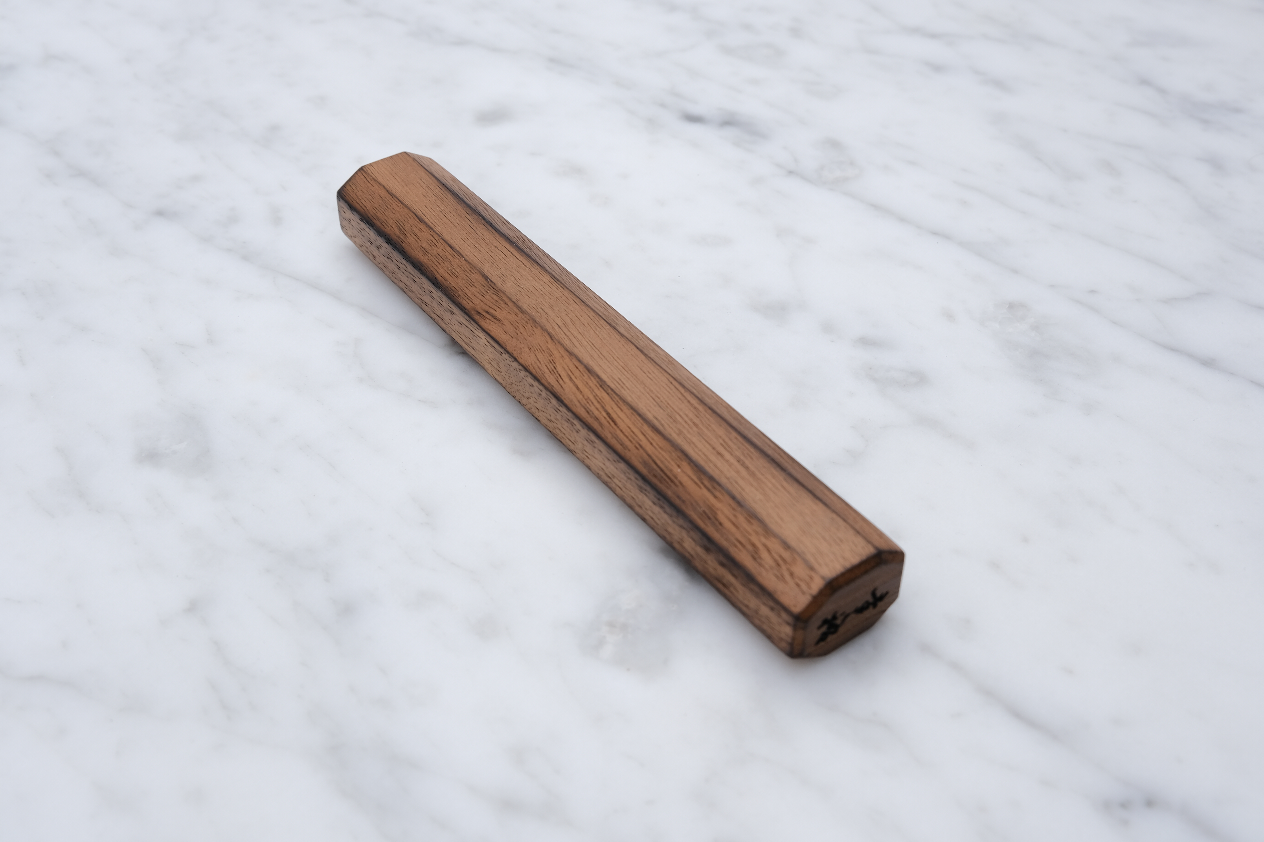 Dette skæfte er lavet i Valnød. Det er 8-kantet (WA) og er en smule smallere end andre klassiske WA-skæfter man måske er vant til. Skæftet mener vi, passer bedst til 150mm Petty/170mm Santoku/Honesuki