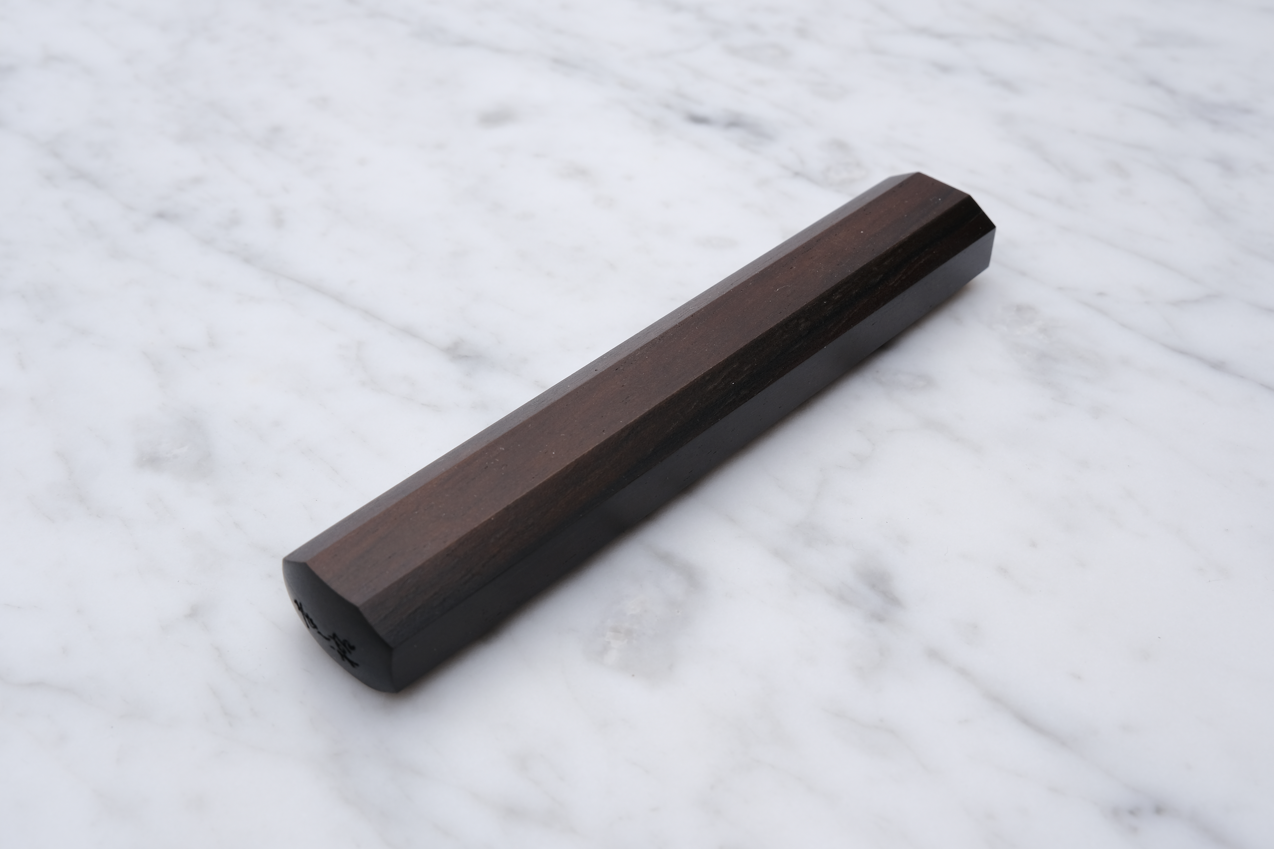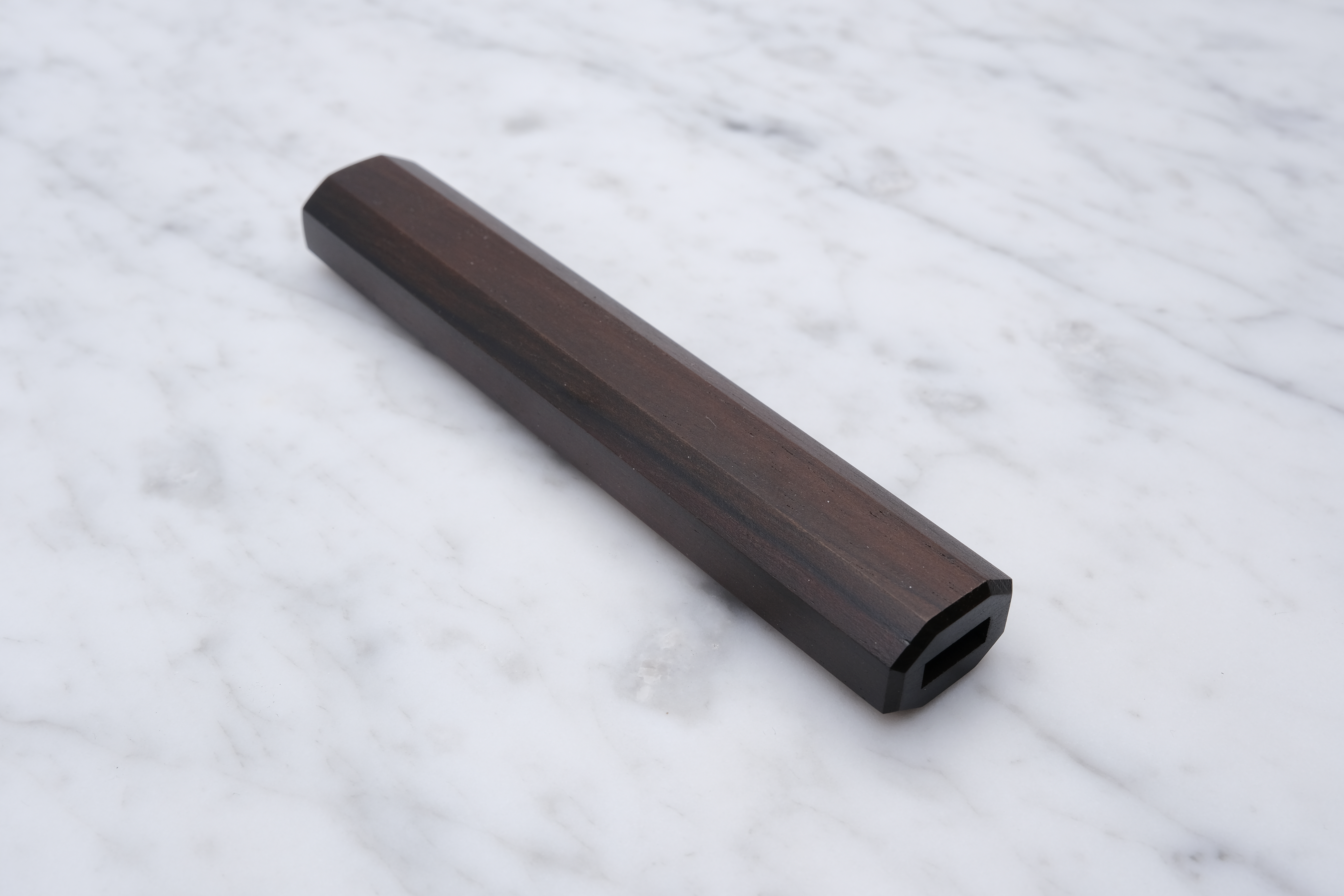 Dette skæfte er lavet i ibenholt. Det er 8-kantet (WA) og er en smule smallere end andre klassiske WA-skæfter man måske er vant til. Skæftet mener vi, passer bedst til 210mm Gyuto/240mm Gyuto/270mm Yanagiba/270 Sujihiki