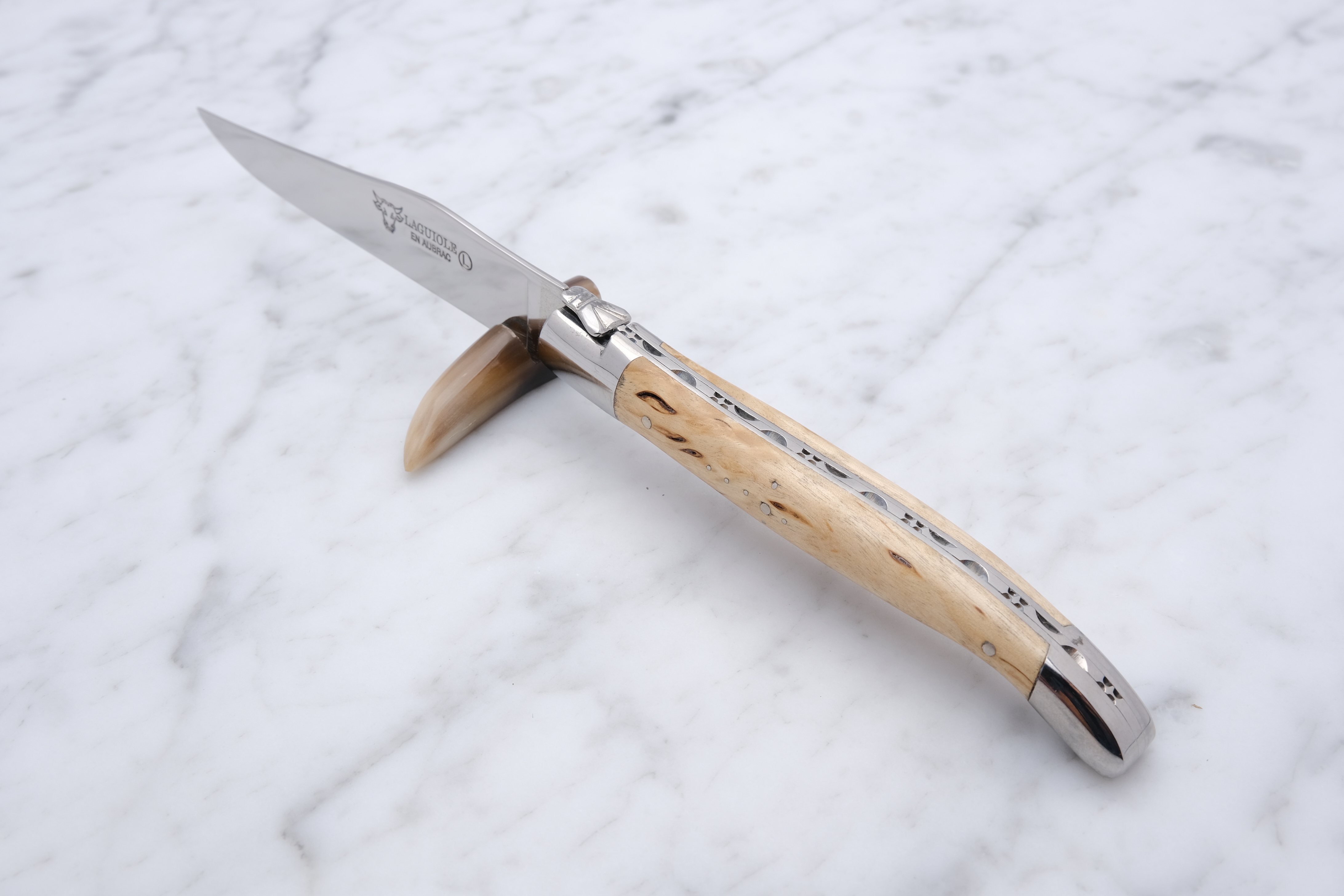 Knive fra Laguiole en Aubrac er fremstillet med naturmaterialer. Derfor vil den kniv du køber ikke nødvendigvis være fuldstændigt magen til den viste på billedet her.
