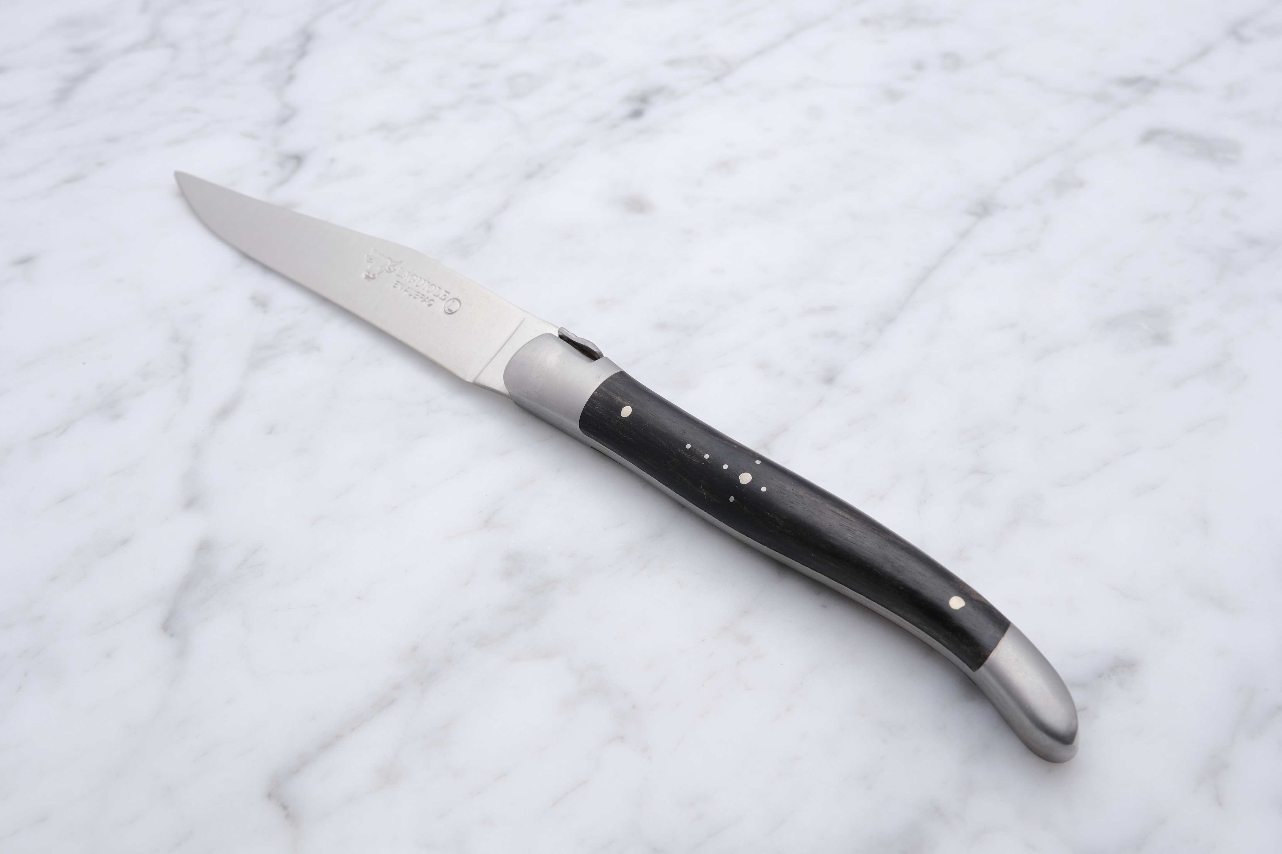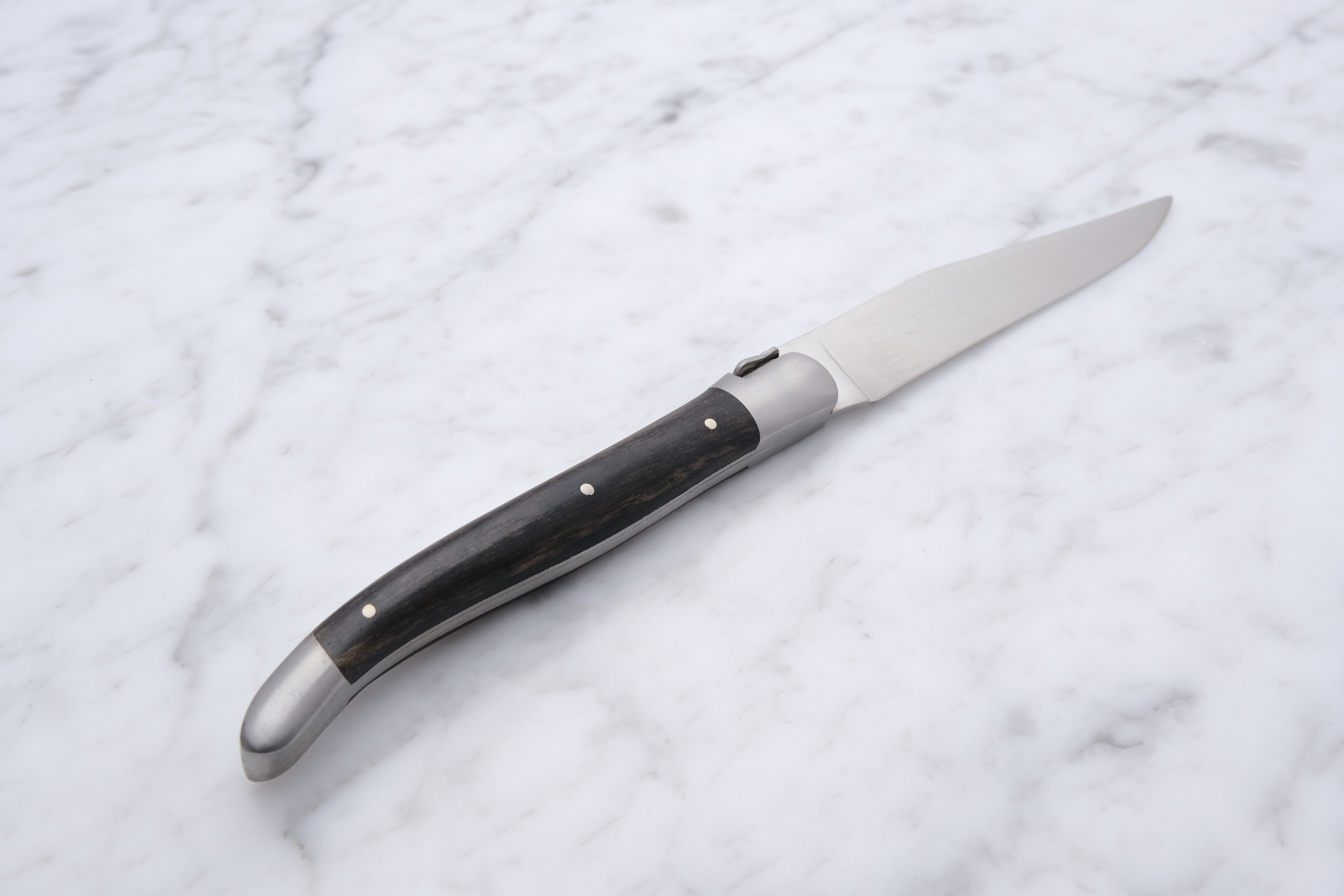 En Laguiole en Aubrac steakkniv har klinge i svensk 12C27 stål, som er en god rustfri legering. Den bliver fra værkstedet slebet til en fin æg, og er let igen at slibe op, når behovet melder sig, hvilket vi gerne hjælper dig med.