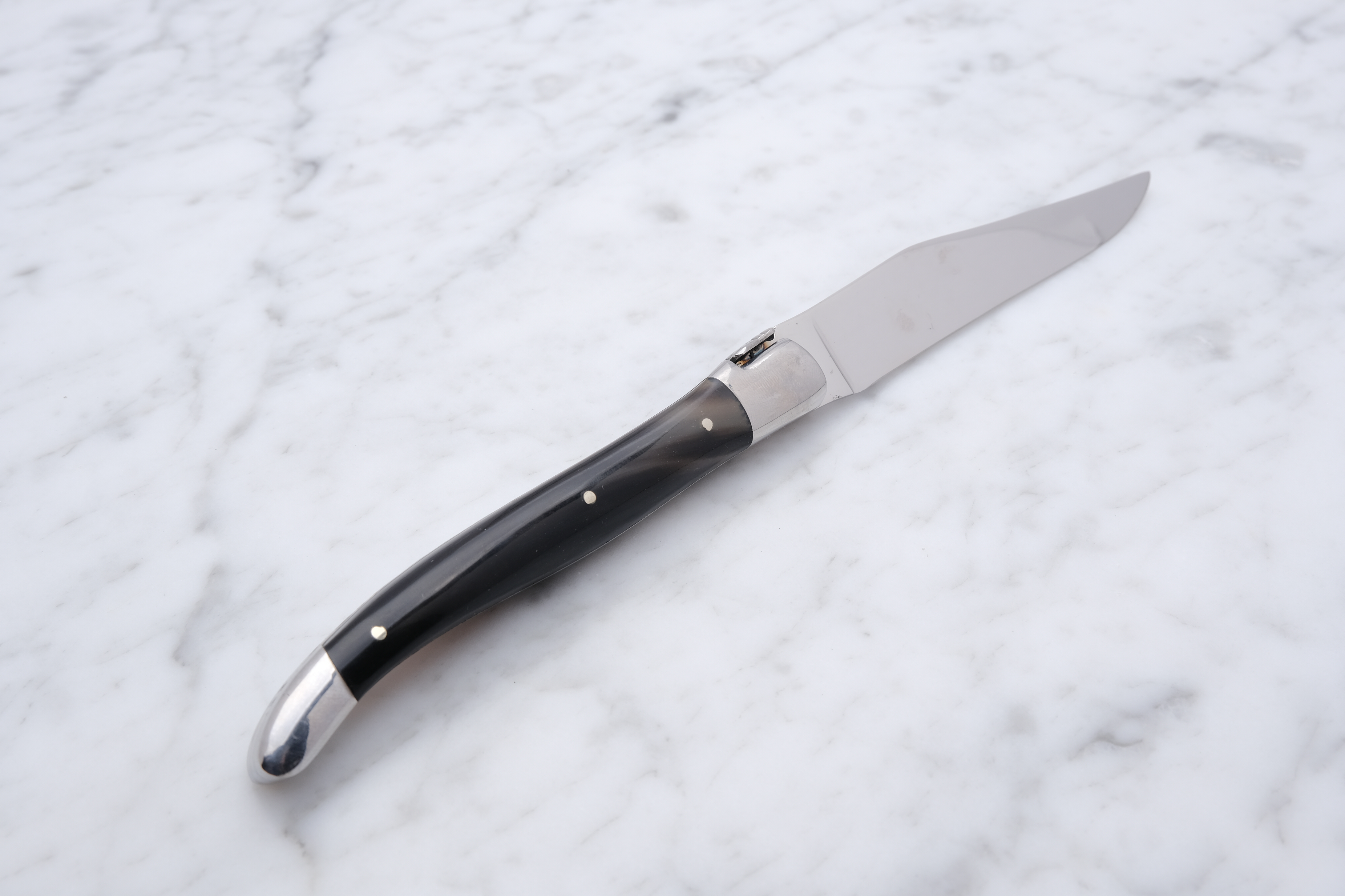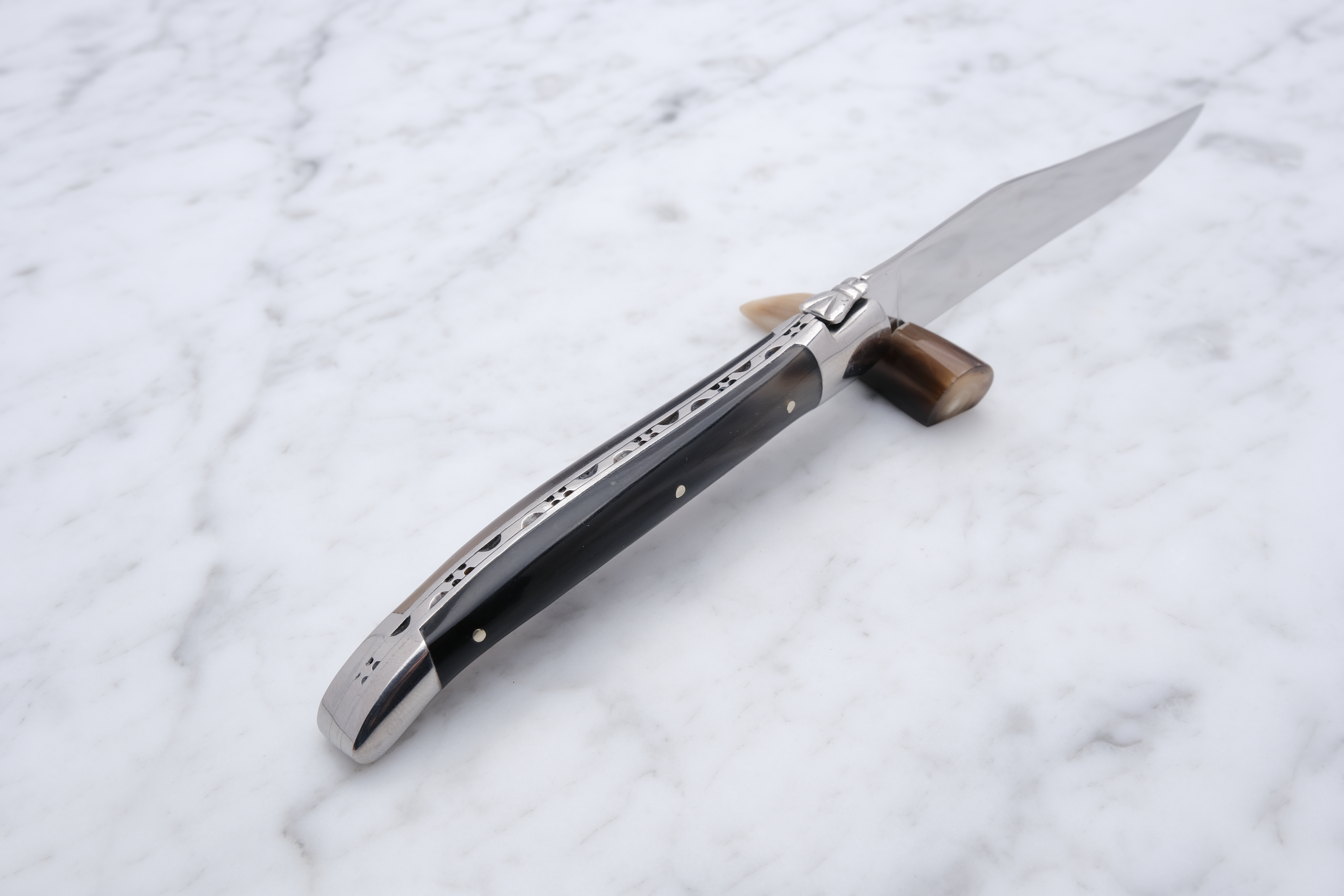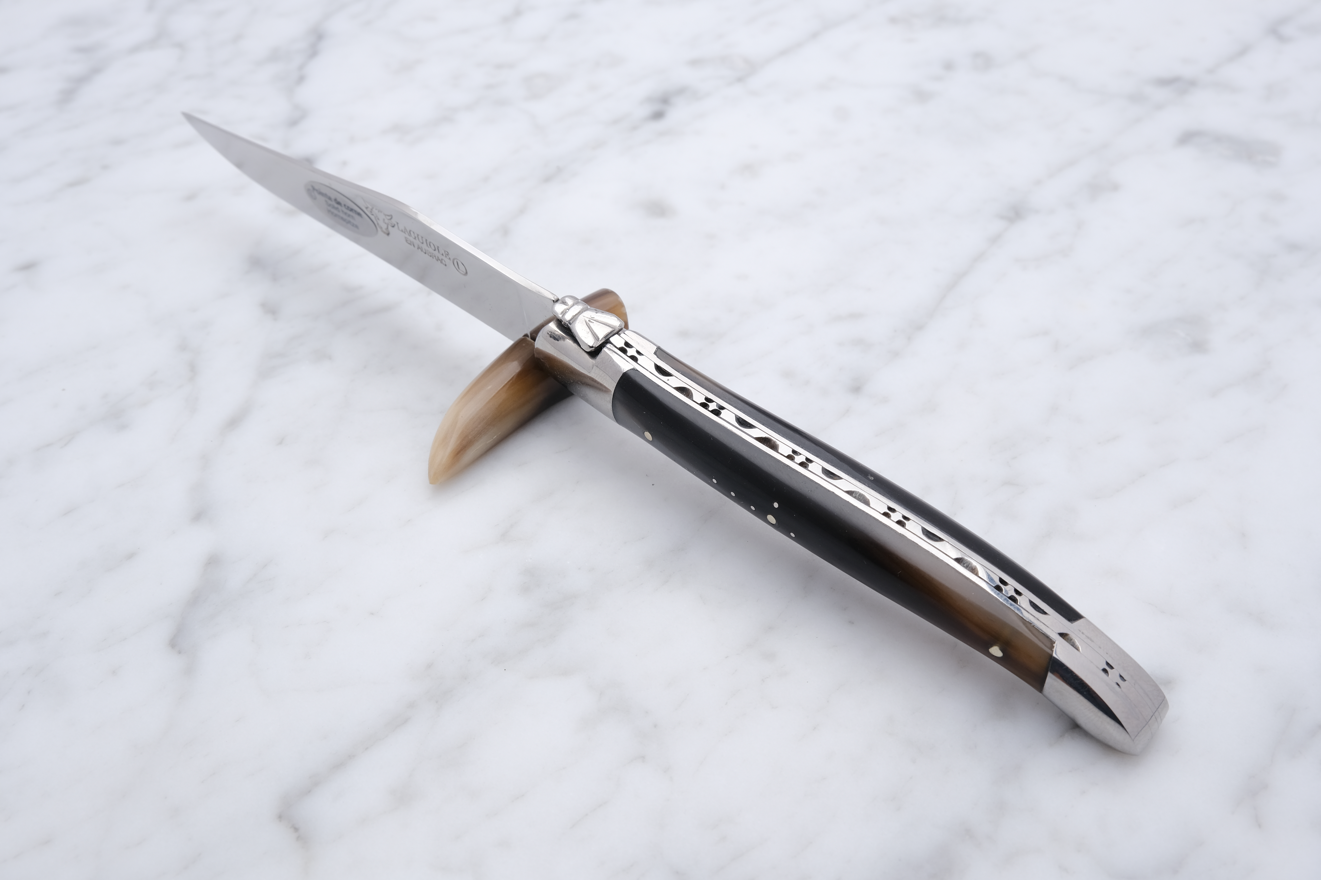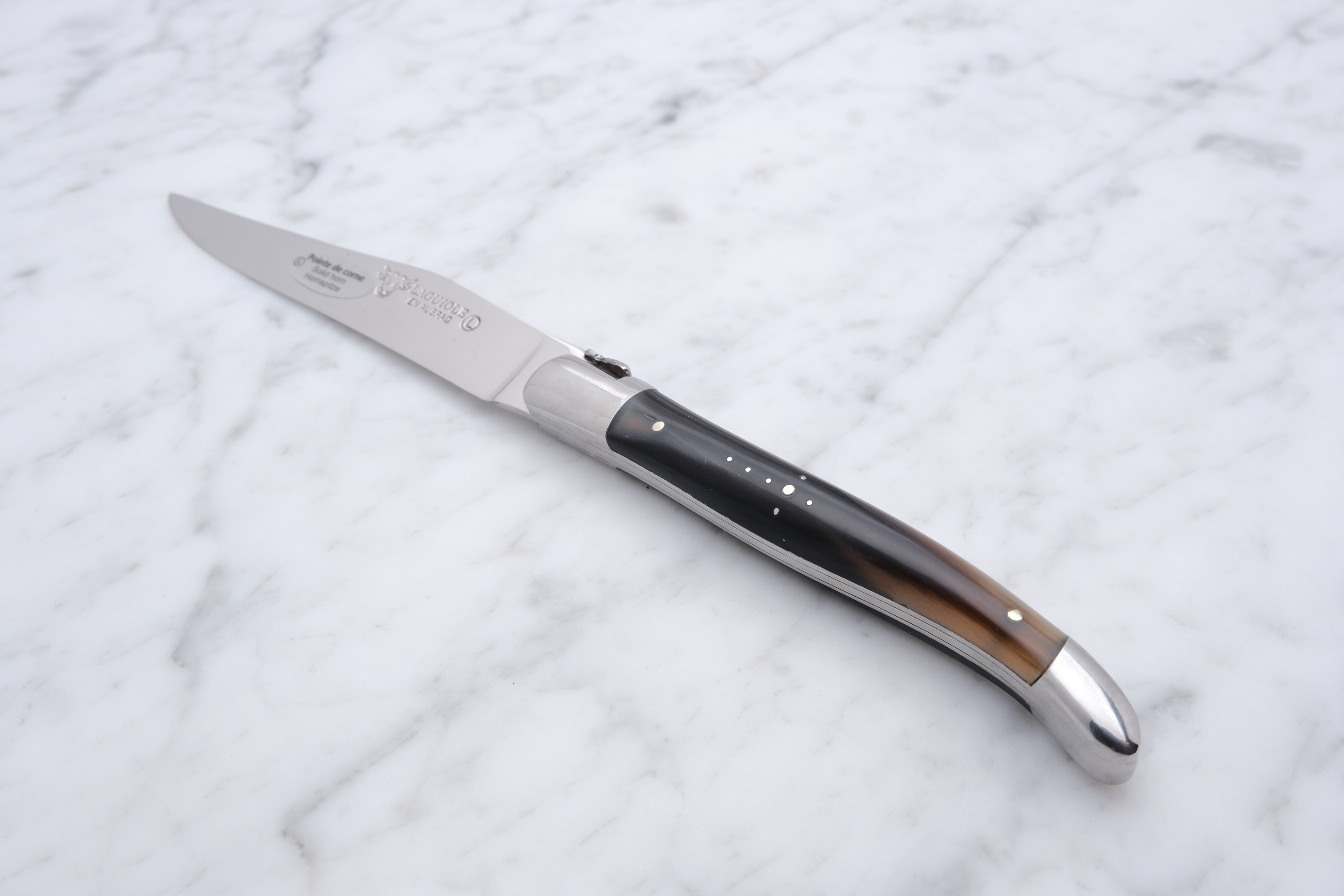 Denne steakkniv har et skæfte af point de corne, som er spidsen af koens horn. Det er en af de absolut mest kendte modeller, idet horn fra køer er et materiale, der direkte kommer fra Aubrac. Aubrac er et bjergrigt område, som derfor er besværligt at plante afgrøder, og derfor har slagtekvæg været en central del af landbruget i området. Derfor har der også været en naturlig forsyning af horn direkte i Laguiole, og det gør netop knivene i point de corne særligt autentiske.