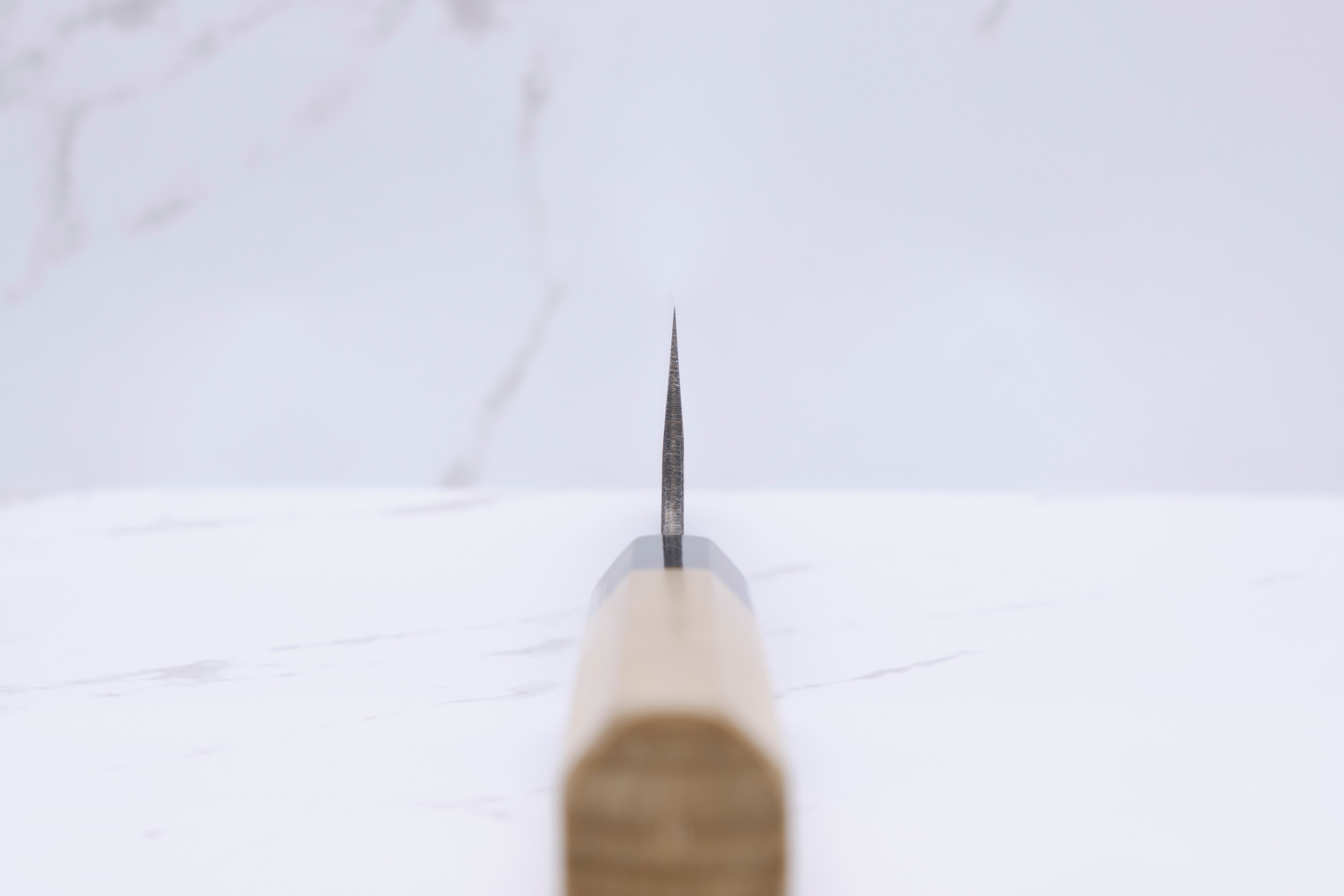 Den har en meget flot og rustik kurouchi finish på toppen af klingen, og længere nede starter et meget flot grind, som gør at kniven bliver meget tynd bag æggen, og derfor har en fantastisk skæreevne.