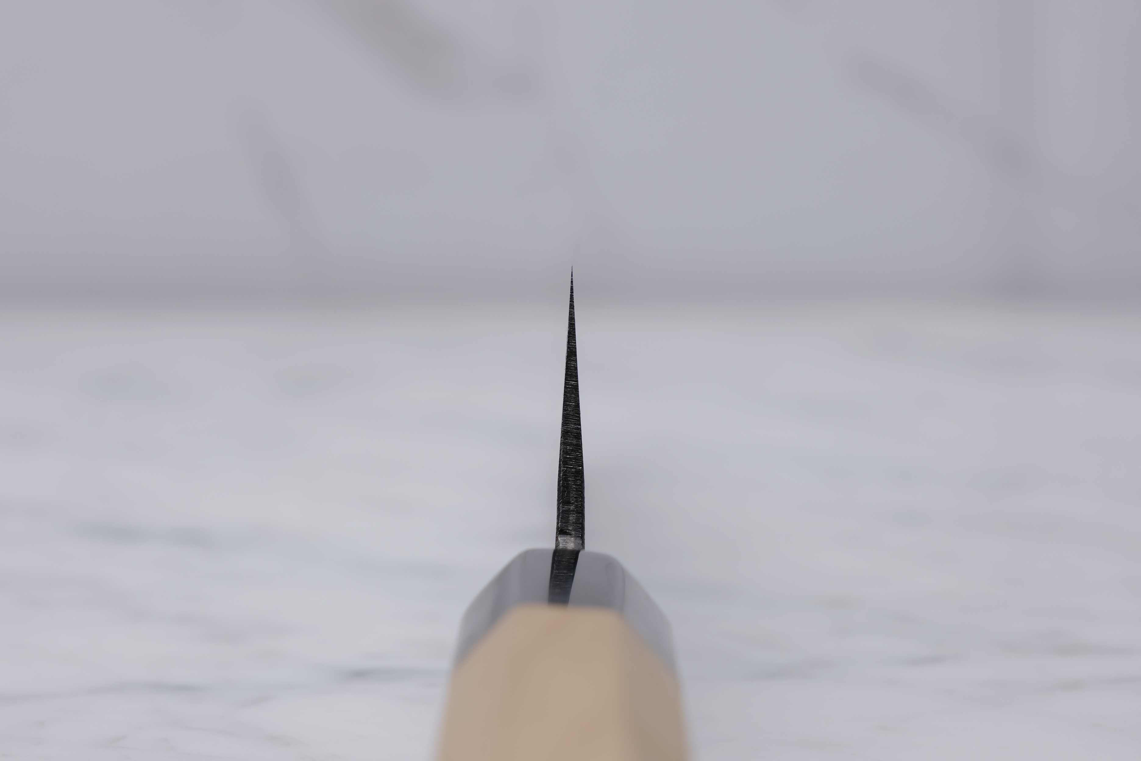 Den har en meget flot og rustik kurouchi finish på toppen af klingen, og længere nede starter et meget flot grind, som gør at kniven bliver meget tynd bag æggen, og derfor har en fantastisk skæreevne.