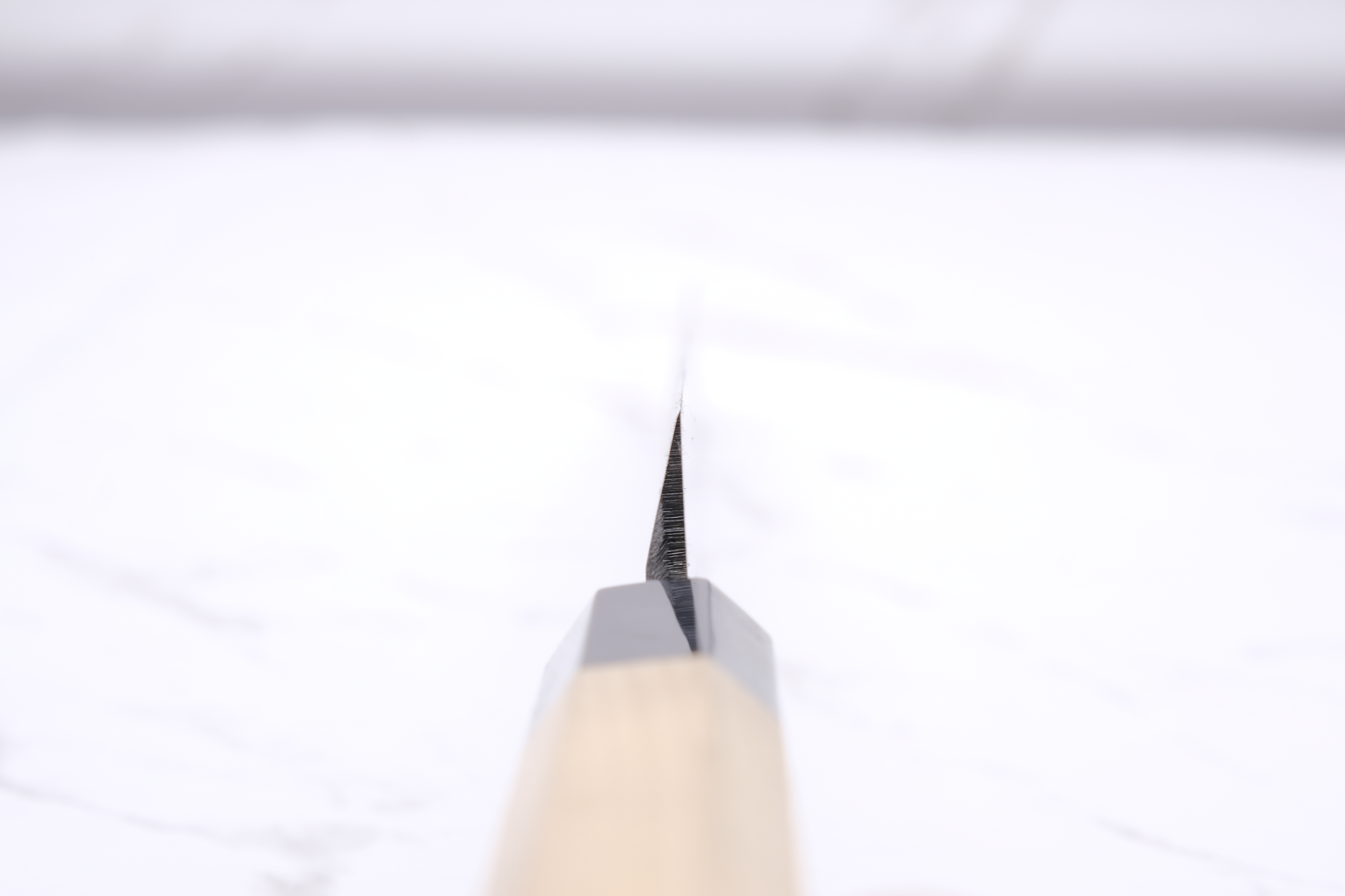 Den har en meget flot og rustik kurouchi finish på toppen af klingen, og længere nede starter et meget flot grind, som gør at kniven bliver meget tynd bag æggen, og derfor har en fantastisk skæreevne.