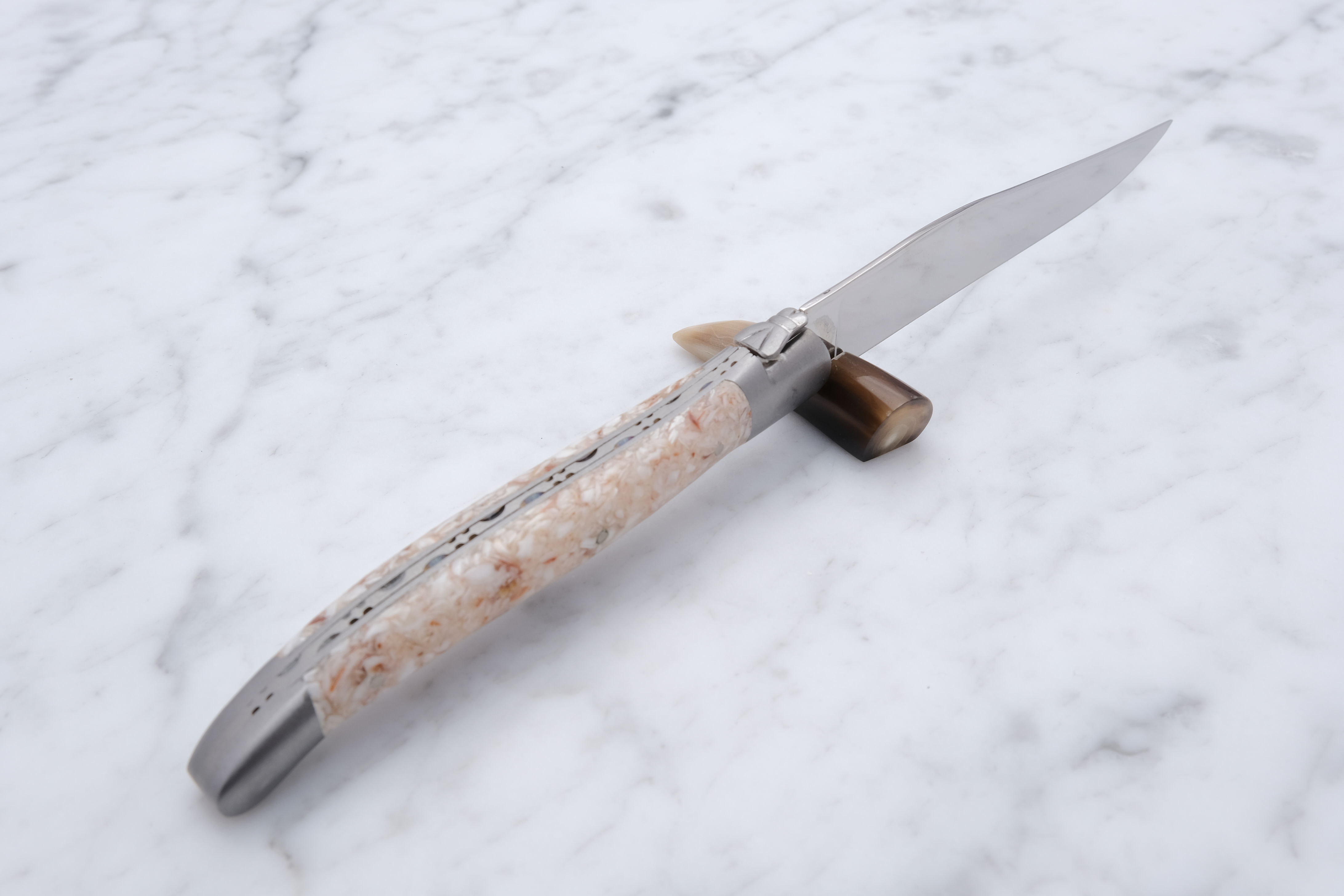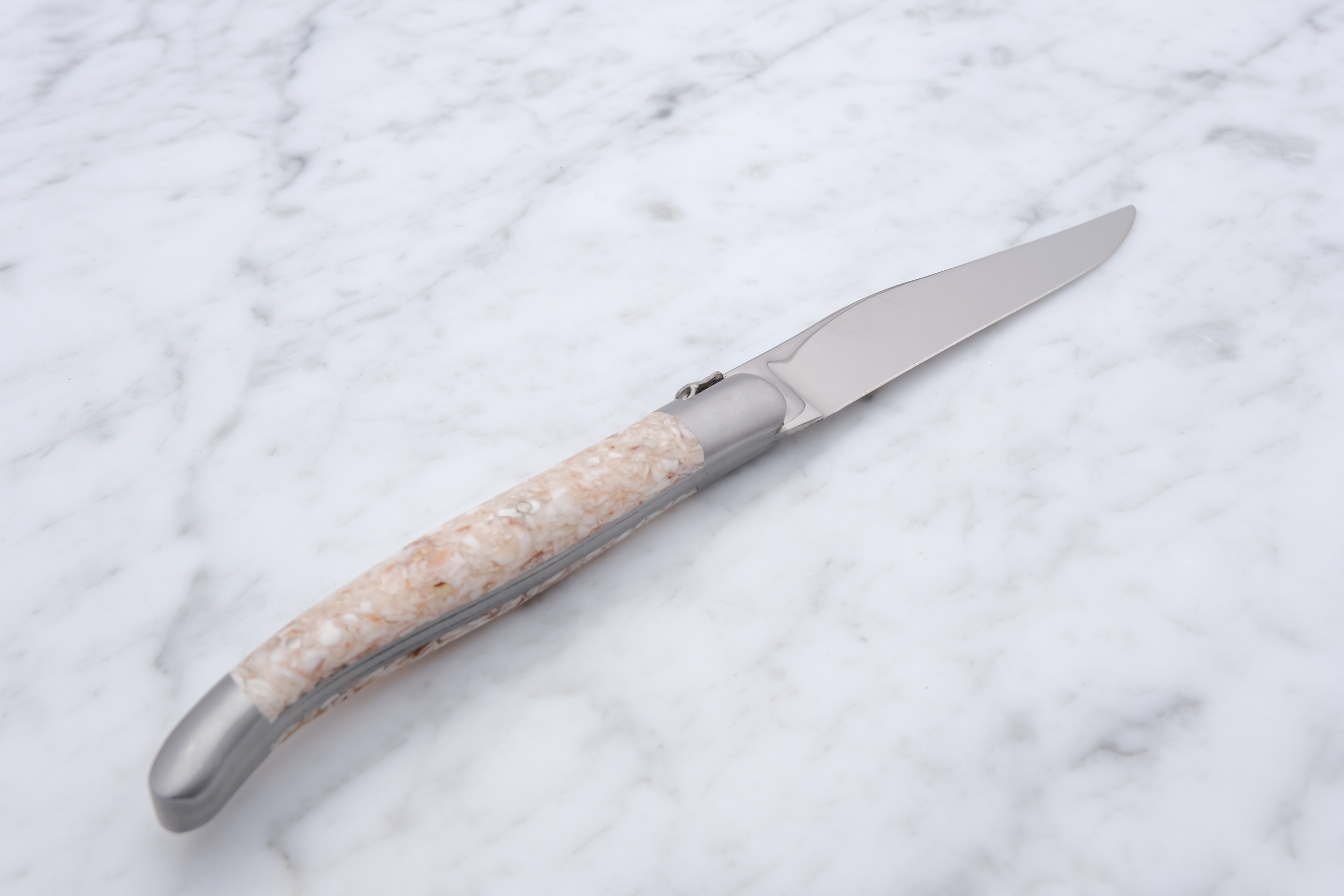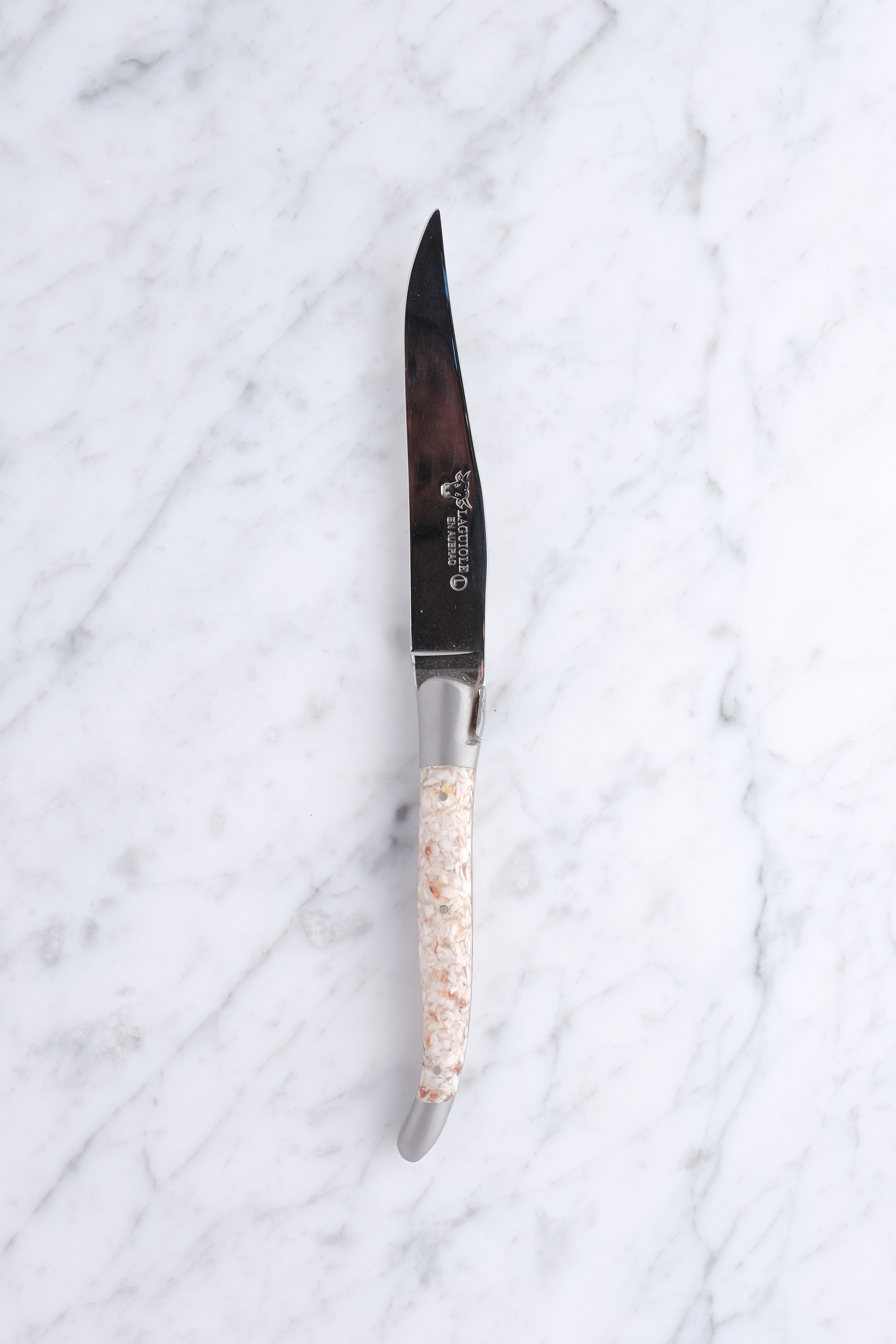 Blankpoleret steakkniv med skæfte af knuste stabiliserede kammuslingsskaller.