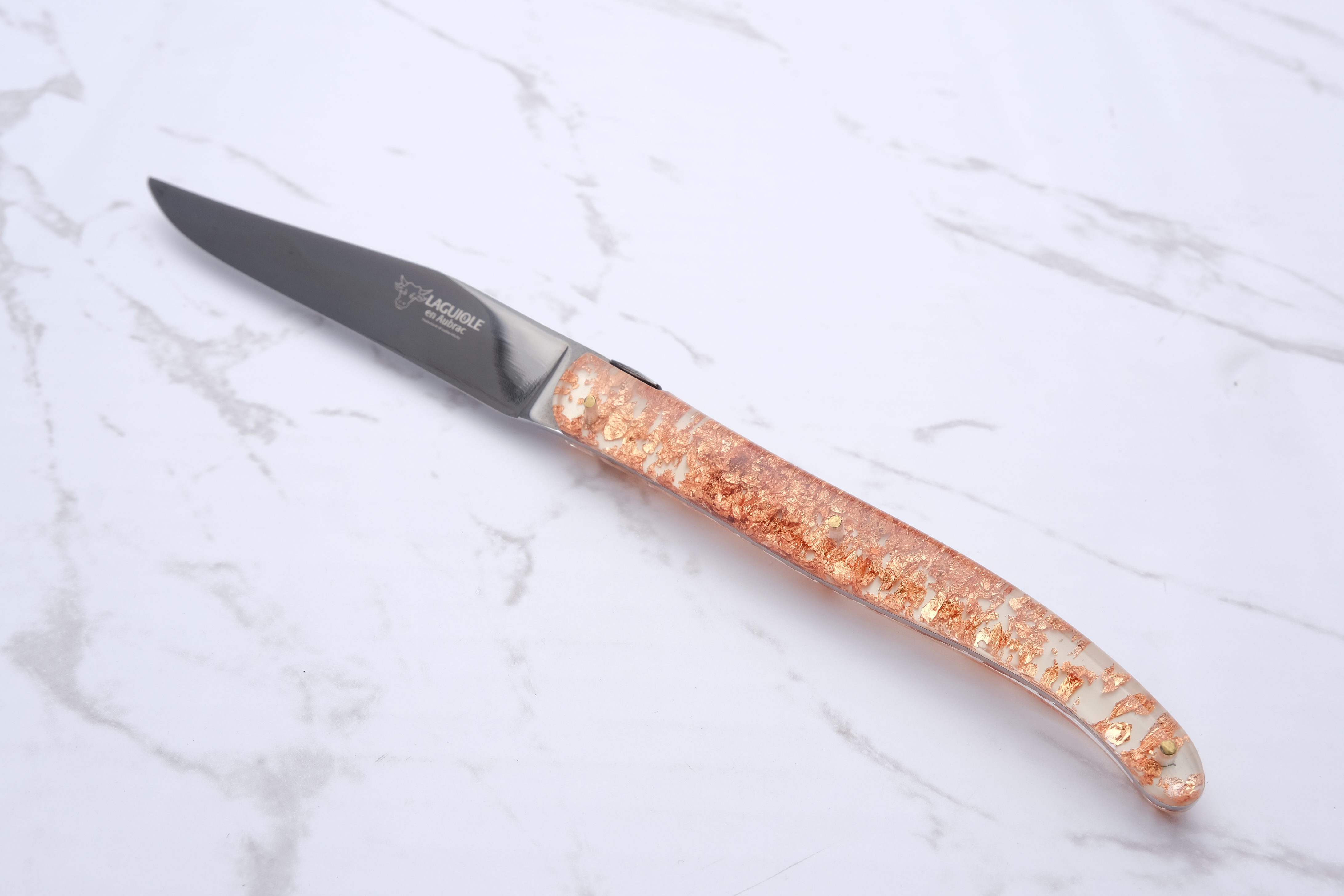 Blankpoleret steakkniv med skæfte af resin med kobberflager i og titaniumsbelagt blad.