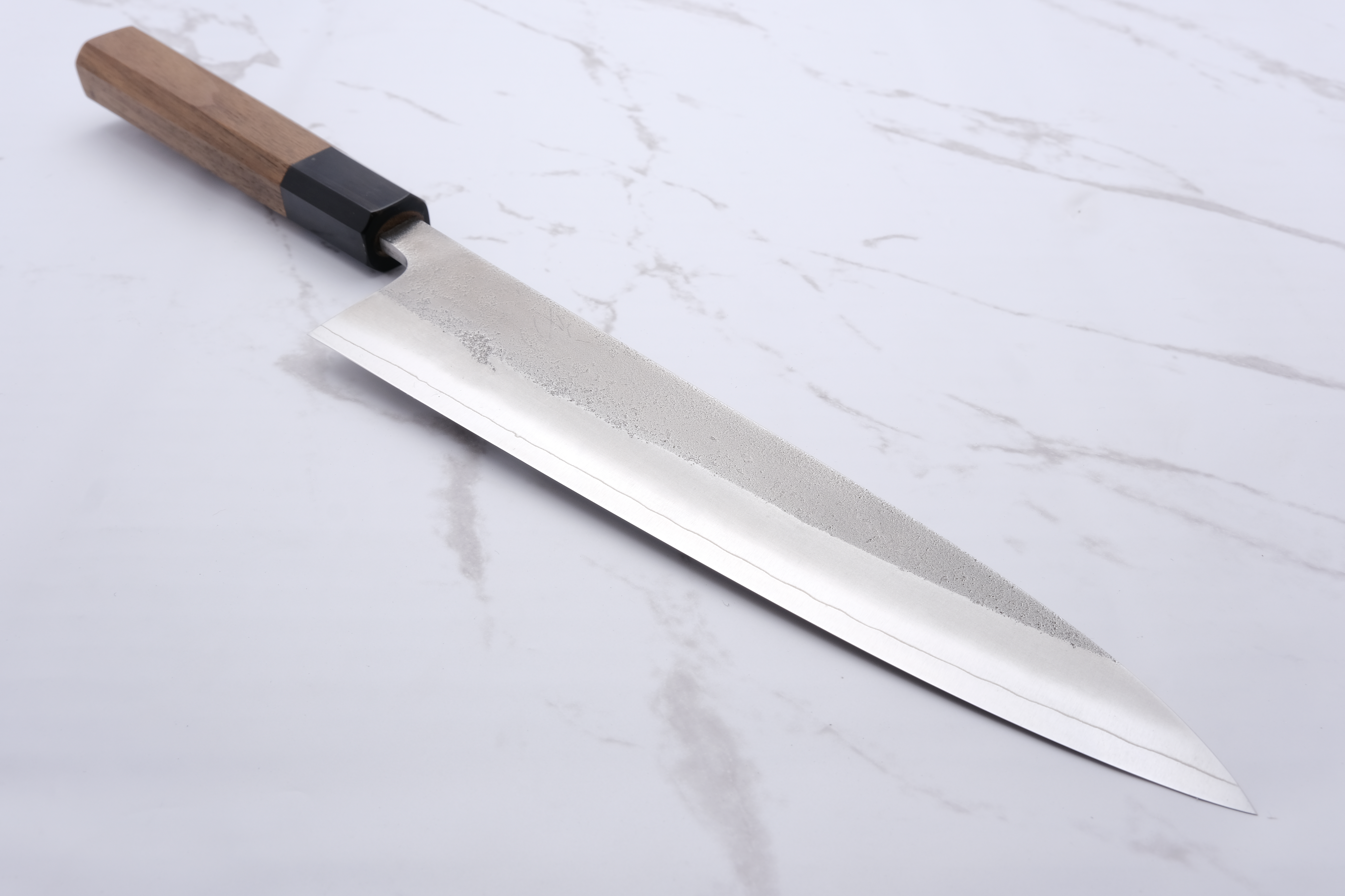 Kniven tåler som alle andre gode japanske knive ikke maskinopvask, og idet klingen ikke er helt rustfri anbefaler vi at du er meget opmærksom på at få skyllet og tørret klingen af meget hurtigt efter du har skåret med den, da den ellers vil begynde at oxidere.