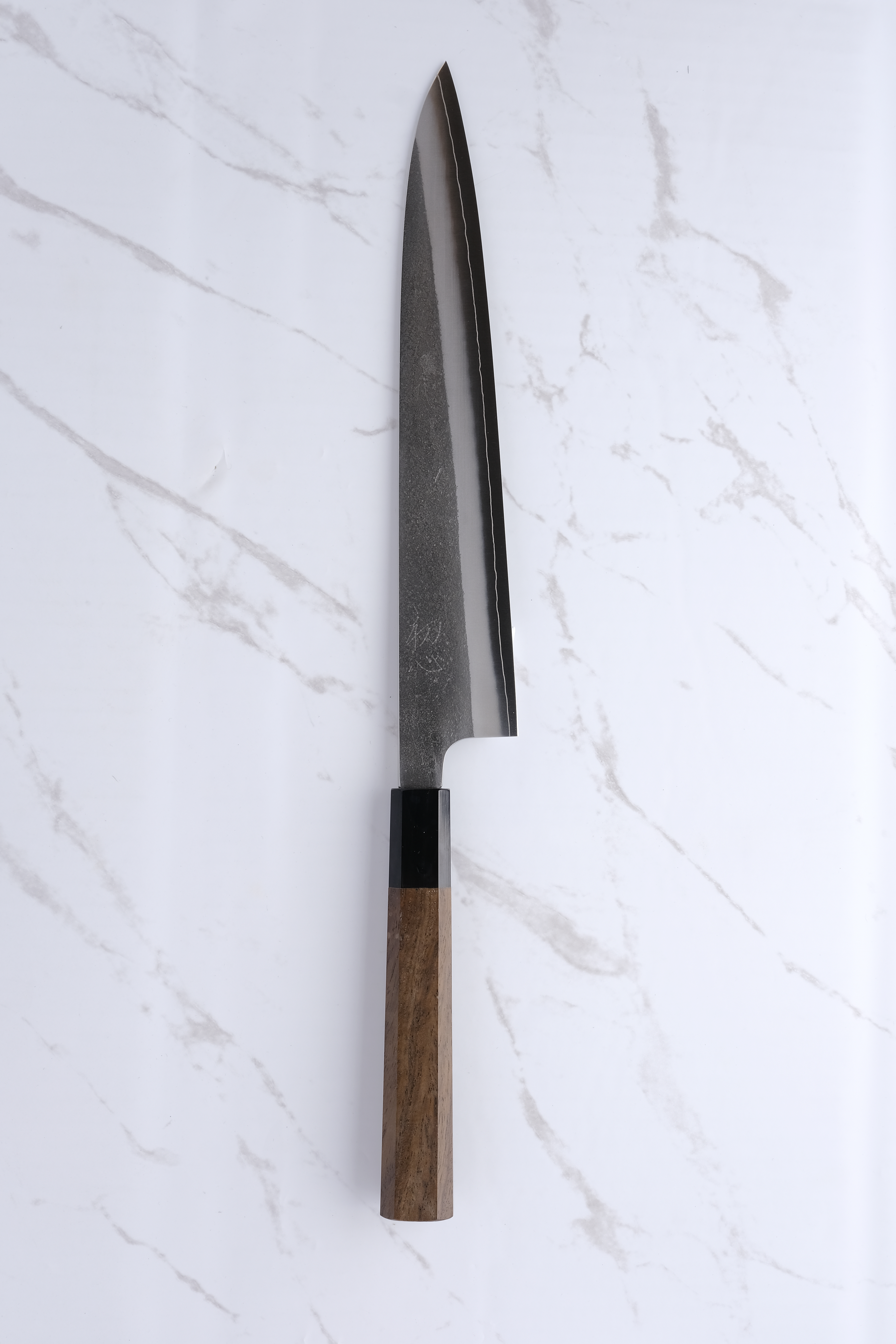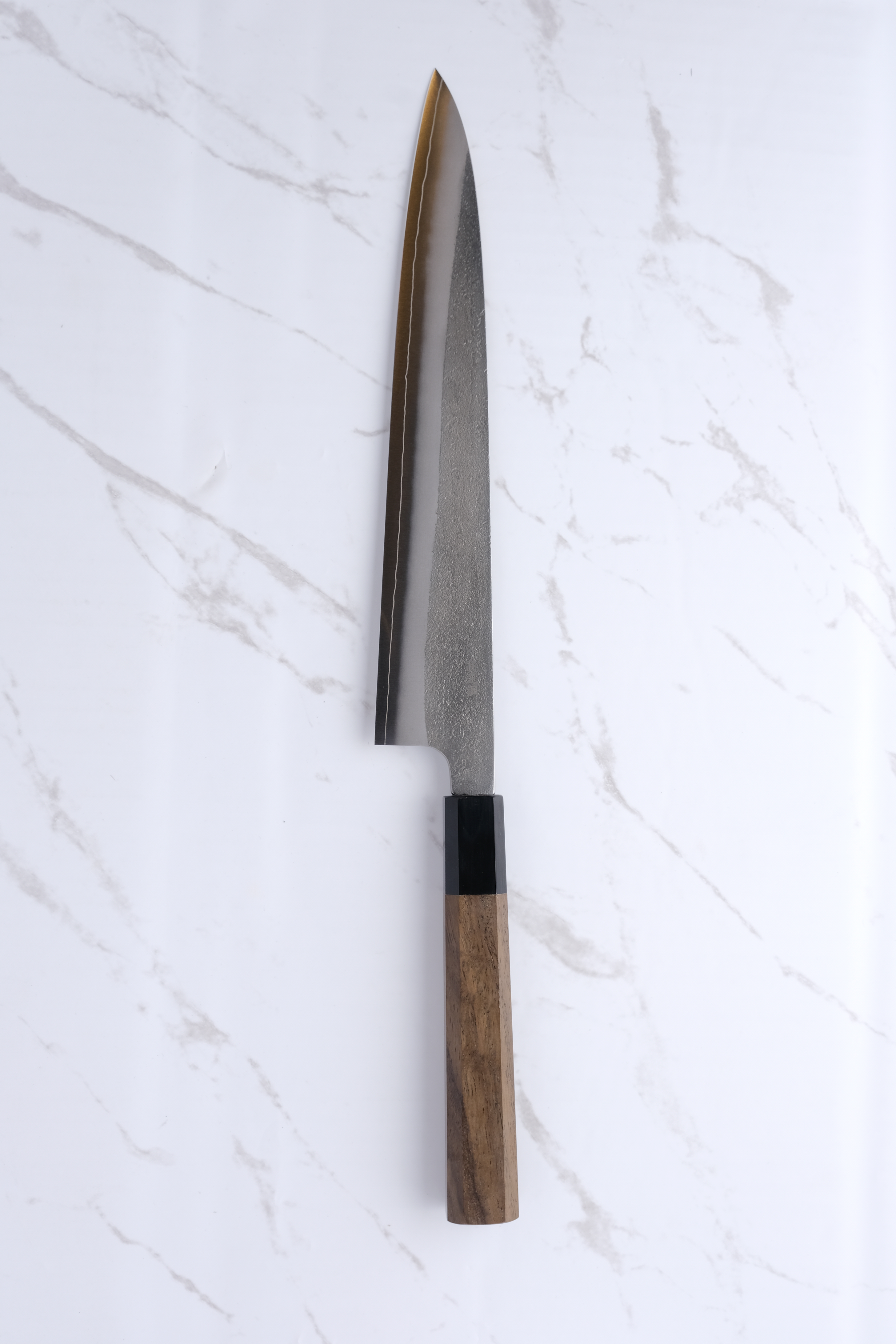Yoshikane Hamono er et anerkendt japansk værksted beliggende i Sanjo, Niigata, med over 100 års erfaring i at skabe exceptionelle knive. Under ledelse af Kazuomi Yamamoto producerer de nogle af de skarpeste og mest holdbare knive på markedet. Denne 240mm Sujihiki kniv er designet til præcise snit og er ideel til at skære kød og fisk med lethed.
