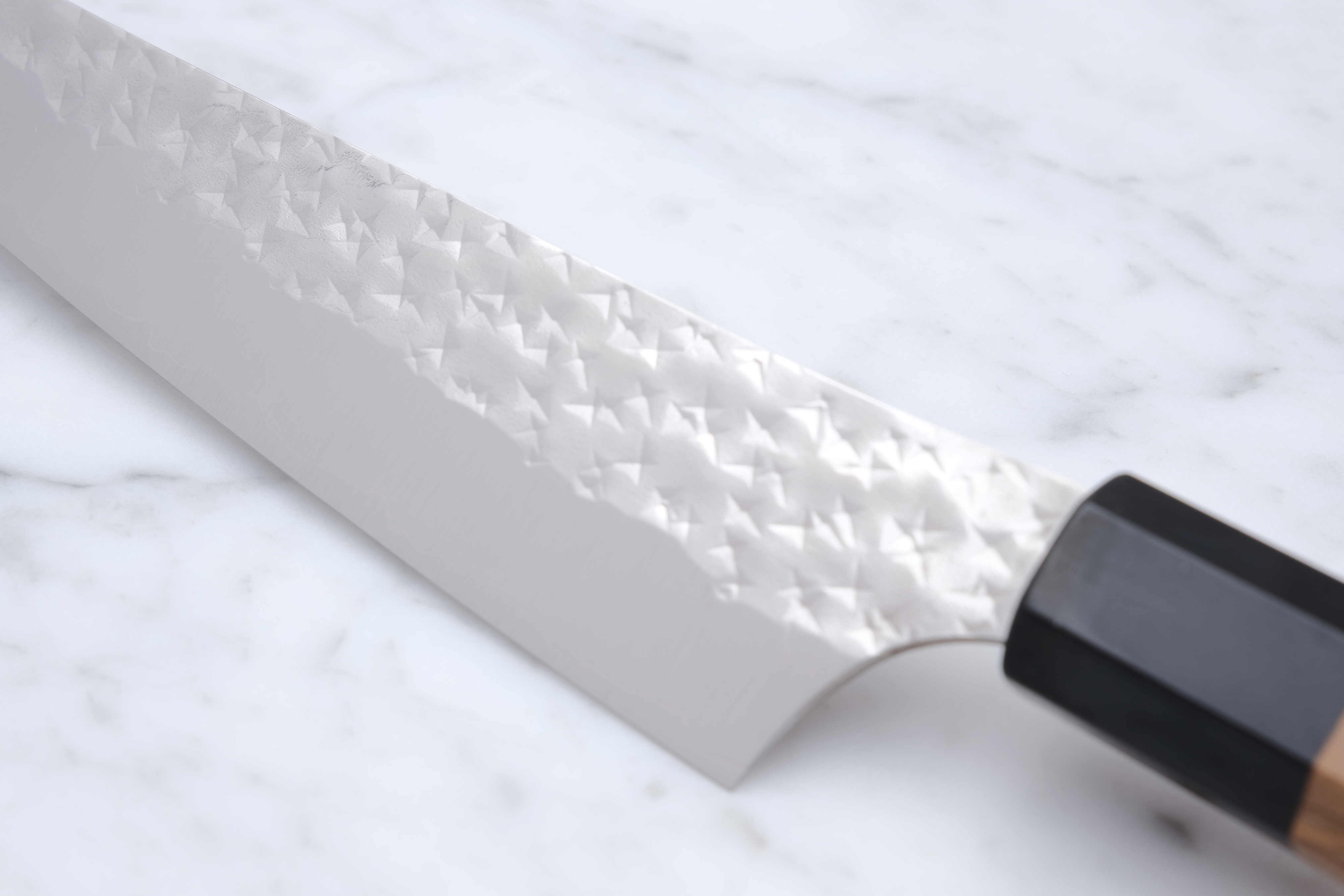 Yu Kurosaki 150mm Petty Senko Ei SG2 er en bemærkelsesværdig kniv fra den anerkendte smedje Yu Kurosaki i Takefu Knife Village, Japan. Denne kniv kombinerer enestående håndværk med innovative designs, hvilket gør den til et must-have for både professionelle kokke og madentusiaster. Med sin 150mm længde er den ideel til præcisionsskæring af grøntsager, frugt og mindre stykker kød. Den er fremstillet af SG2 pulverstål, som sikrer en skarphed og holdbarhed, der er svær at matche.